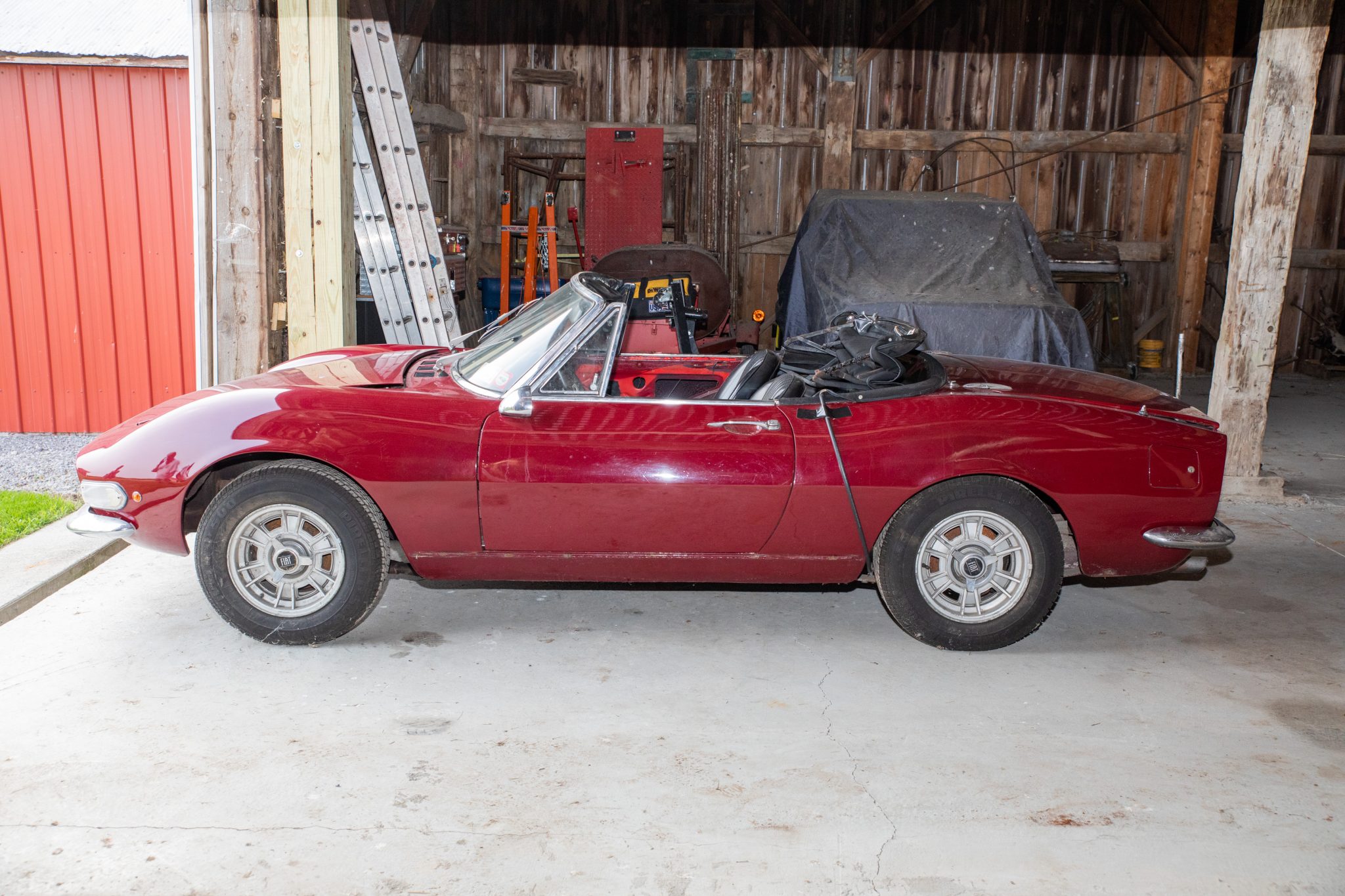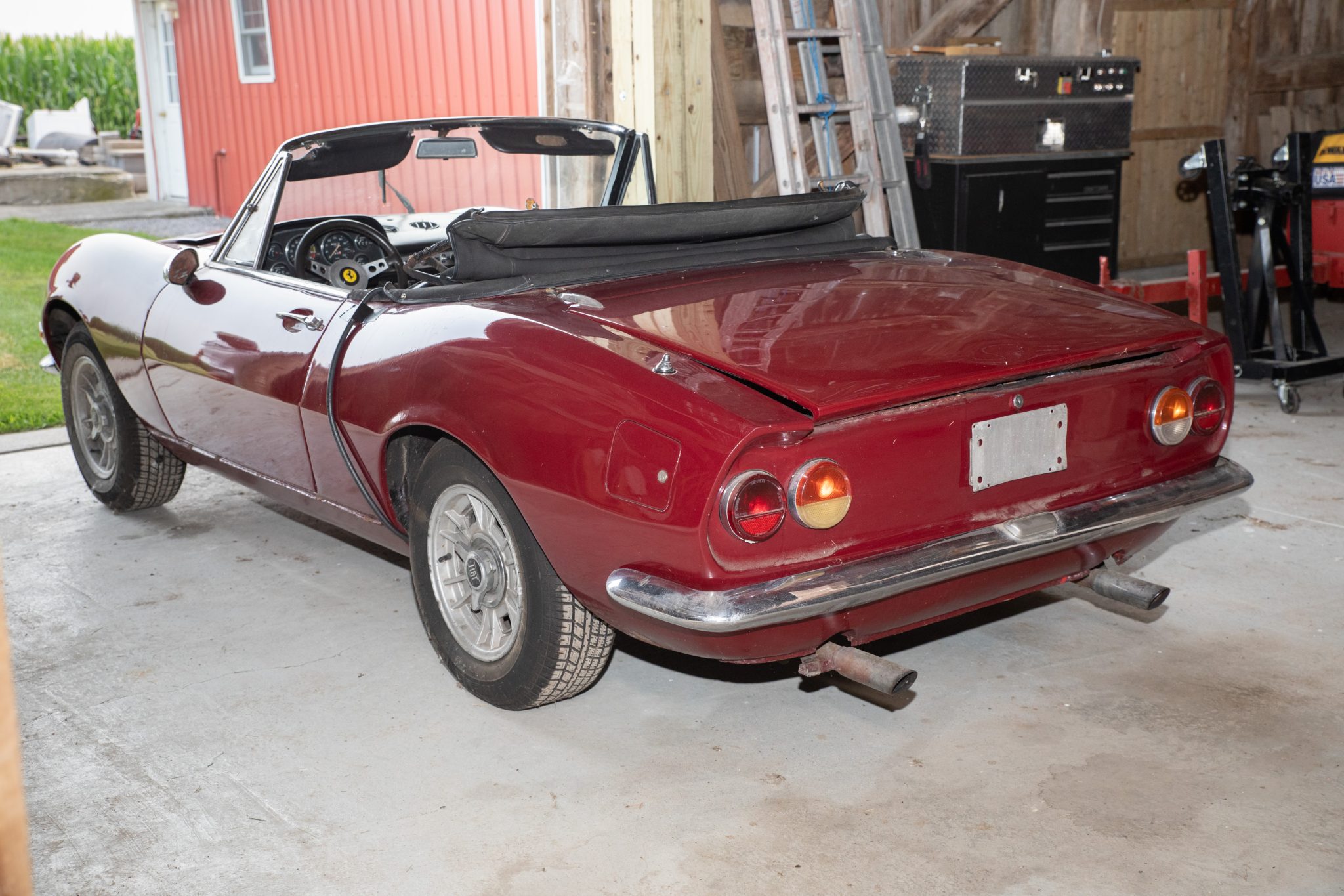 Cromodora 14” wheels are secured with three-eared knock-offs and are mounted with 195/70 Pirelli P 500 tires. The suspension is comprised of coil-sprung control arms at the front and a leaf-sprung live rear axle with quad shock absorbers at the rear. The car is also equipped with four-wheel disc brakes. The wheels are scratched and the knock-offs display corrosion.