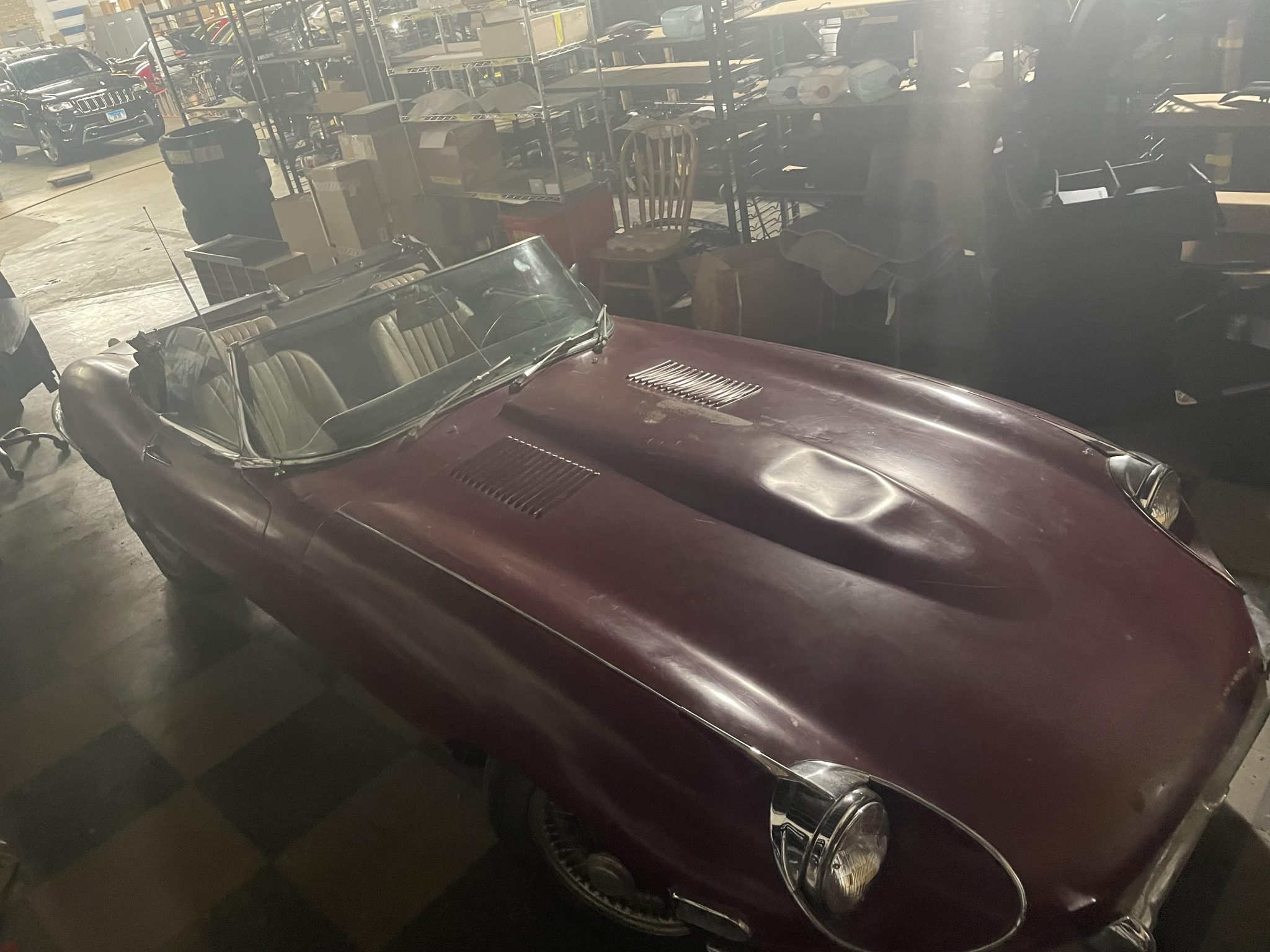 The 15” wire wheels are mounted on knock-off hubs. The car has independent suspension and four-wheel disc brakes with inboard-mounted rear components.