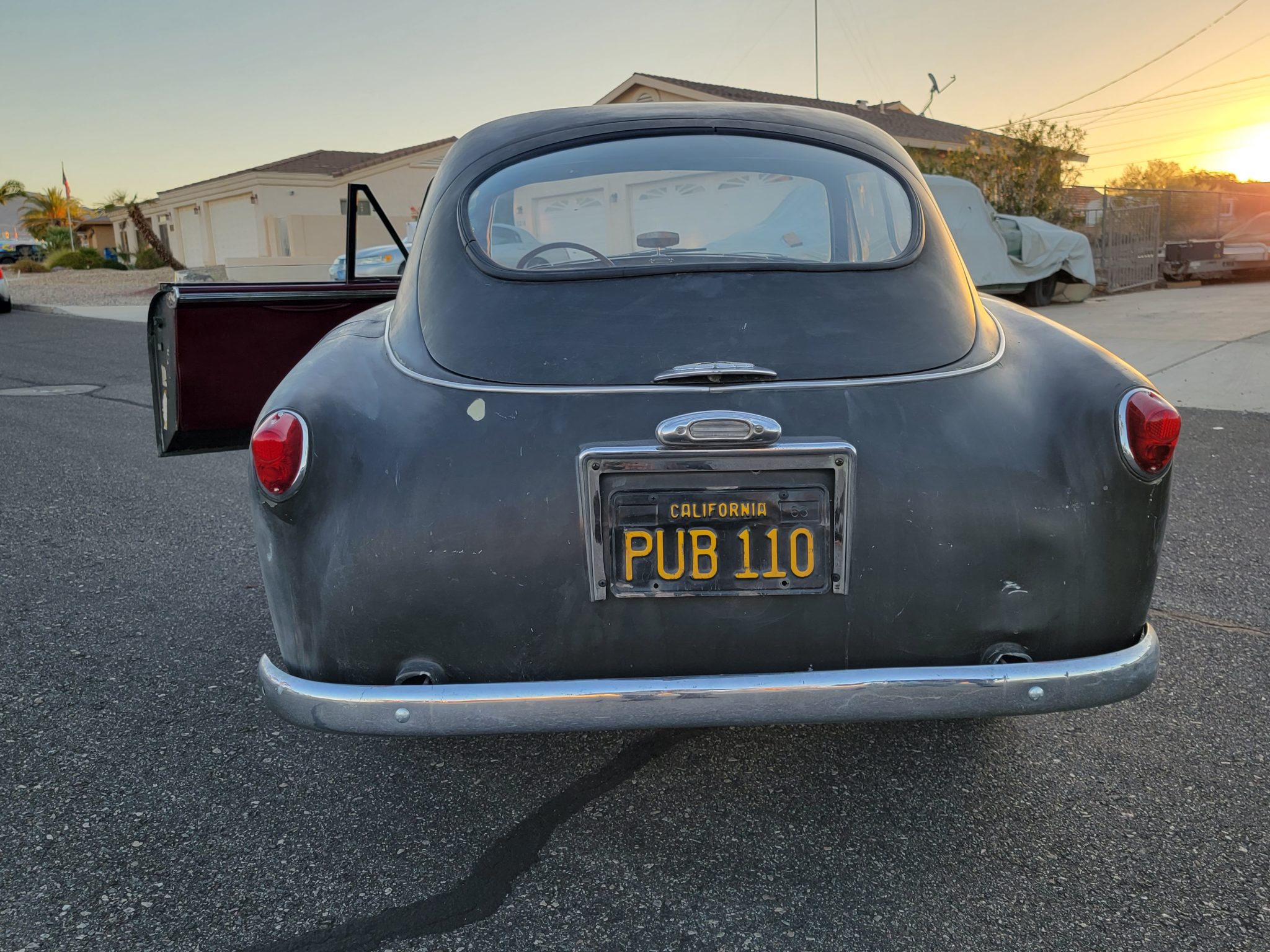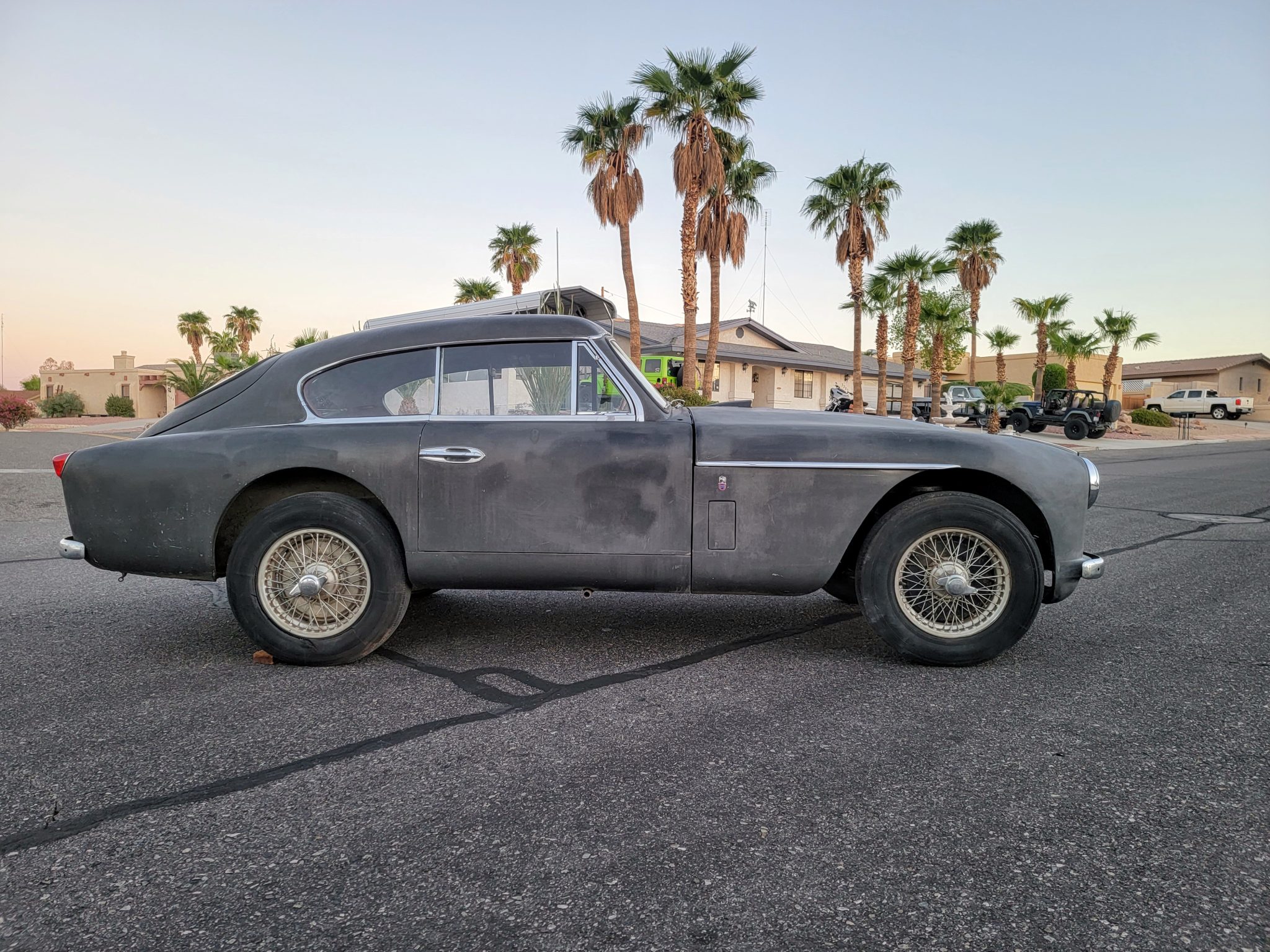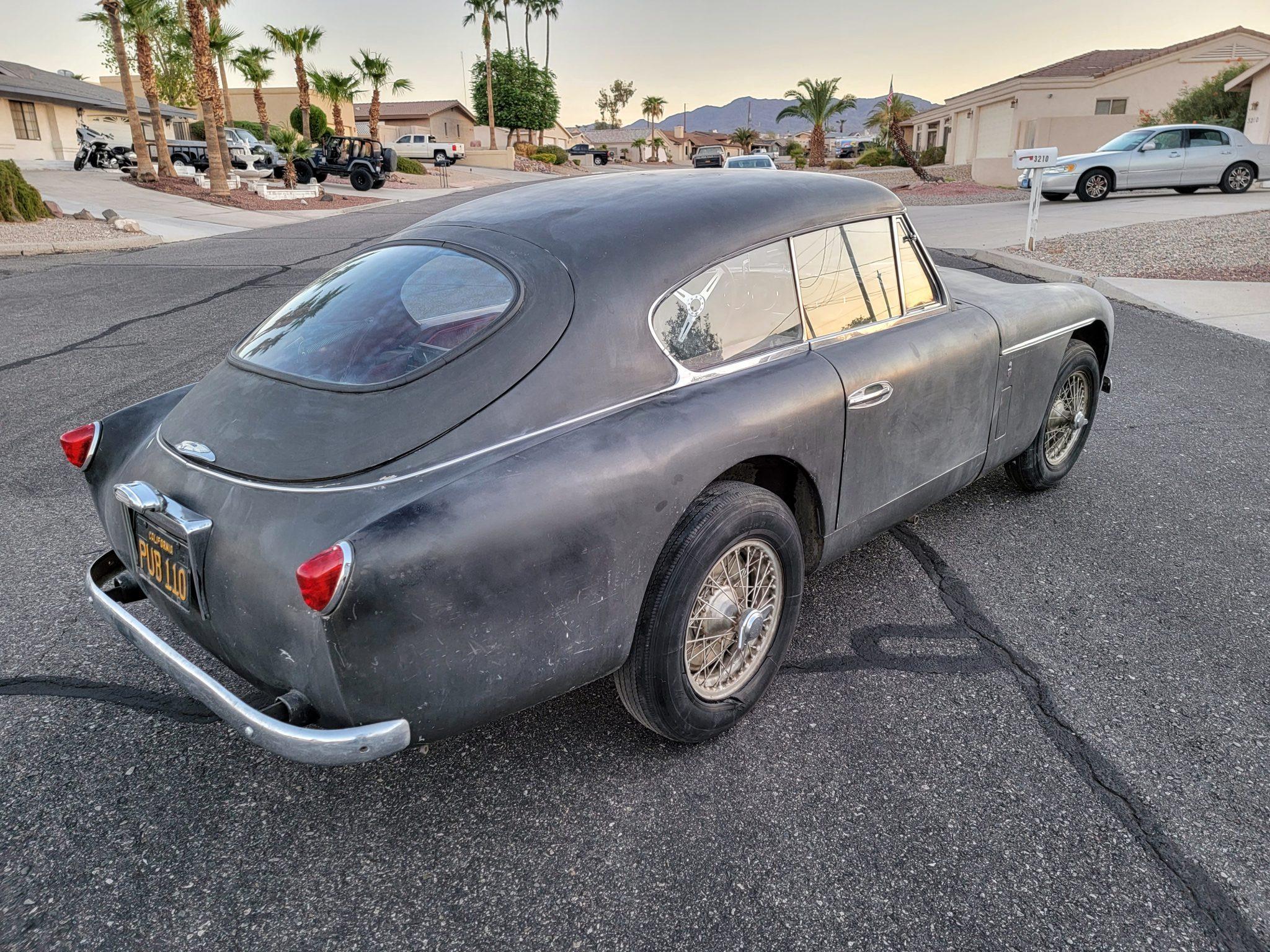 Silver-finished 16″ wire wheels are mounted with older Michelin tires that the seller recommends replacing. The car is equipped with independent front suspension and a solid rear axle as well as coil springs and drum brakes at each corner.