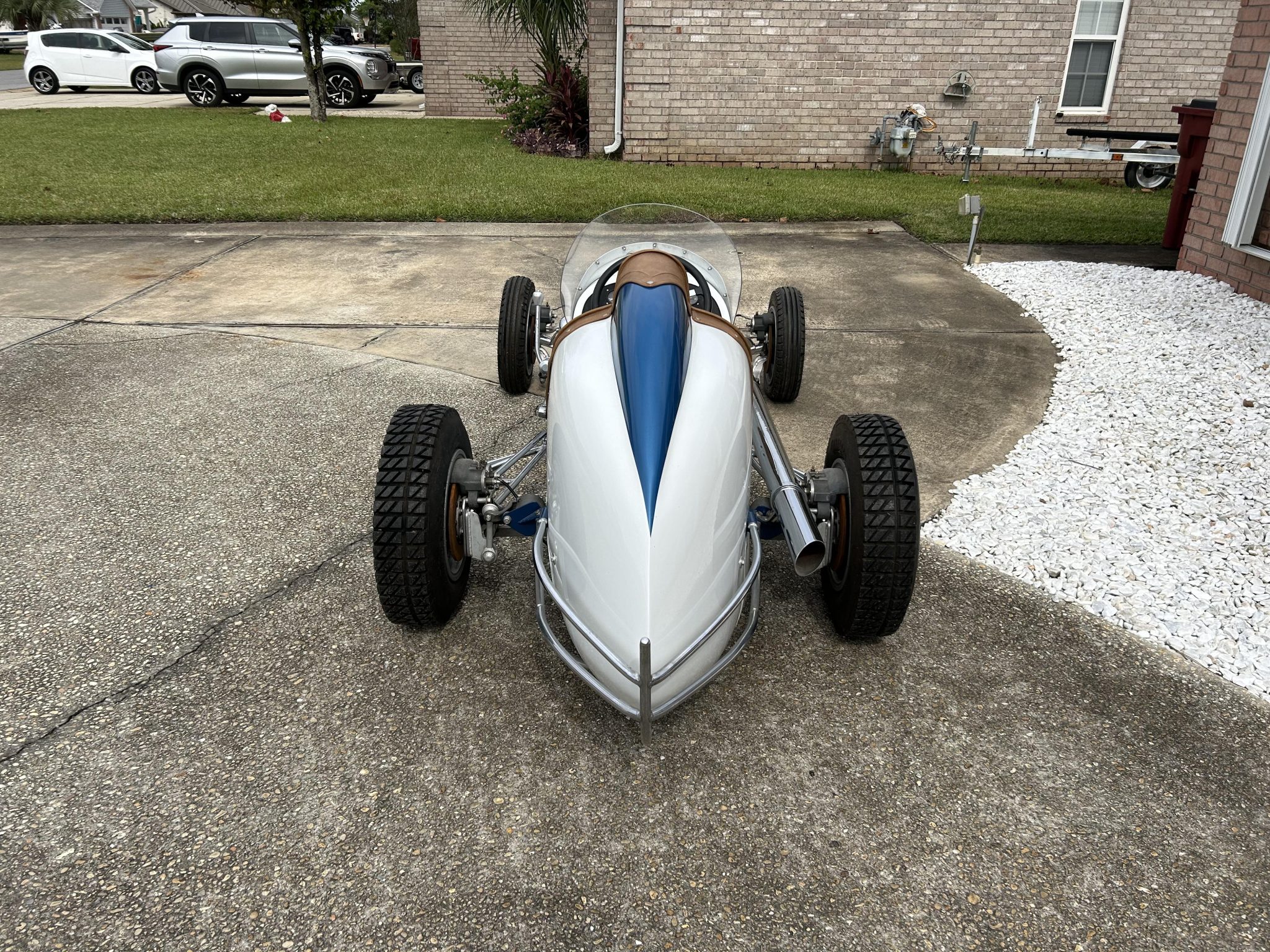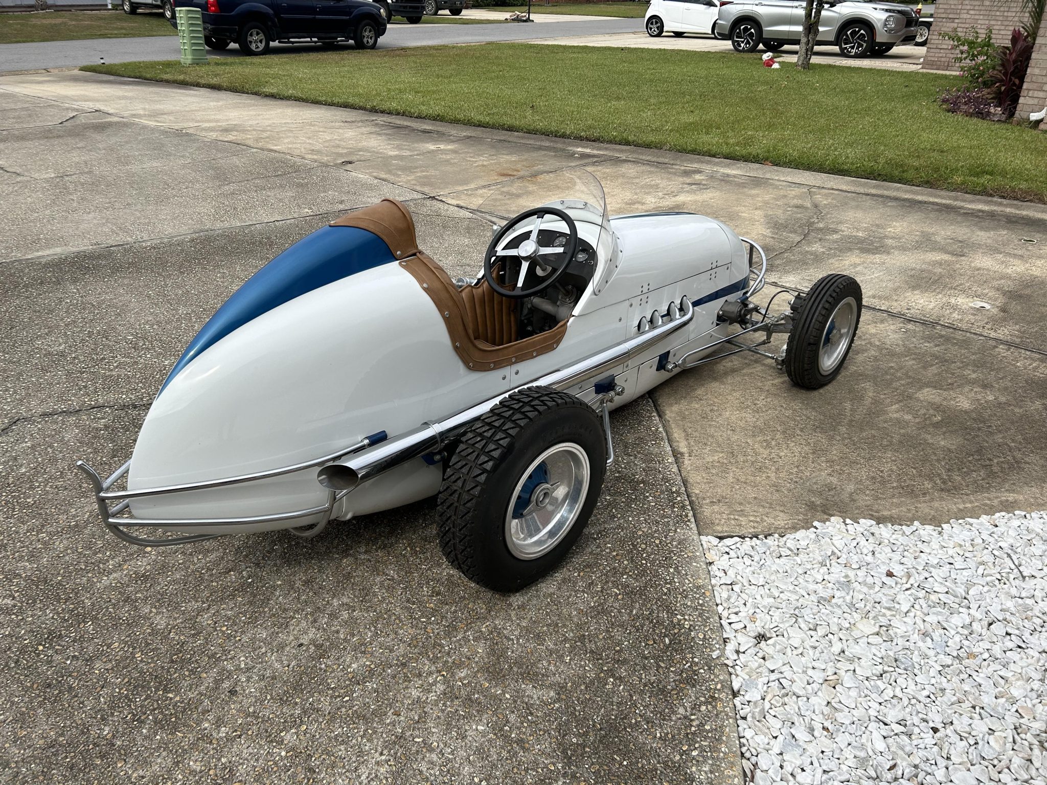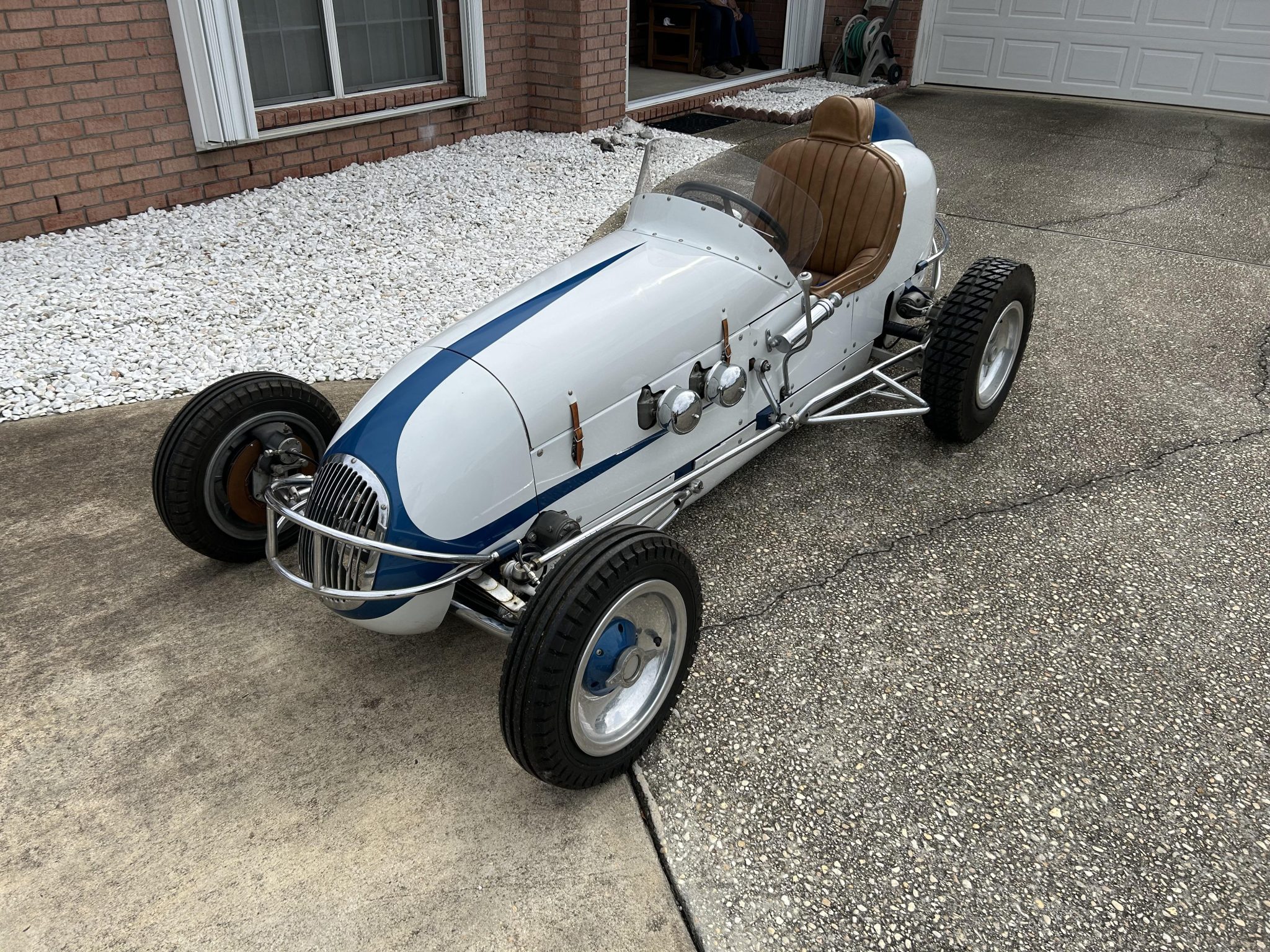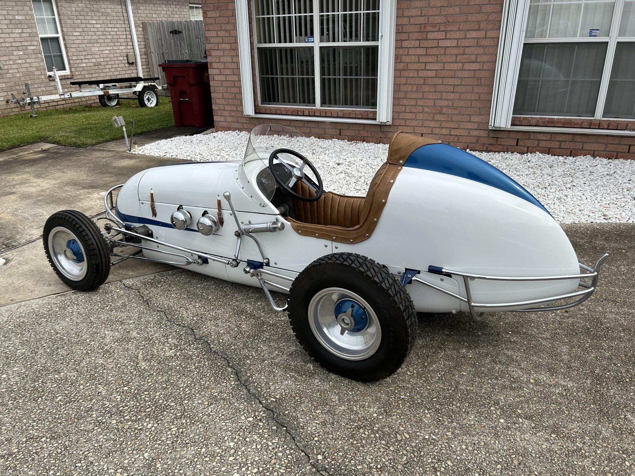 Halibrand-style 12″ aluminum wheels feature blue-finished knock-off hubs and are mounted with staggered-width Firestone tires. The suspension features a chrome-plated solid front axle and front and rear hairpins. Braking is handled by four-wheel discs that are engaged via an externally mounted hand lever.