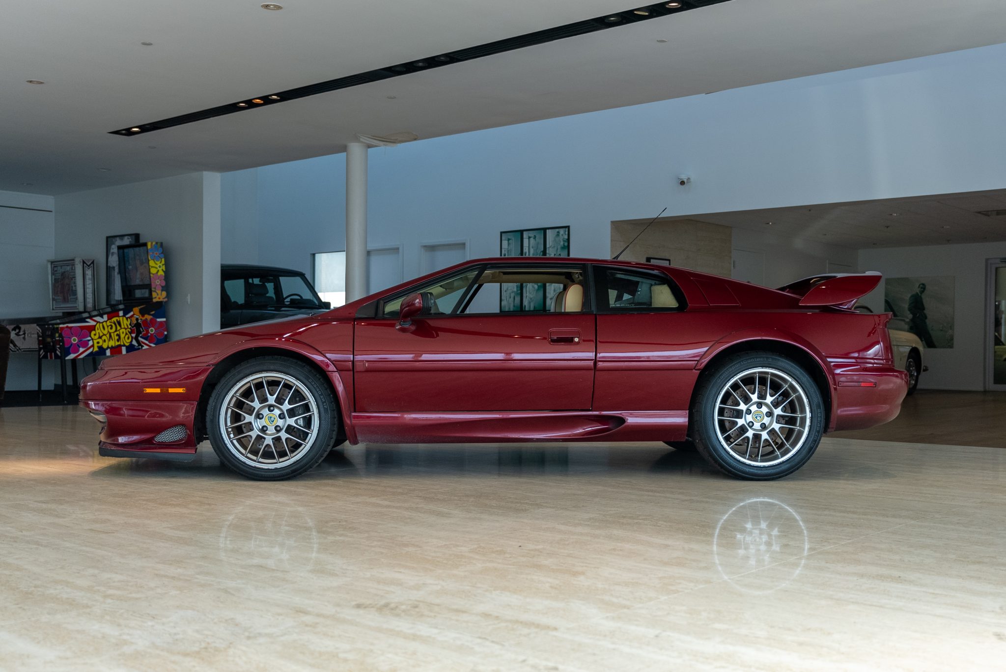 Staggered-width 17″ and 18″ alloy wheels are mounted with Continental ContiSportContact 3 tires measuring 235/40 up front and 285/35 out back. Bilstein shocks have been installed, and braking is handled by cross-drilled rotors at all four corners with Lotus-branded AP Racing calipers up front. Curb marks are visible on the wheels.