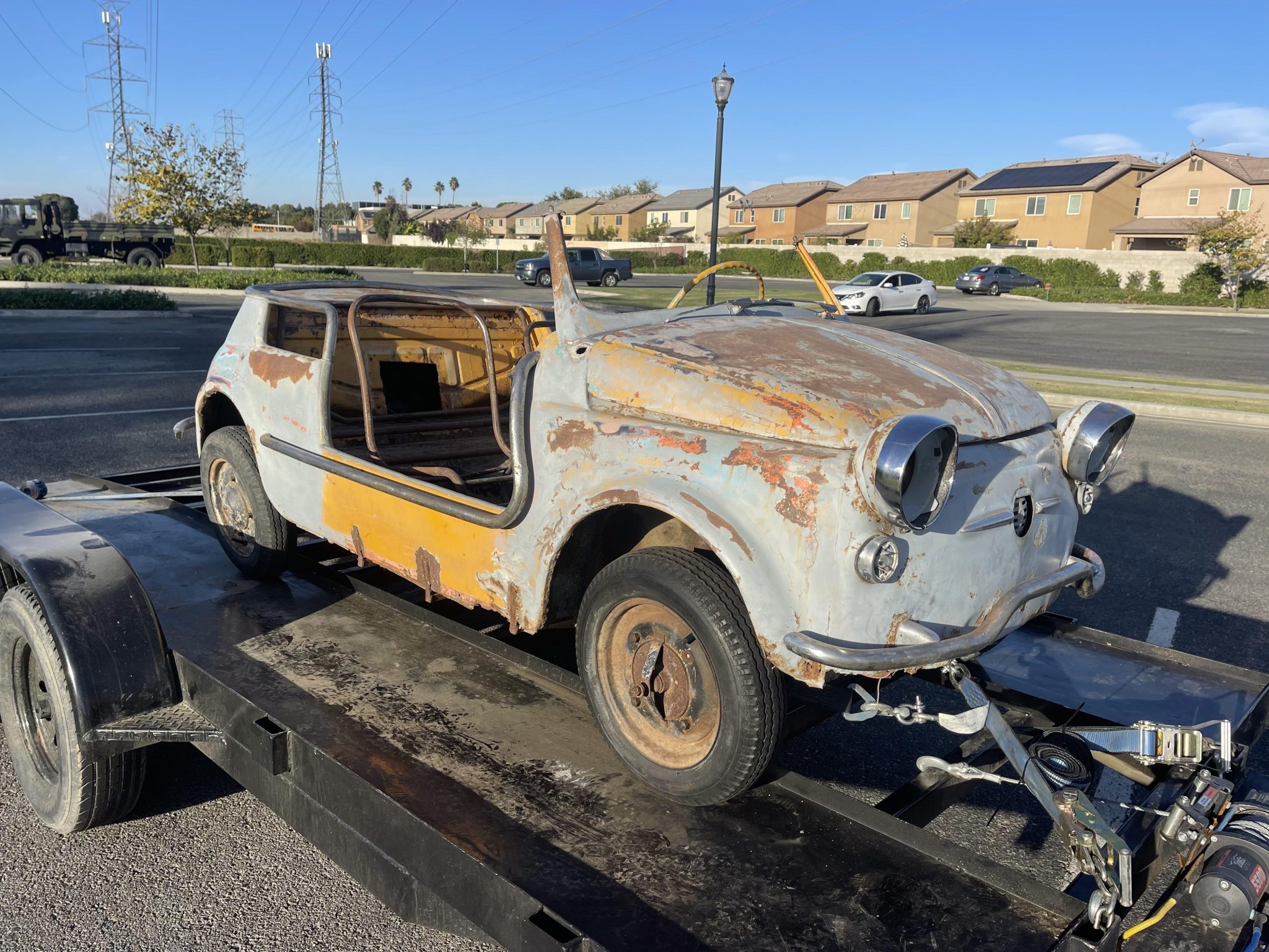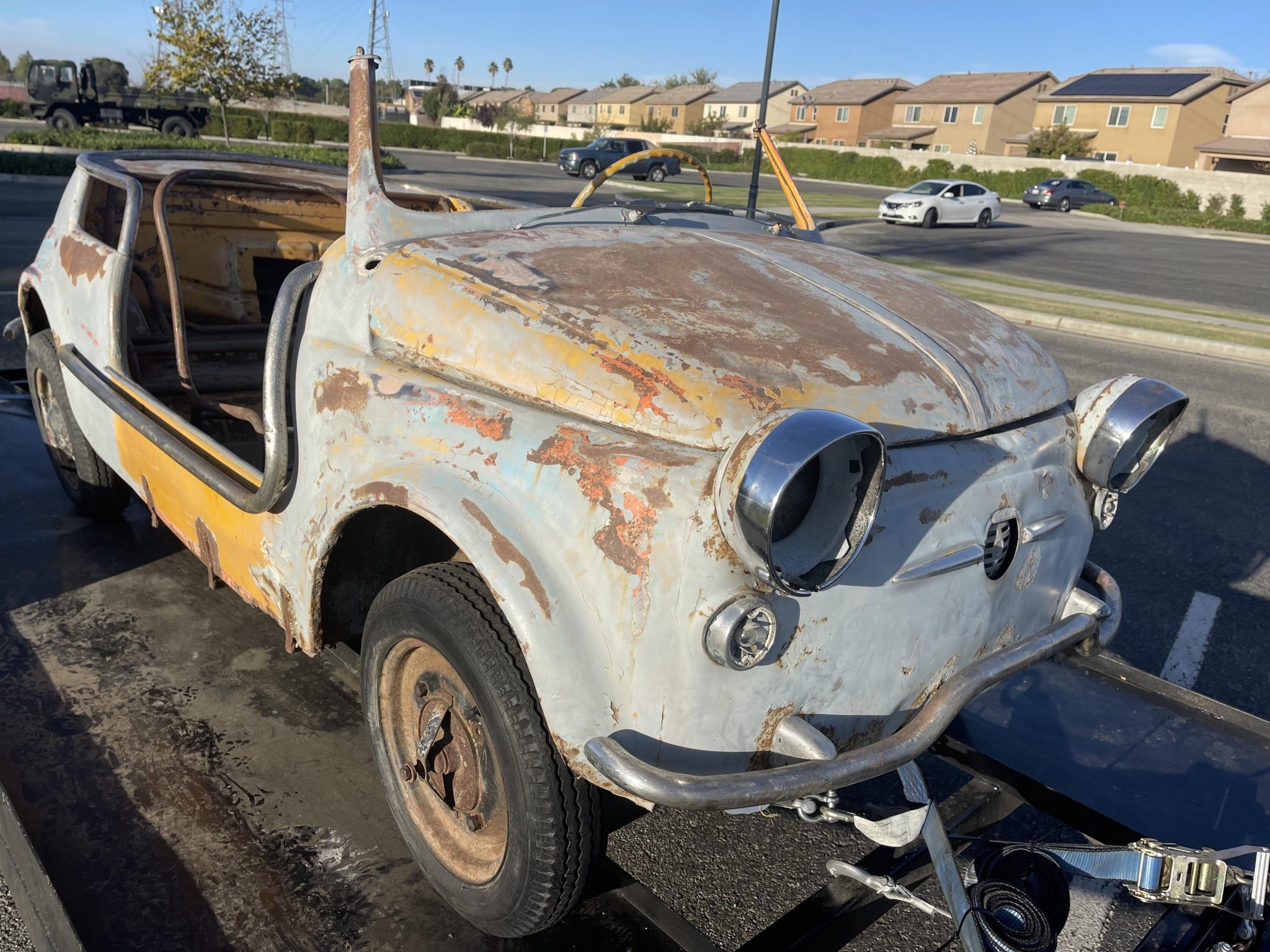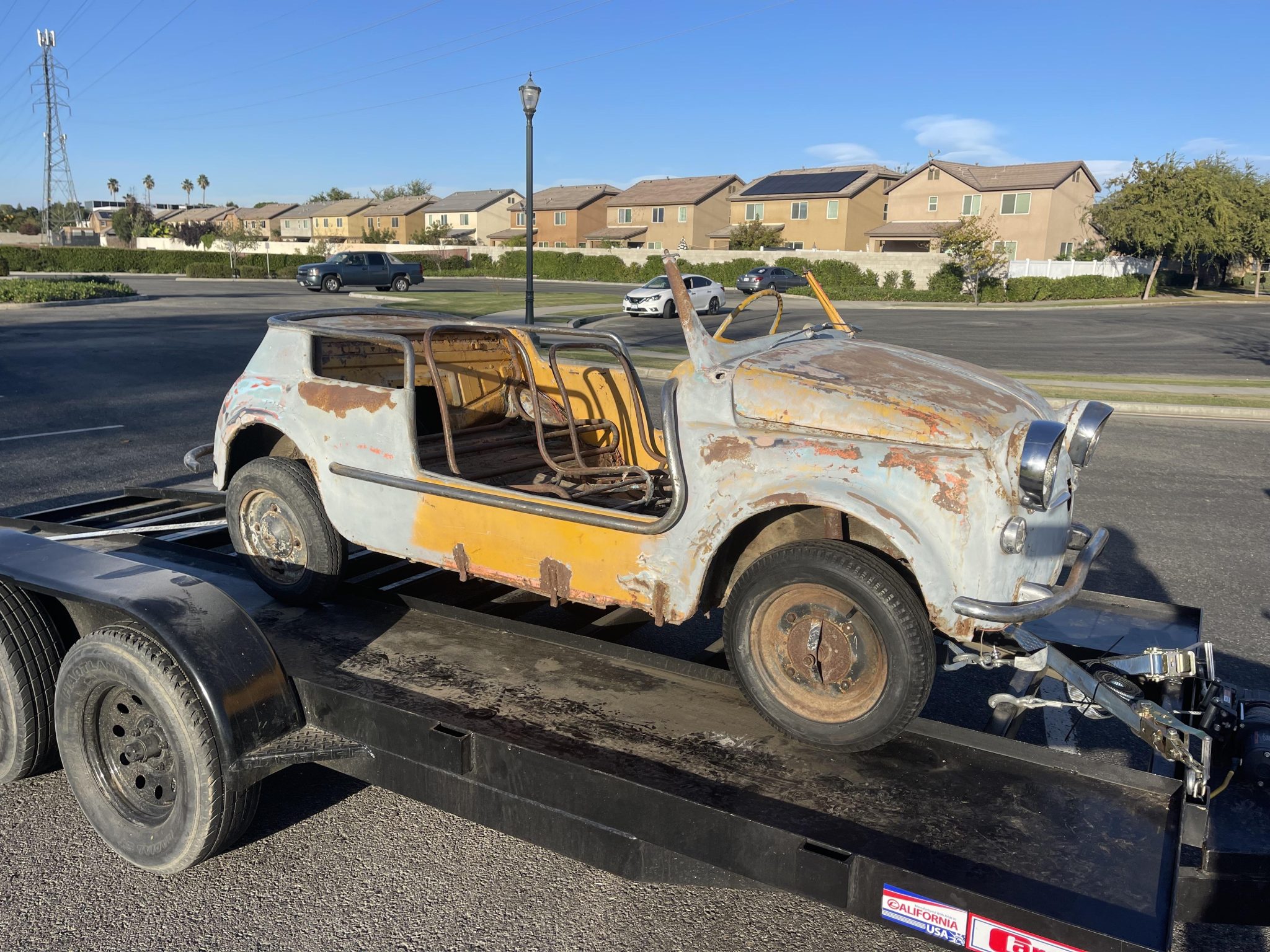 The 12″ steel wheels are mounted with non-matching tires, two of which hold air. Drum brakes are fitted at all four corners.