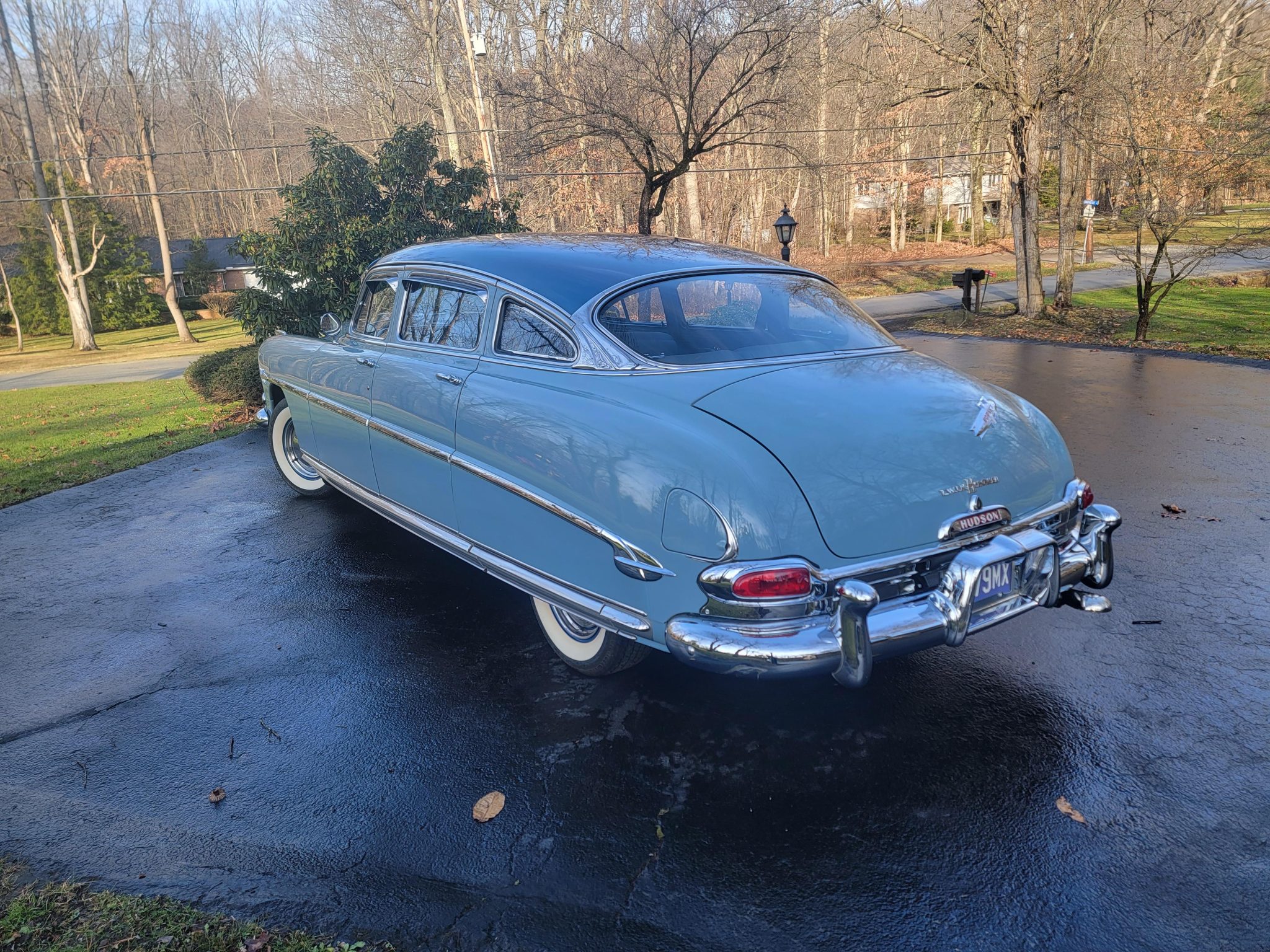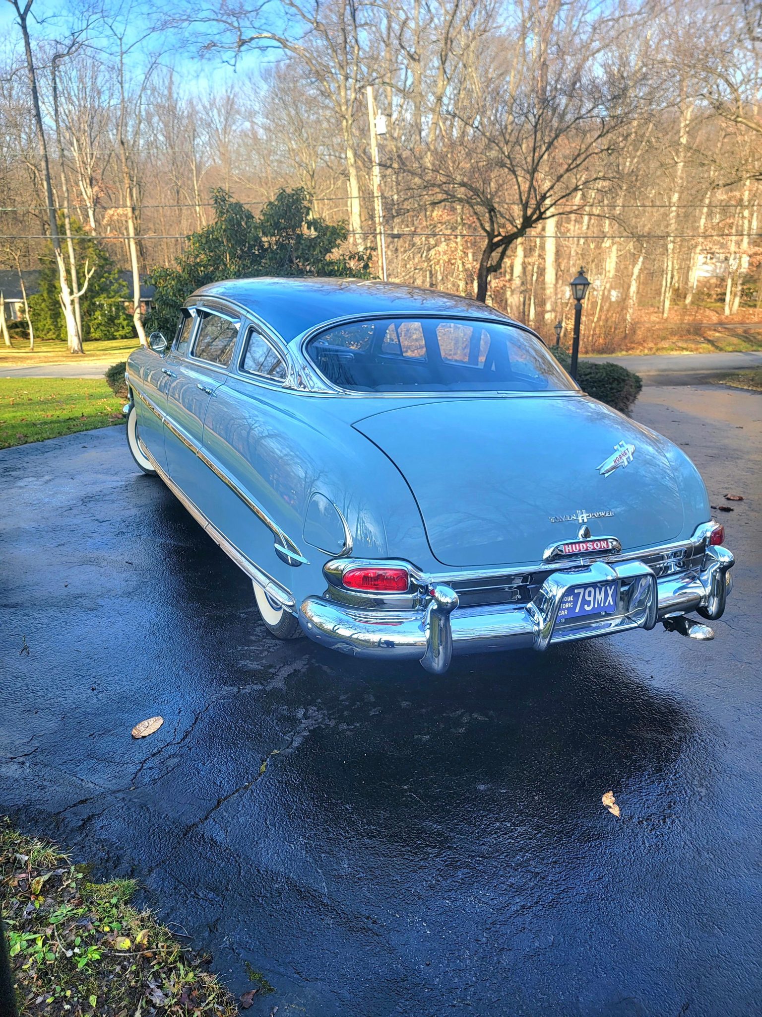 Dark blue 15″ steel wheels wear chrome hubcaps and are mounted with an older set of BFGoodrich whitewall radial tires that have developed air leaks. A matching spare wheel is stowed in the trunk. The Hornet rode on a 124″ wheelbase and features a step-down chassis with a coil-sprung independent front setup and a live rear axle with leaf springs. The car is equipped with four-wheel drum brakes.