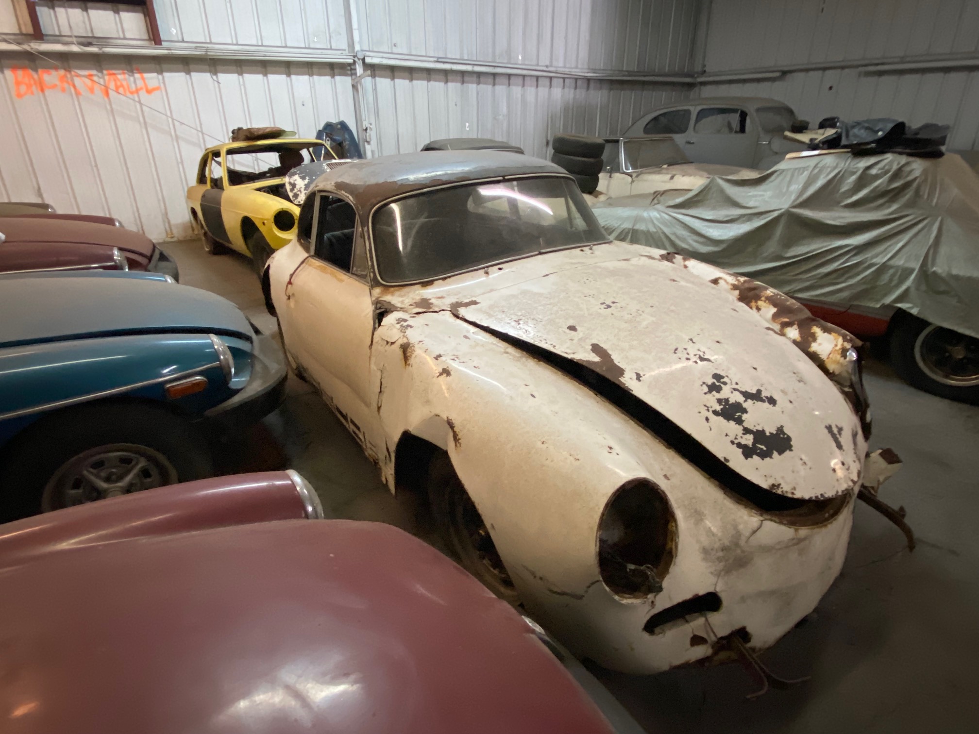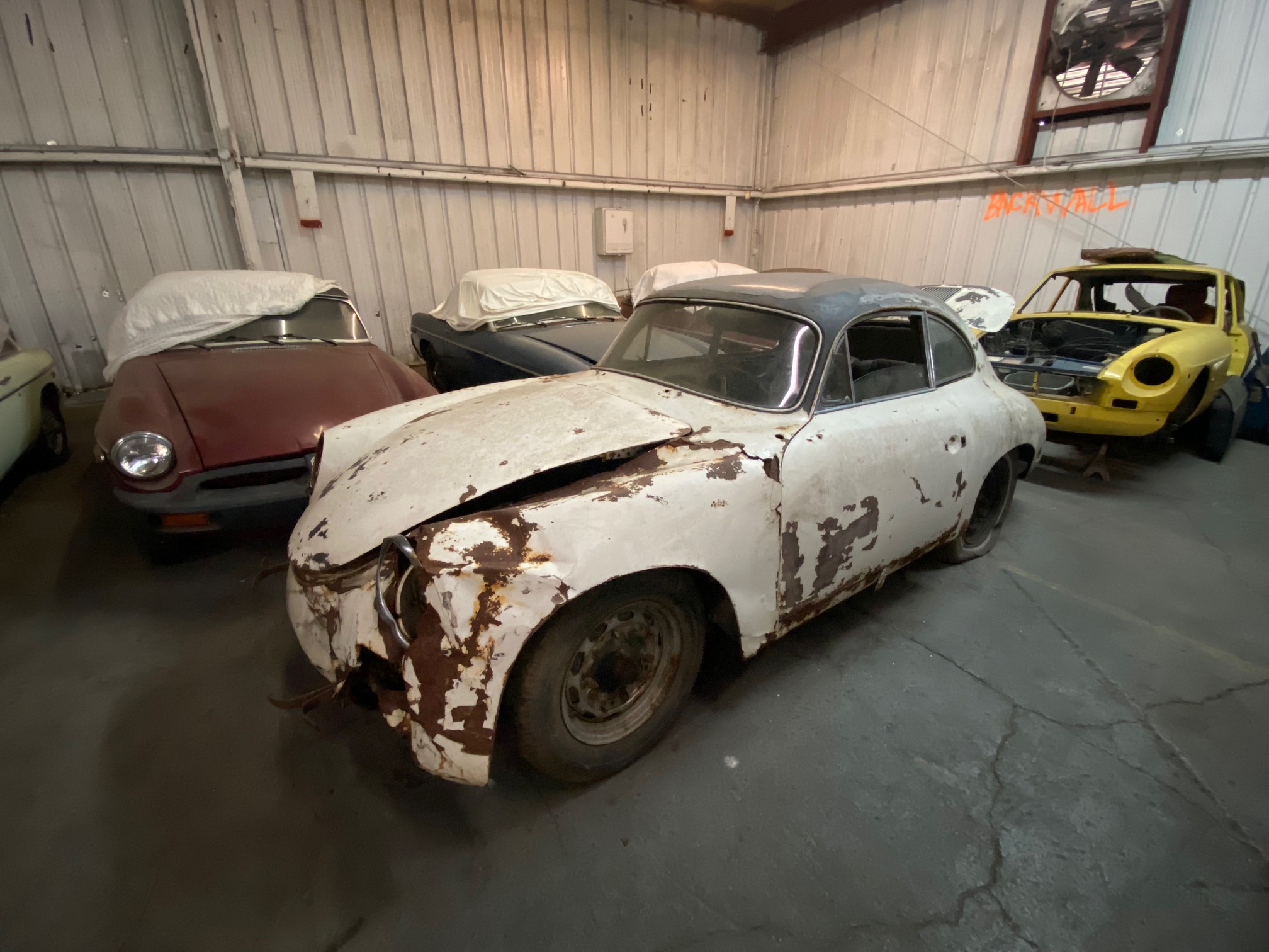 The 15″ steel wheels and suspension remain in place along with the four-wheel drum brakes. Rust is visible on the wheels, suspension, and brake components.
