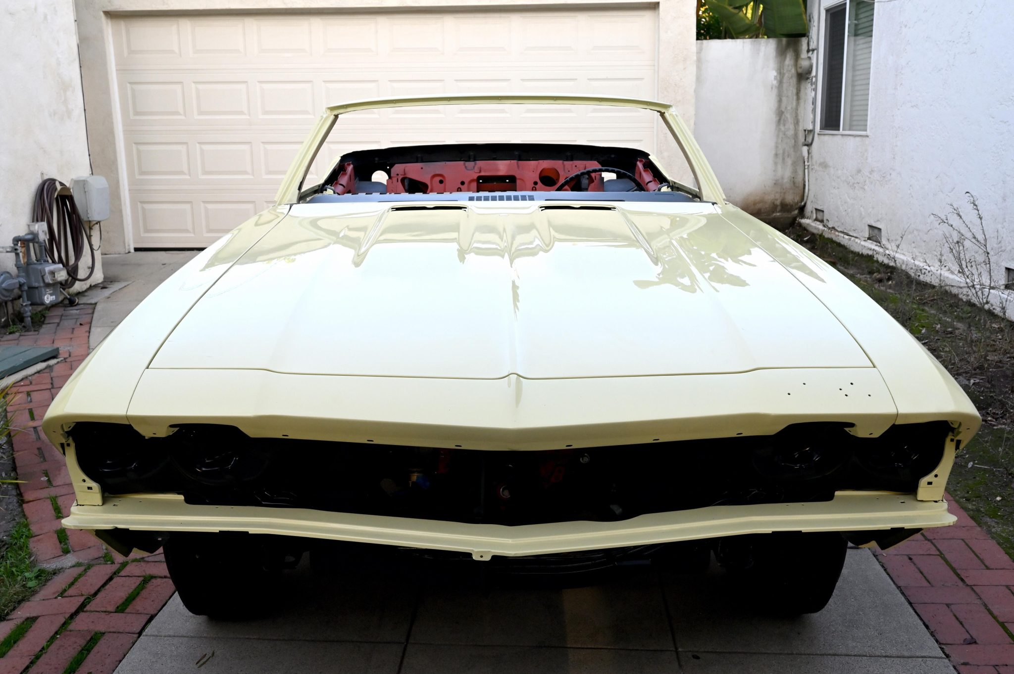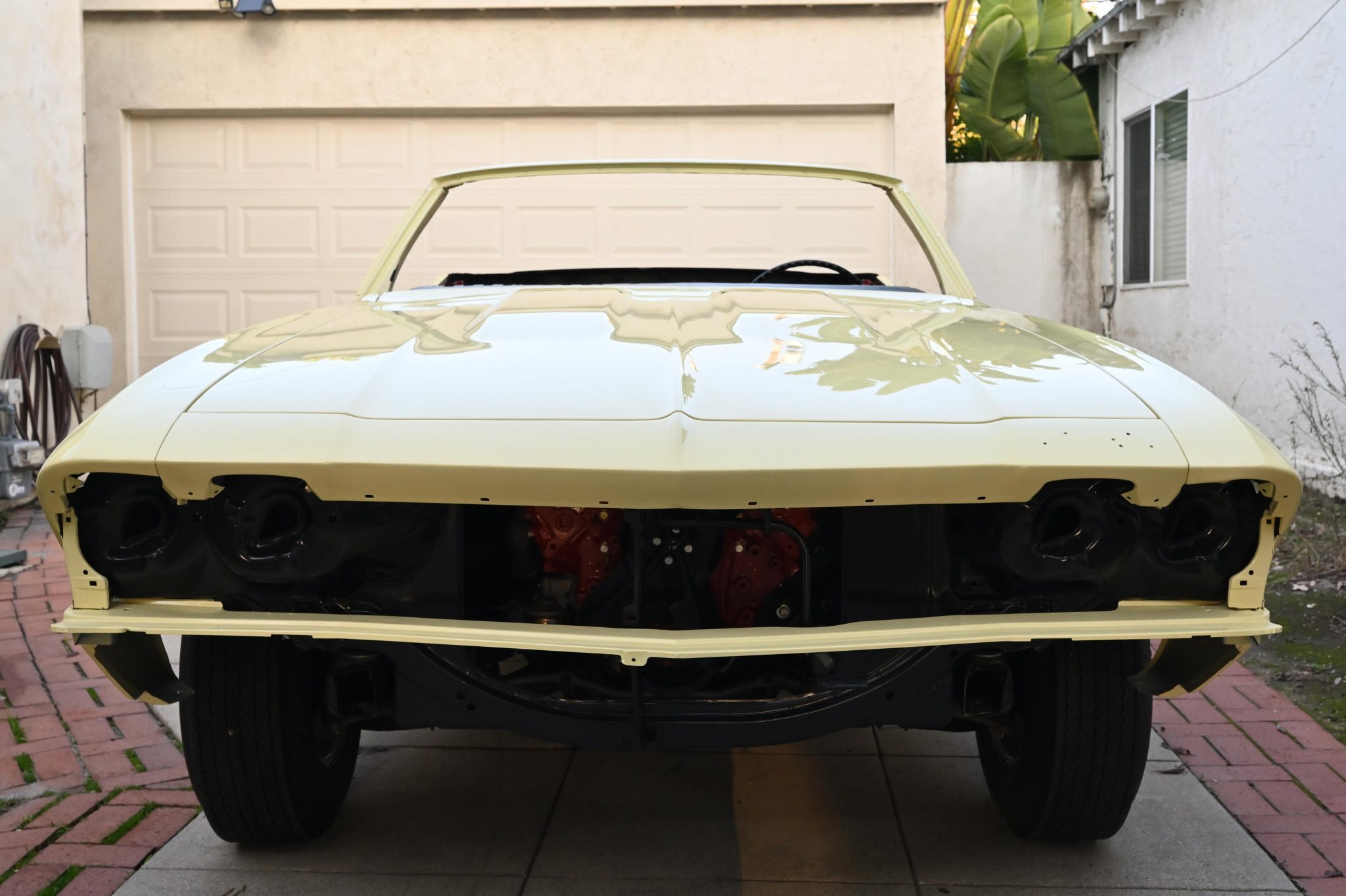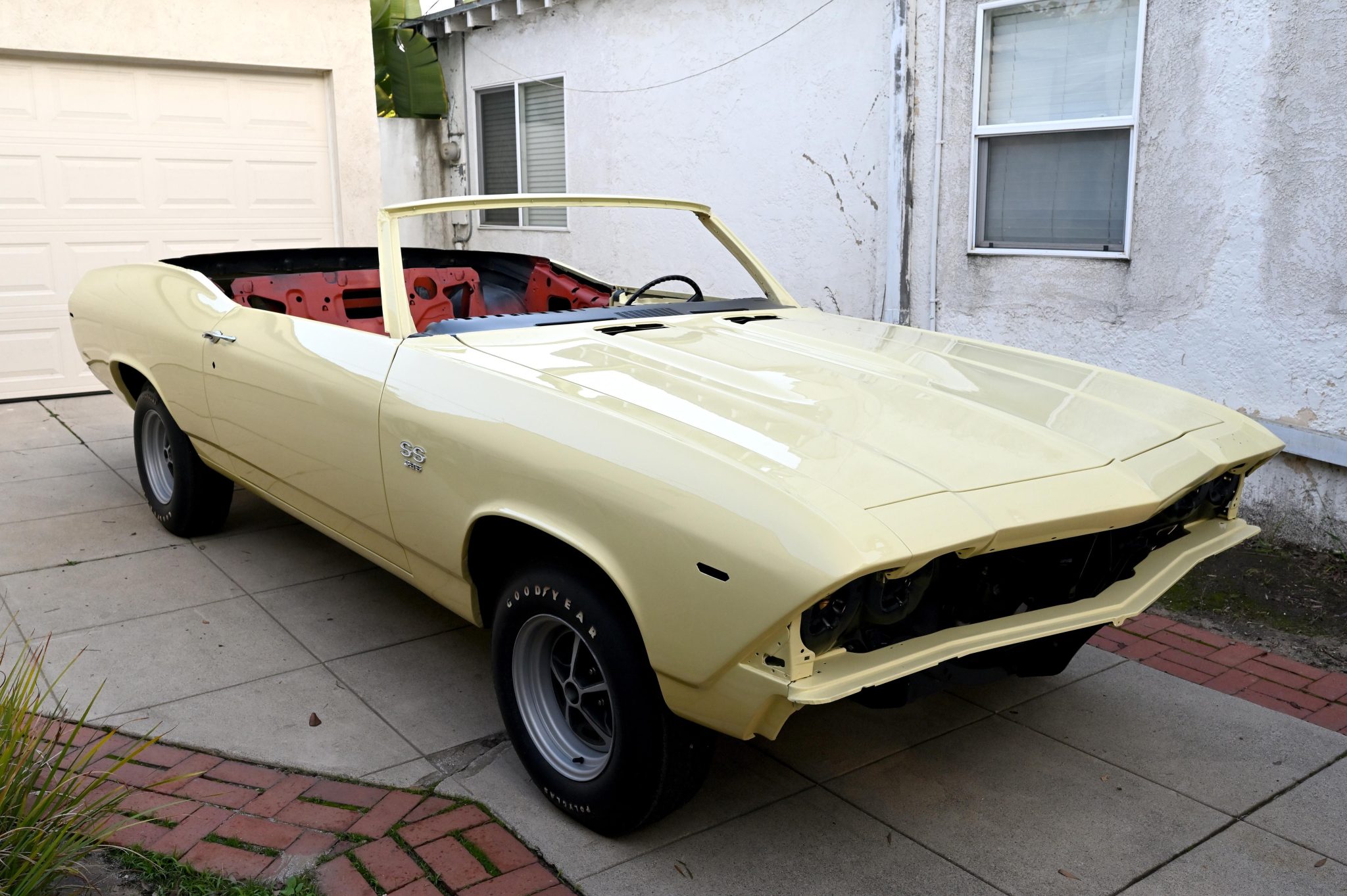 The car rolls on Super Sport–style 14″ wheels wrapped in Goodyear Polyglas F70 tires. The steering box and power steering pump are said to have been rebuilt, and disc brakes are fitted up front while drums are in the rear. The front calipers are not installed, and the braking system’s hydraulic plumbing is incomplete. The parking brake is functional.