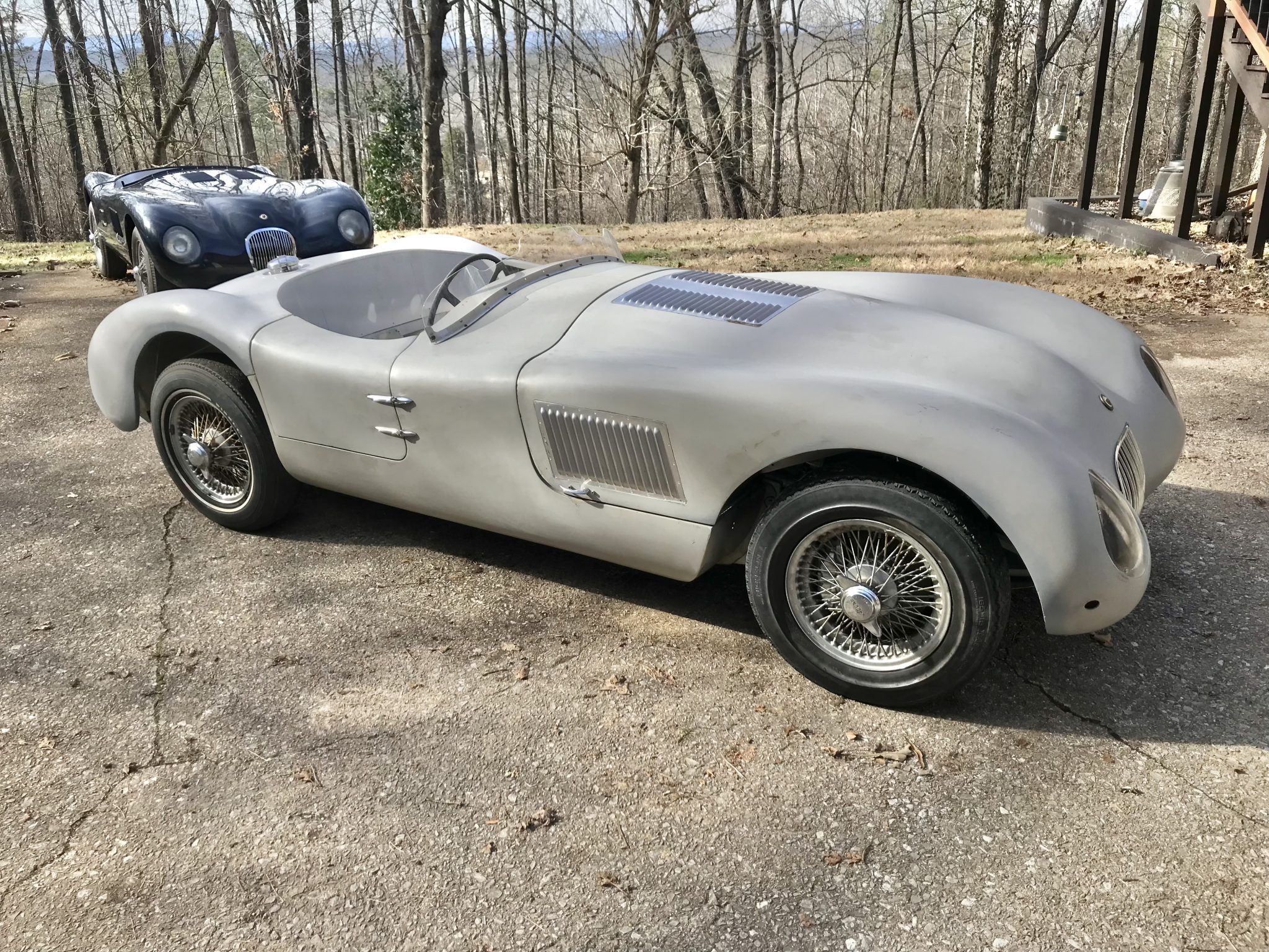 Silver-finished 15″ wire wheels are secured via Jaguar-branded knock-off spinners and are mounted with a mixed set of tires. The tubular steel frame incorporates rack-and-pinion steering as well as an independent suspension with Spax adjustable coilovers at all four corners. The car is further equipped with four-wheel ventilated disc brakes. The seller recommends replacing the wheels and tires along with the hydraulic lines.
