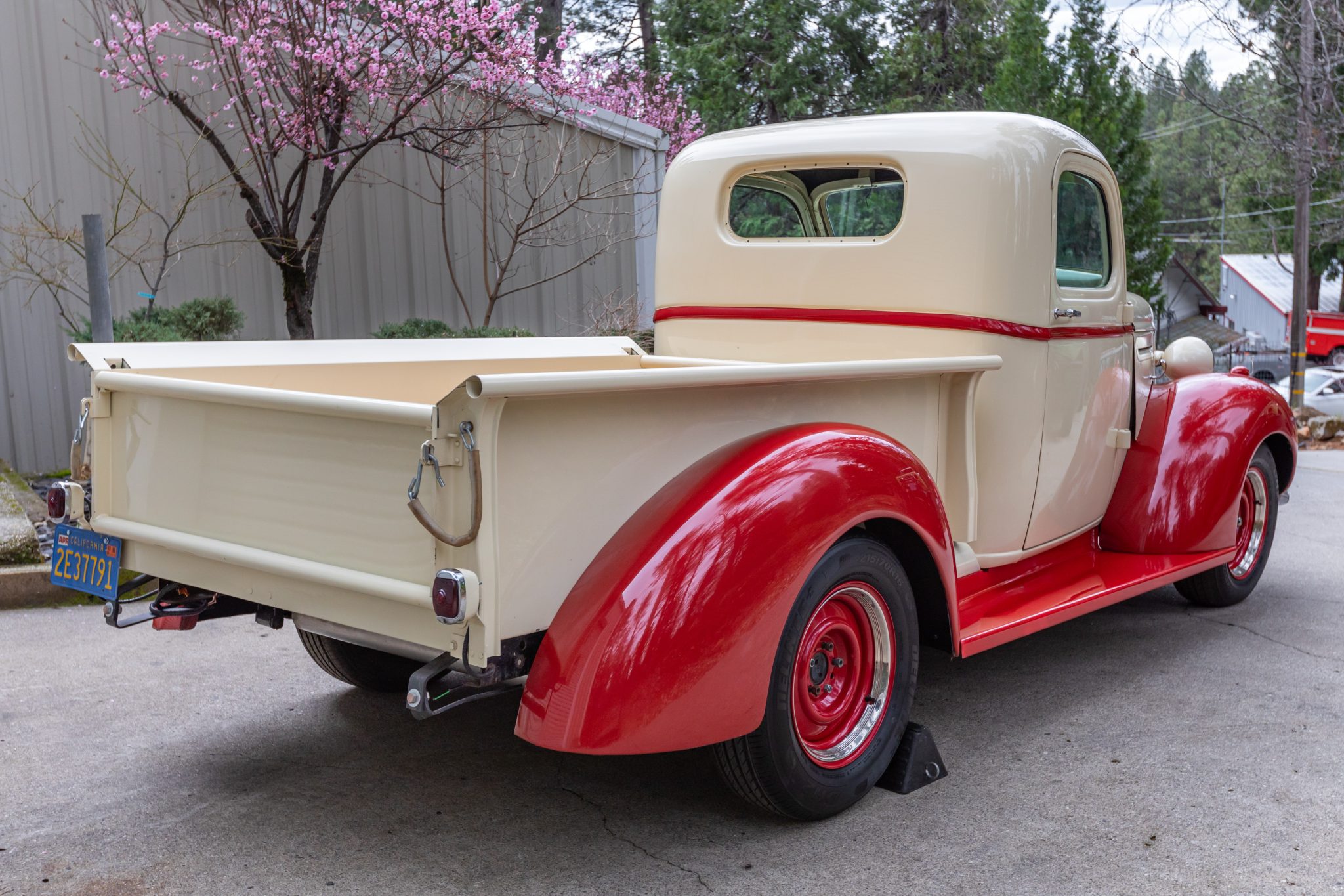 Red-finished 16″ steel wheels wear polished trim rings and are mounted with 215/70 Delinte DH2 tires. A Mustang II-style front crossmember and suspension system was installed along with power-assisted rack-and-pinion steering and front disc brakes.
