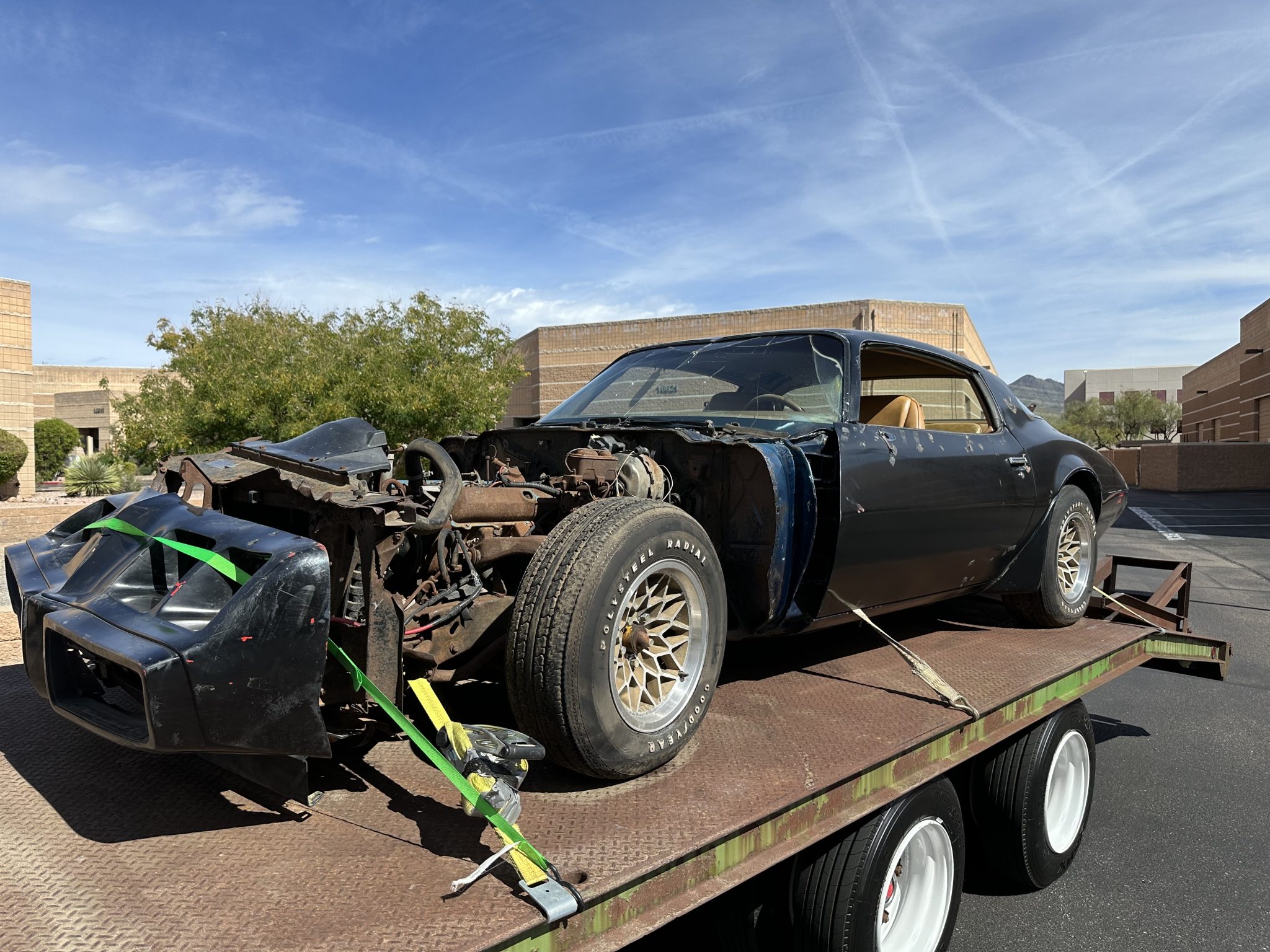 Snowflake-style 15″ wheels with gold accents wear 225/70 Goodyear Polysteel Radial white-letter tires, and the front right tire does not hold air. The WS6 Special Performance Package added power-assisted four-wheel disc brakes, a quick-ratio steering box, and a larger sway bar.