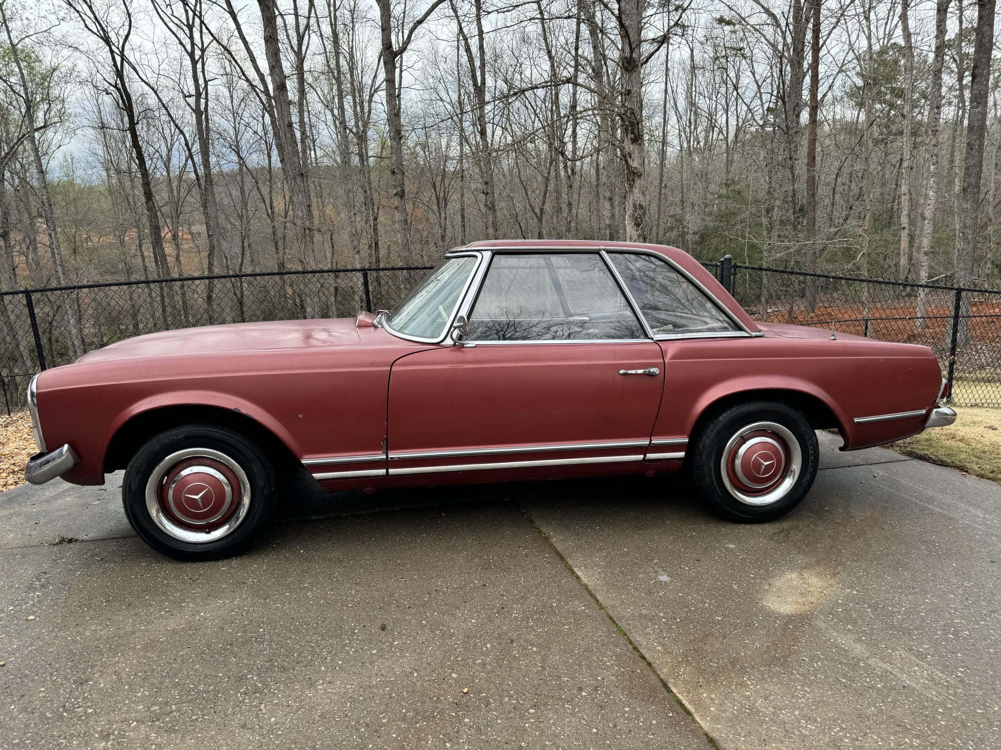 Painted 14″ steel wheels feature hubcaps with painted centers and bright trim rings, and they are mounted with a mixed set of tires that were mounted to move the car. Braking is provided by power-assisted front discs and rear drums.