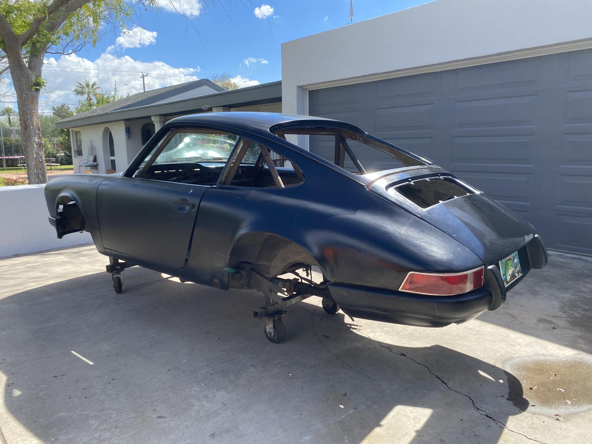 Suspension and steering components were modified prior to being removed approximately two decades ago. The sale includes a front-suspension assembly with Bilstein struts and a lowered steering rack. Rear-suspension parts include a set of gun-drilled torsion bars, a spare set of factory-style torsion bars, and 1982-specification aluminum trailing arms. A Tarett Engineering sway bar, 911S-specification brake calipers, ventilated and cross-drilled brake rotors, and a set of four 15″ cookie cutter wheels are also included in the sale.