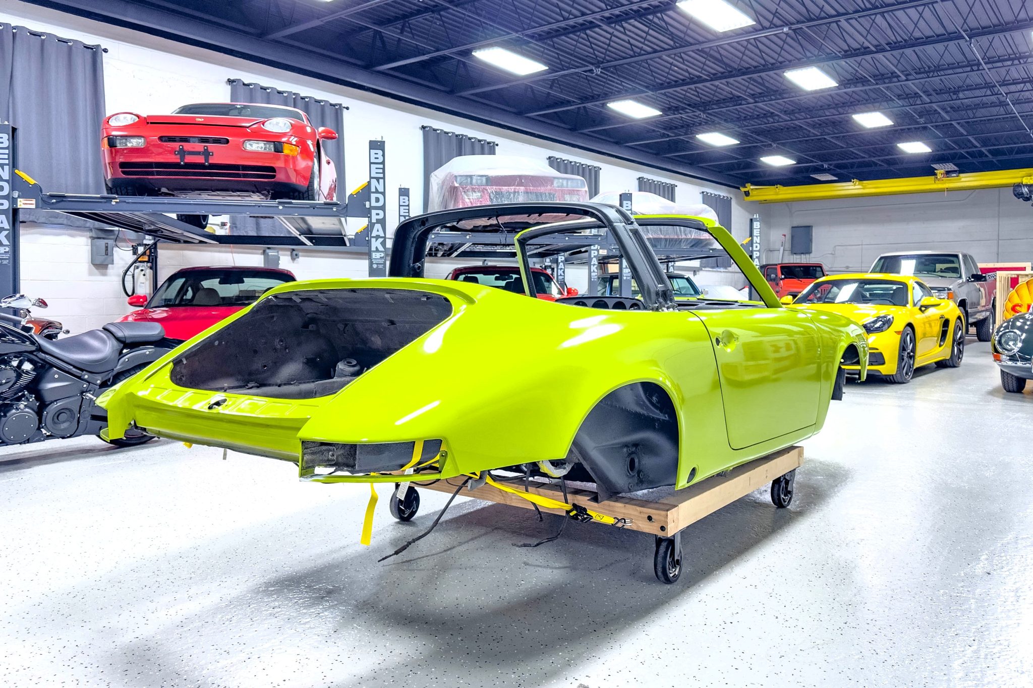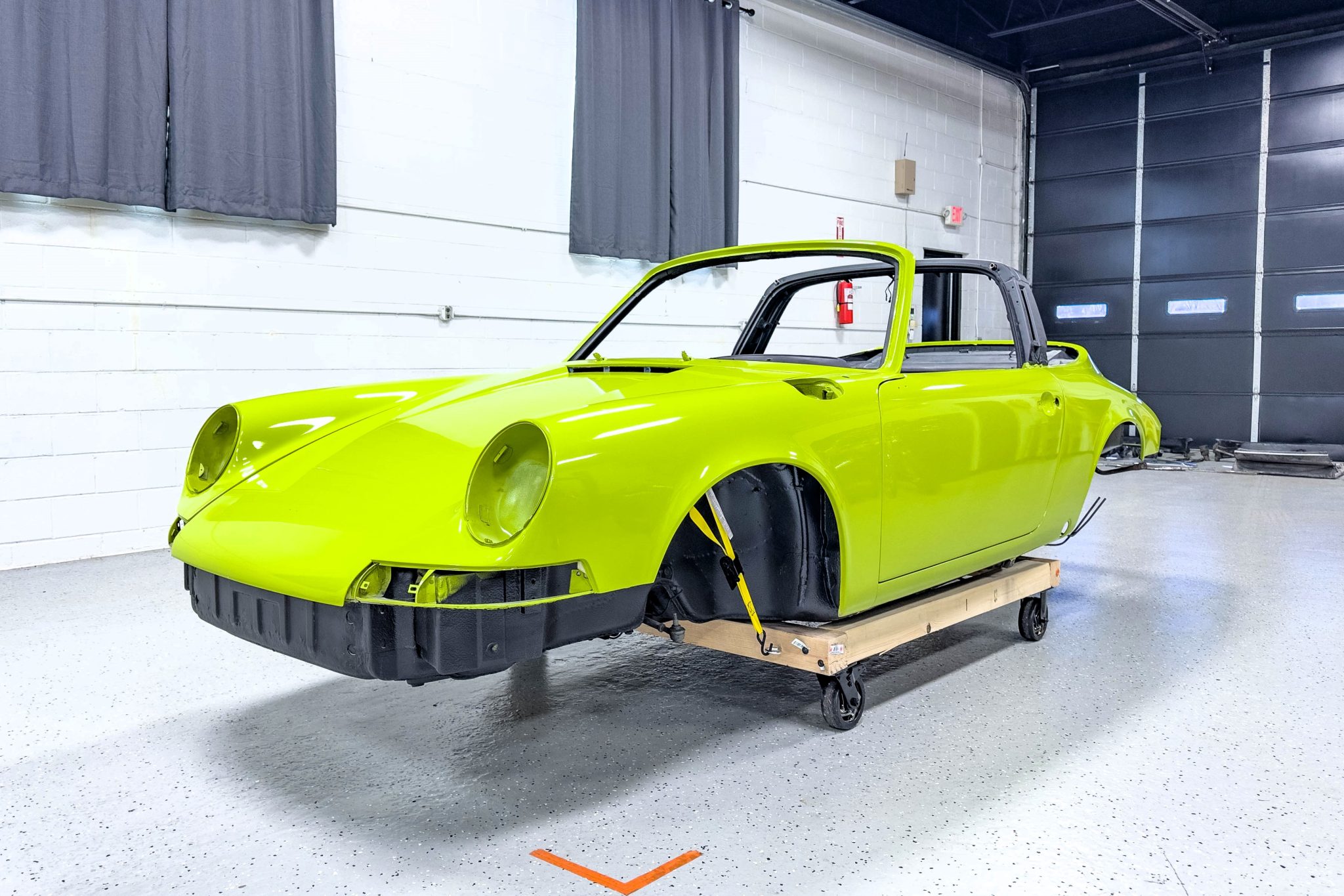 The body is affixed to a wooden dolly that rolls on casters. Removed suspension components can be seen in the gallery.