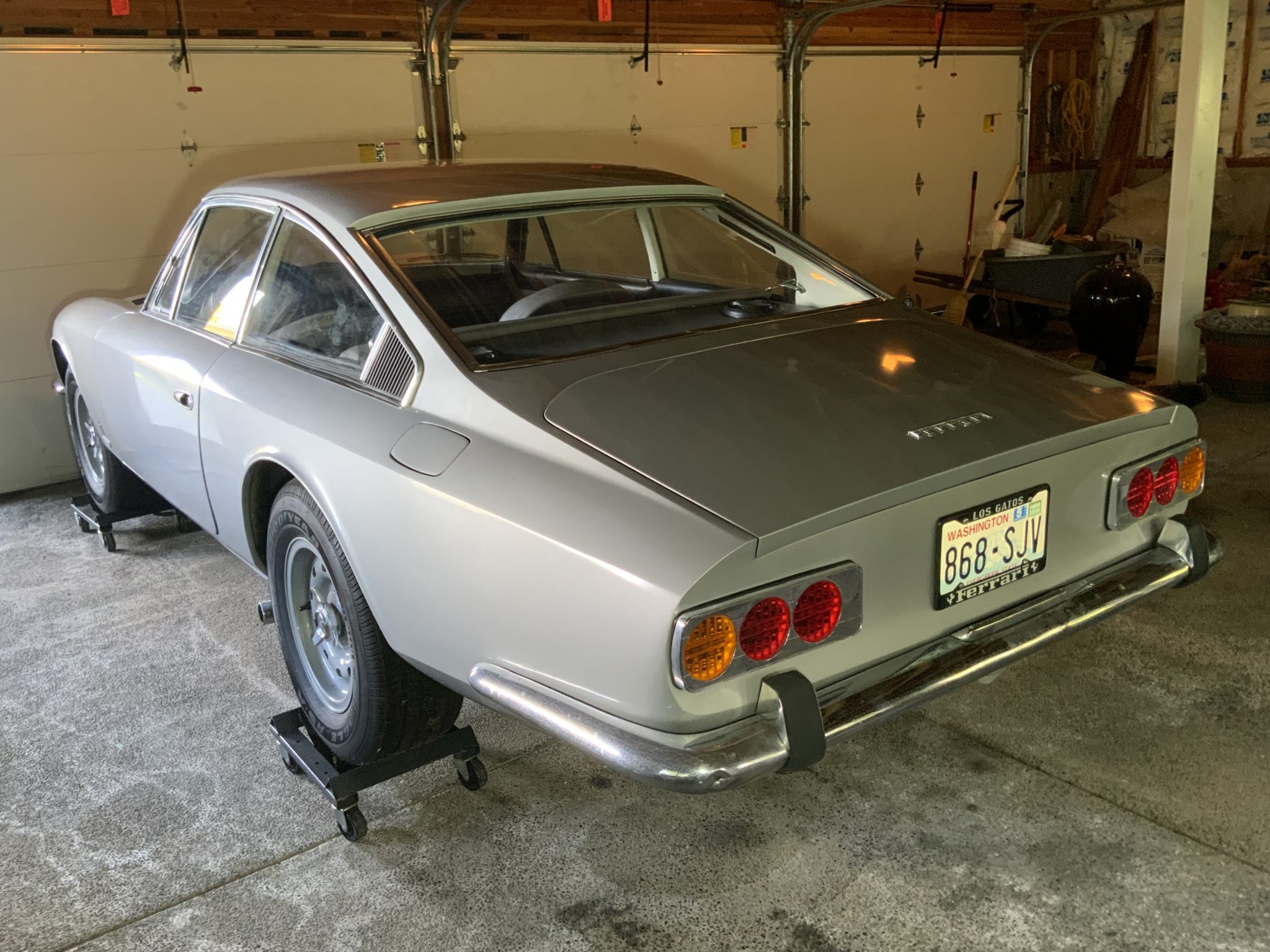 The Campagnolo alloy wheels are secured by three-eared knock-offs and mounted with 235/70 Goodyear Eagle RS-A tires. A matching spare wheel with an older Pirelli tire is stowed beneath the trunk floor. Power-assisted ventilated disc brakes are mounted at all four corners.