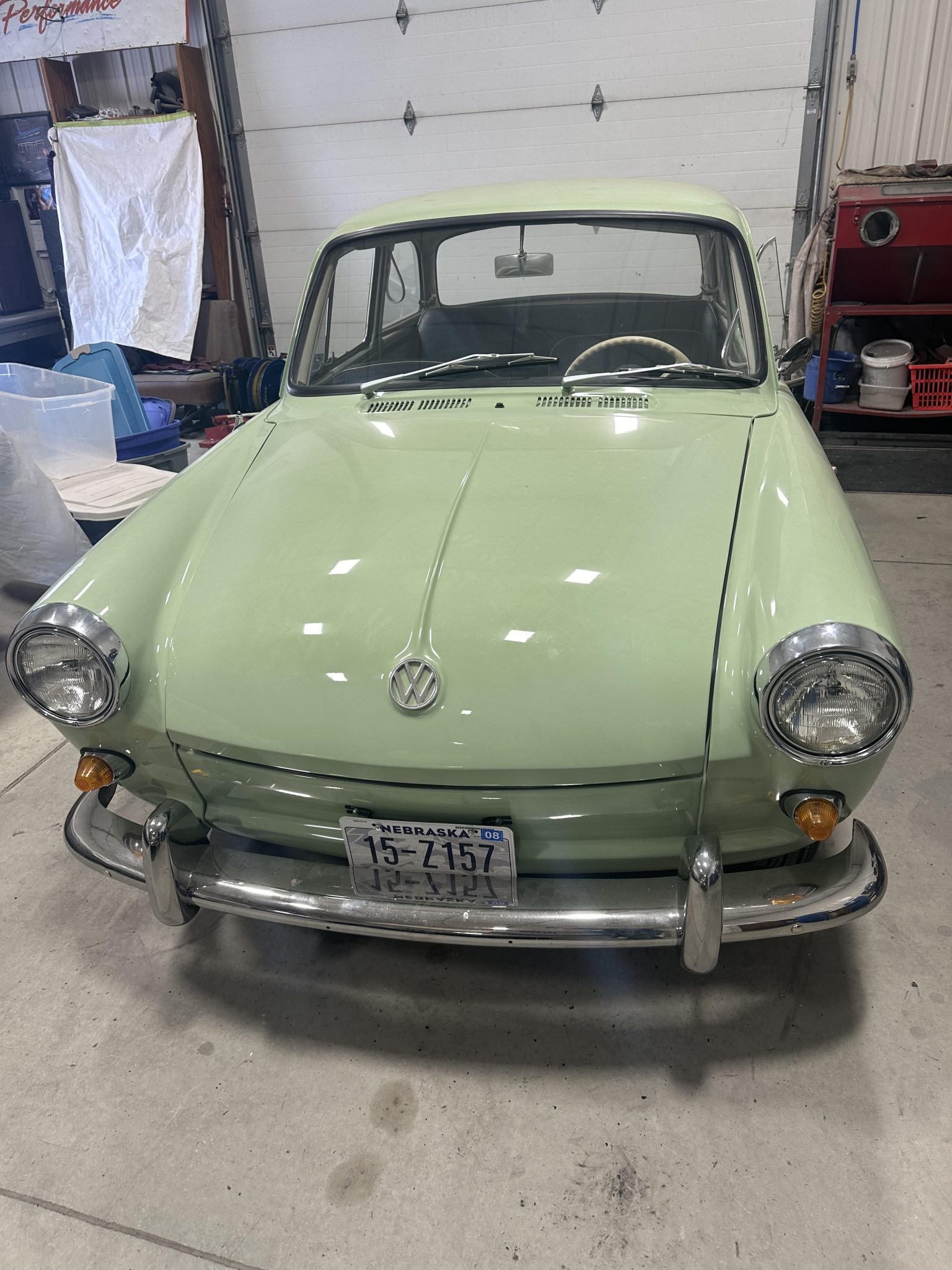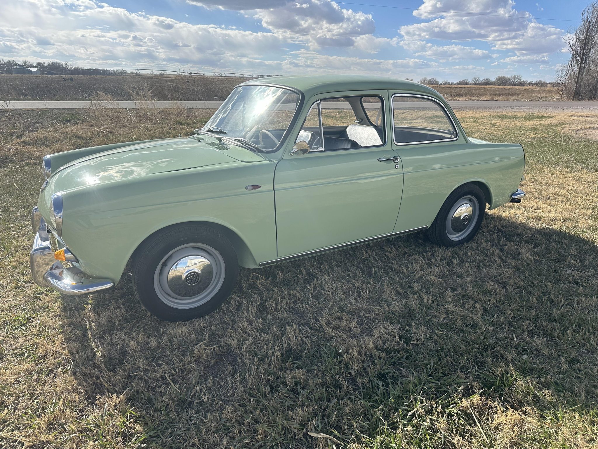 Gray-finished 15″ steel wheels wear chrome VW-branded hubcaps and are mounted with 175/65 Hankook Optimo tires. The car is equipped with four-wheel drums and the front brakes are inoperative.