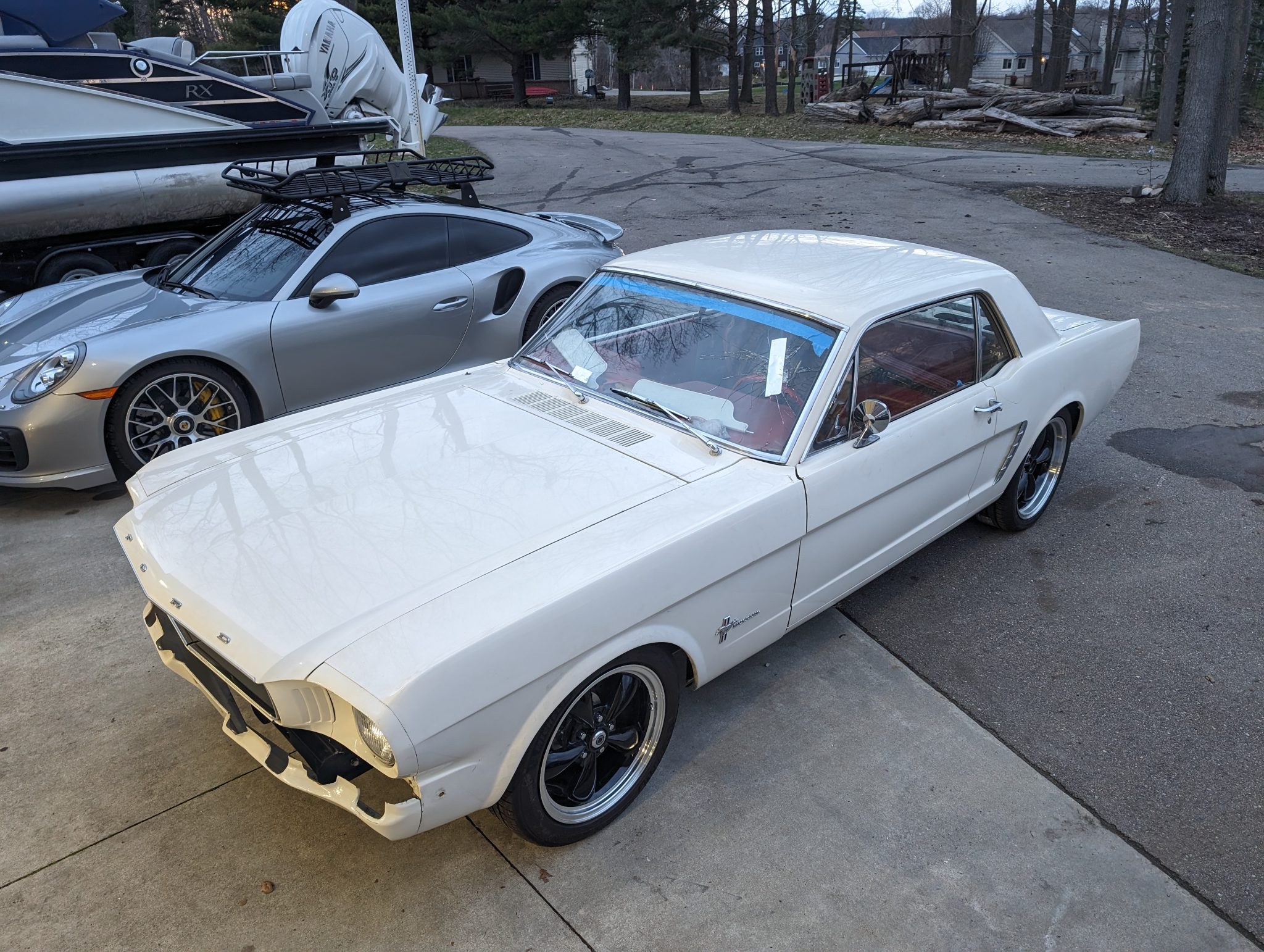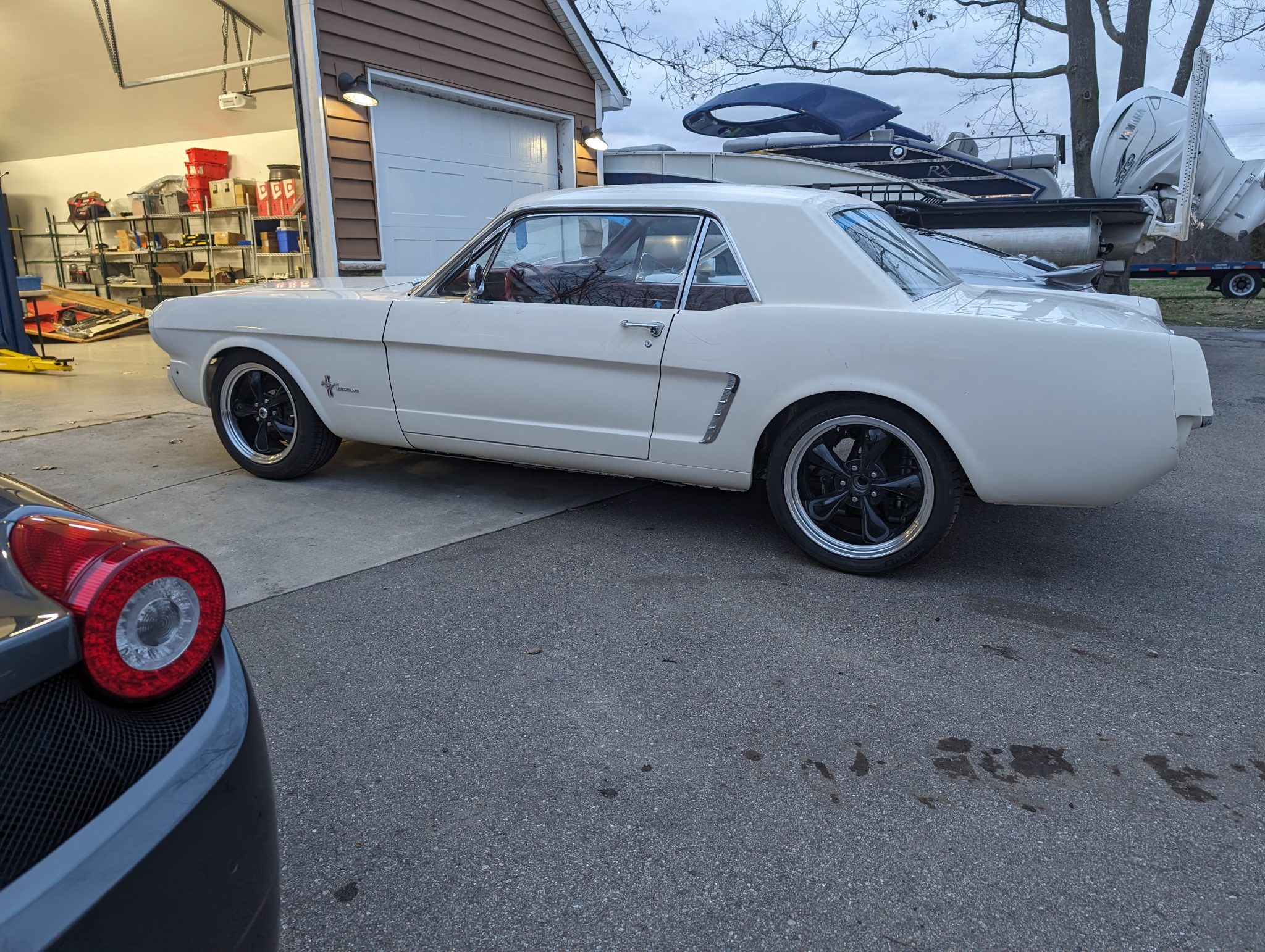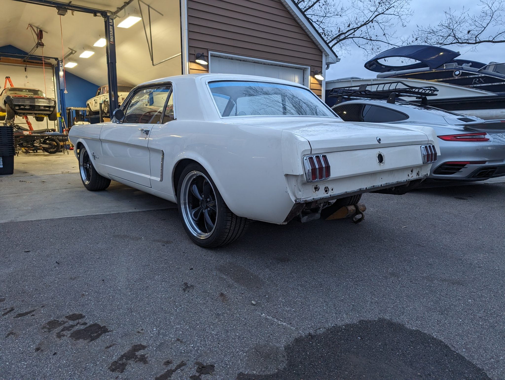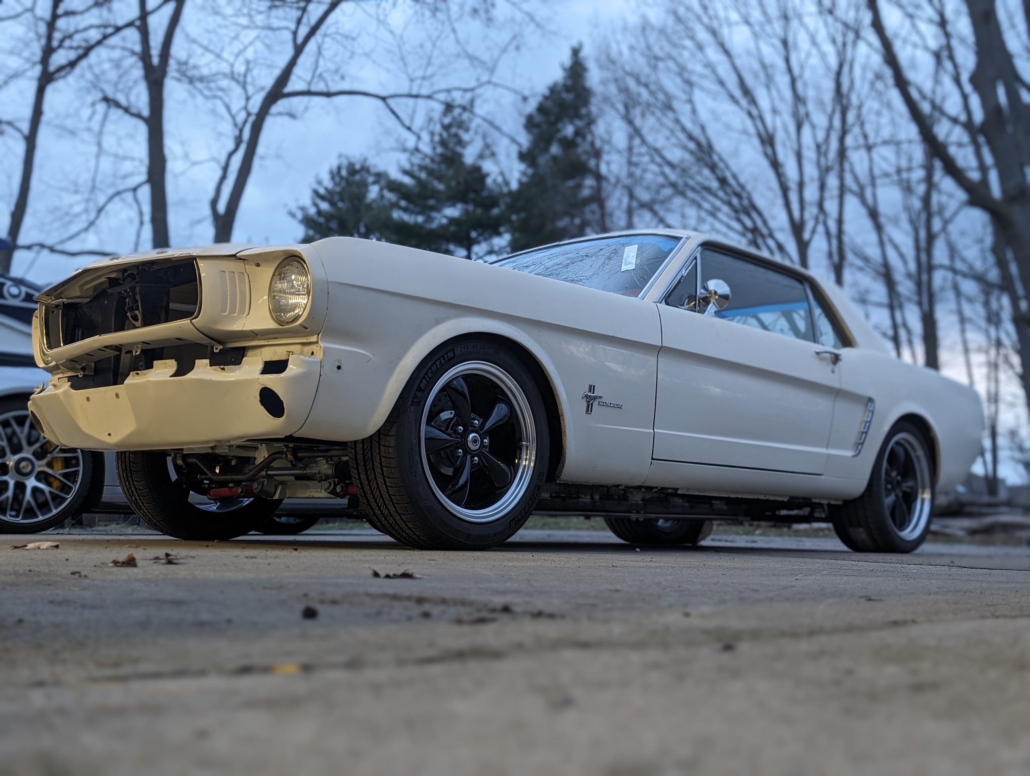 A Heidts double A-arm front suspension and independent rear setup are installed and feature tubular control arms, front and rear sway bars, and coilovers. The car rides on five-spoke 17″ front and 18″ rear wheels with black centers and polished lips, and they wear staggered-width Michelin Pilot Sport All-Season tires. Front brake discs are fitted, though the calipers and rear brakes have been removed.