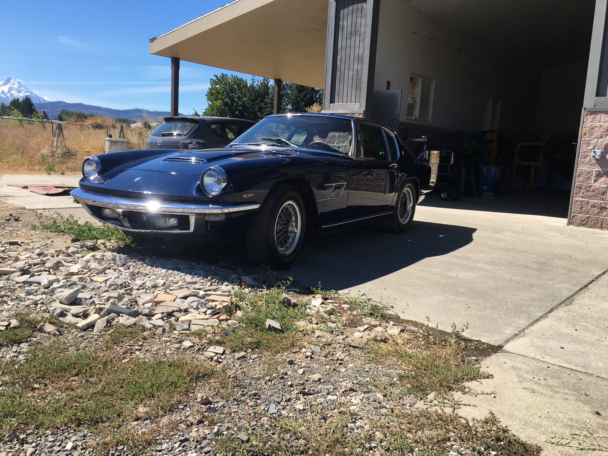 After the repairs, the body was repainted in the dark blue seen here rather than its faded original light metallic blue. The car has reportedly spent less than two months in the sun in the 26 years since, and the finish still shines well despite a variety of minor marks, chips, and scratches from bumper fitting and long-term storage. Original Borrani knockoff wire wheels are serviceable but could use cosmetic attention and wear older, weather-checked tires.