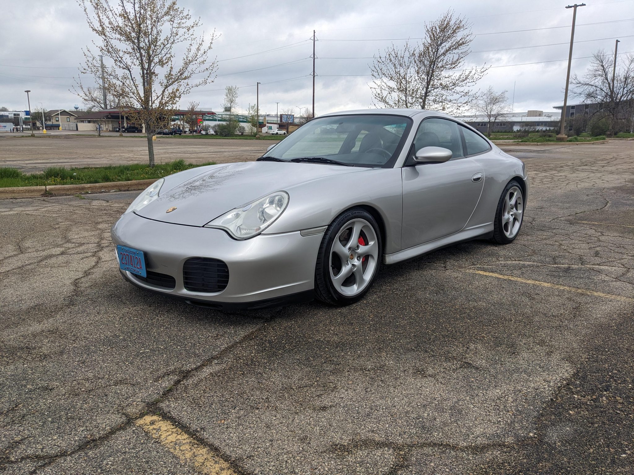 The 18″ Turbo-look wheels with curb rash are mounted with 225/40 front and 295/30 rear General G-Max RS tires that were installed in 2021. The car is equipped with Porsche Stability Management (PSM) and an Automatic Brake Differential (ABD). Braking is from red Porsche-branded calipers over ventilated and cross-drilled rotors at all four corners. Bilstein PSS10 coilovers were installed in 2022, and the brake fluid was flushed at that time, according to the seller.