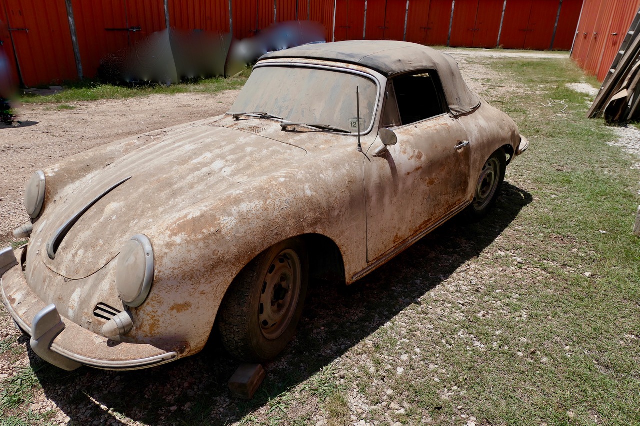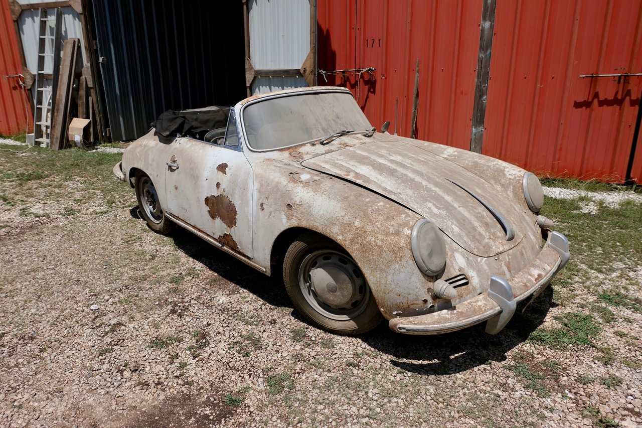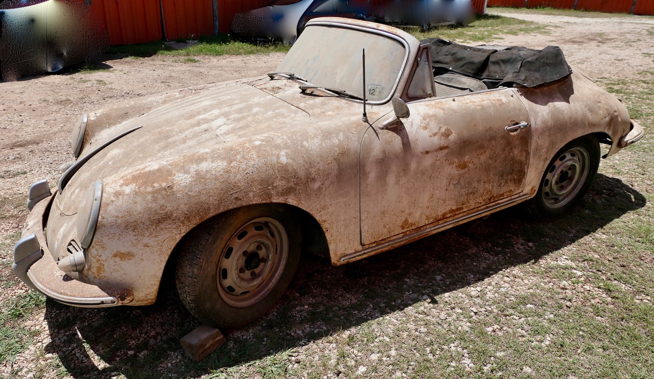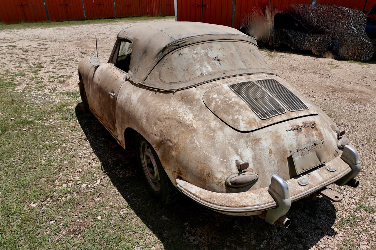 The black soft top is believed to have been replaced at some point, and the top bows are said to remain in place, along with the hinges, latches, and hand holds. Much of the brightwork is still installed, as are the door handles, deck hardware, light assemblies, and glass. A trailer hitch is mounted out back. The car retains stock steel wheels, and two aftermarket chrome wheels are also included with the sale.