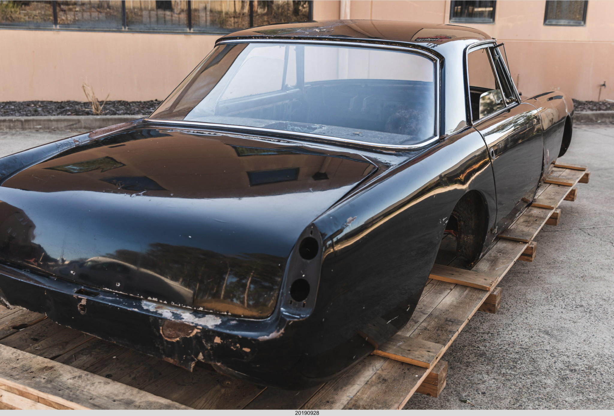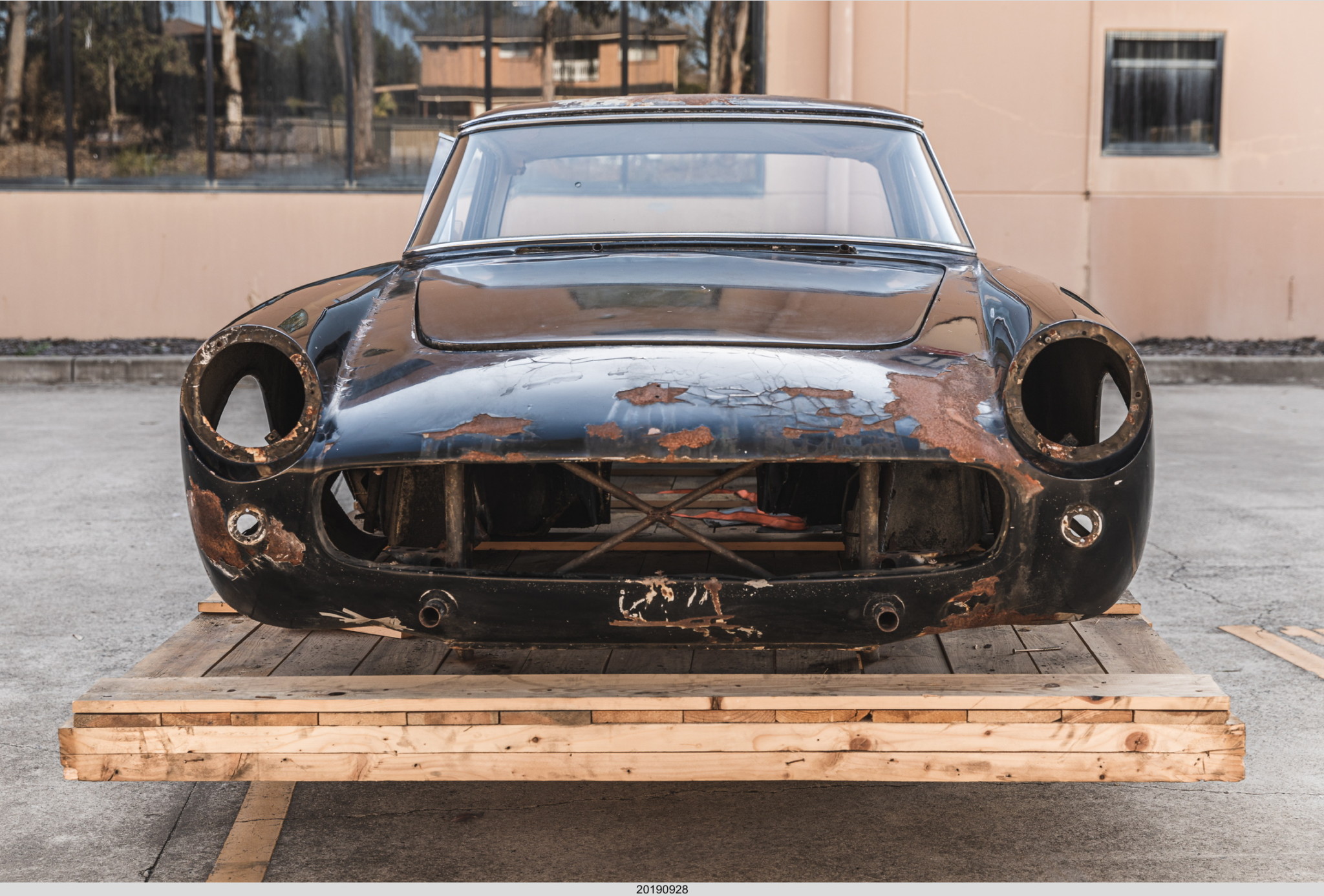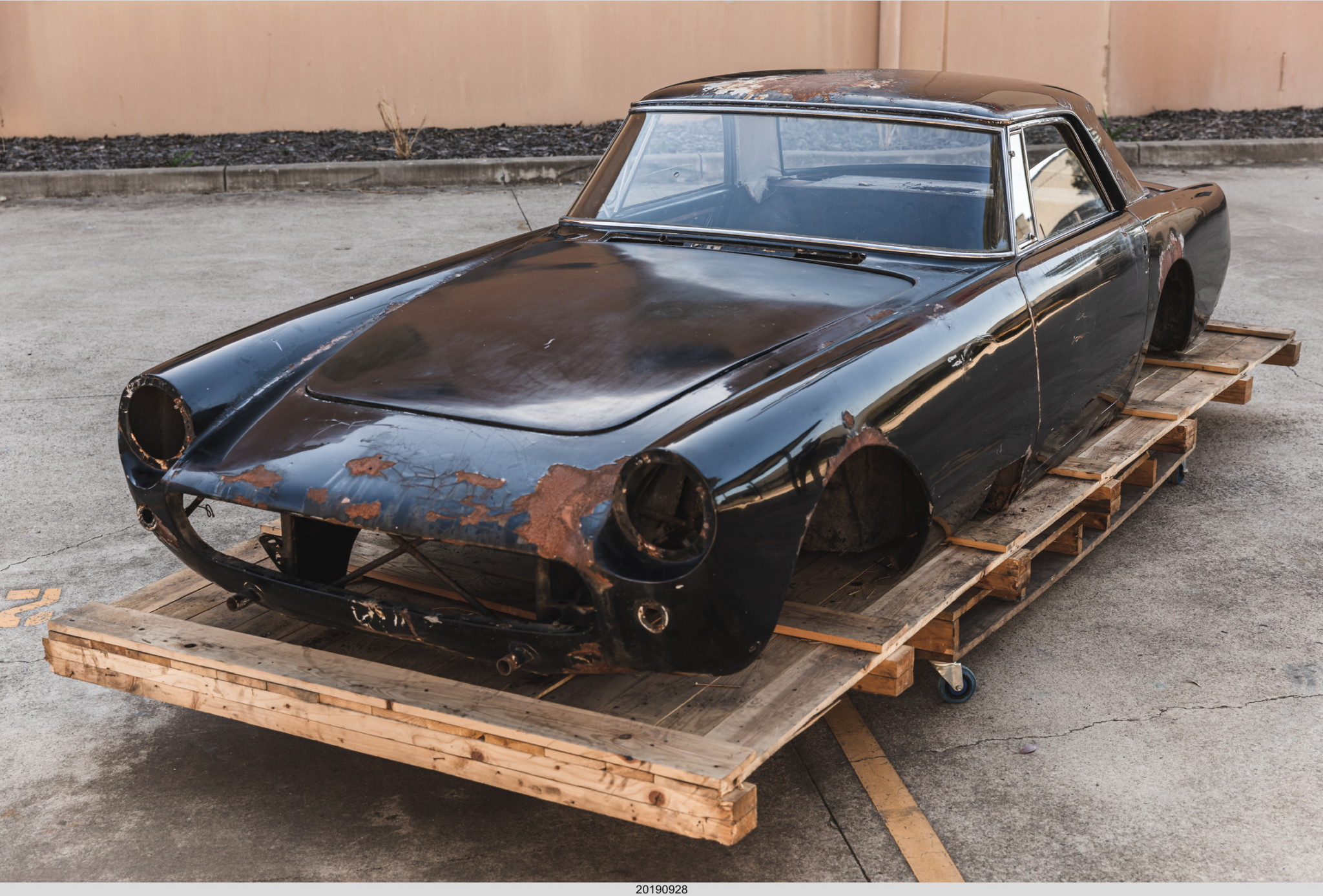 Areas of flaking are visible in the black paint, with rust evident on the exposed steel. Sections of the body were cut when the car was separated from the chassis, and metal repair is required on the lower sections of the body including the rocker panels, lower front fenders, trunk floor, and rear valance.