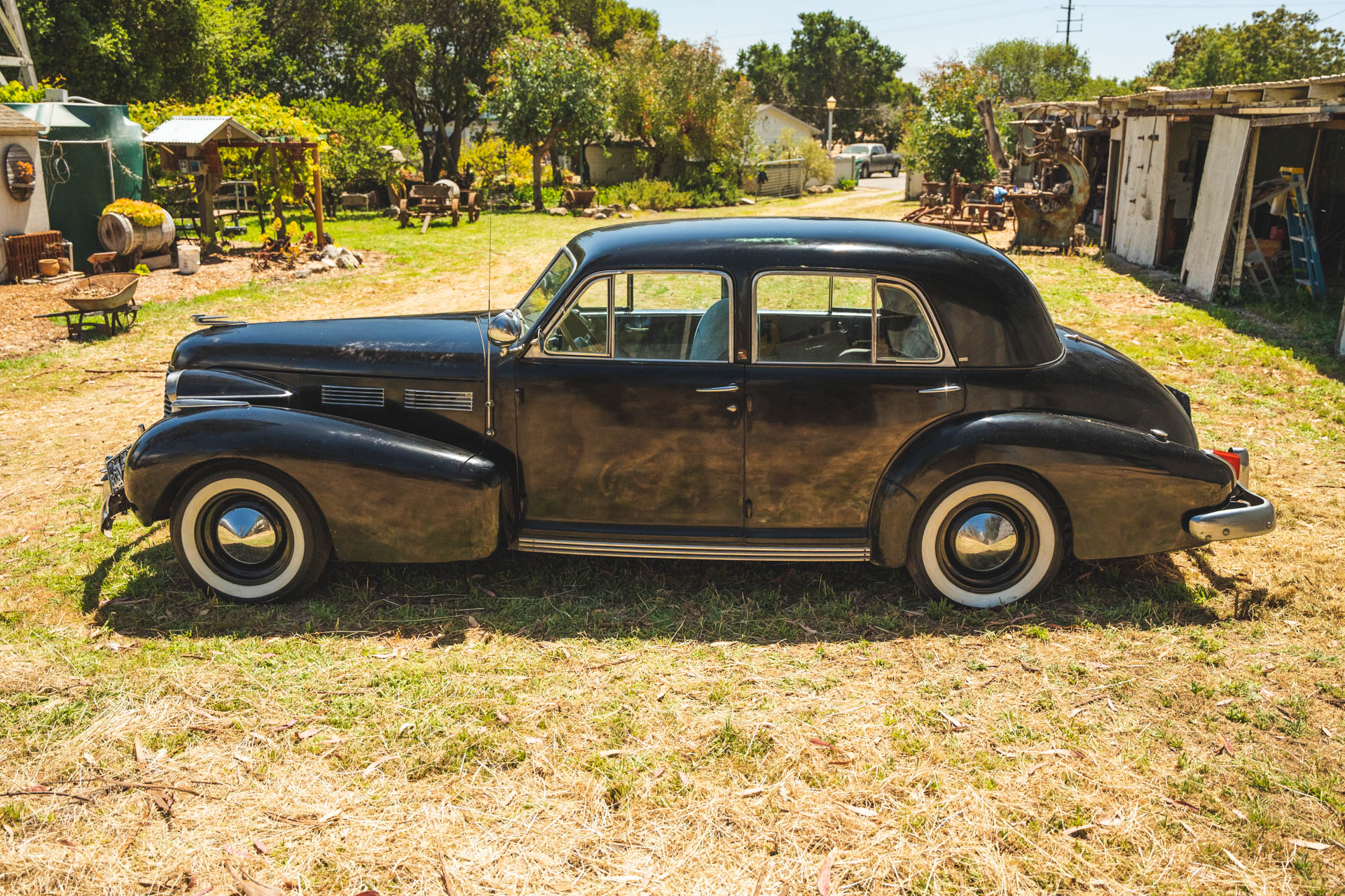 Body-color wheels wear chrome hubcaps, and they are mounted with Columbia Deluxe bias-ply whitewall tires. A spare wheel is stowed beneath the trunk floor. The 60 Special rode on a 127″ wheelbase and featured an X-frame chassis with a coil-sprung independent front suspension and rear semi-elliptical leaf springs. The car retains hydraulically assisted drums at all four corners.