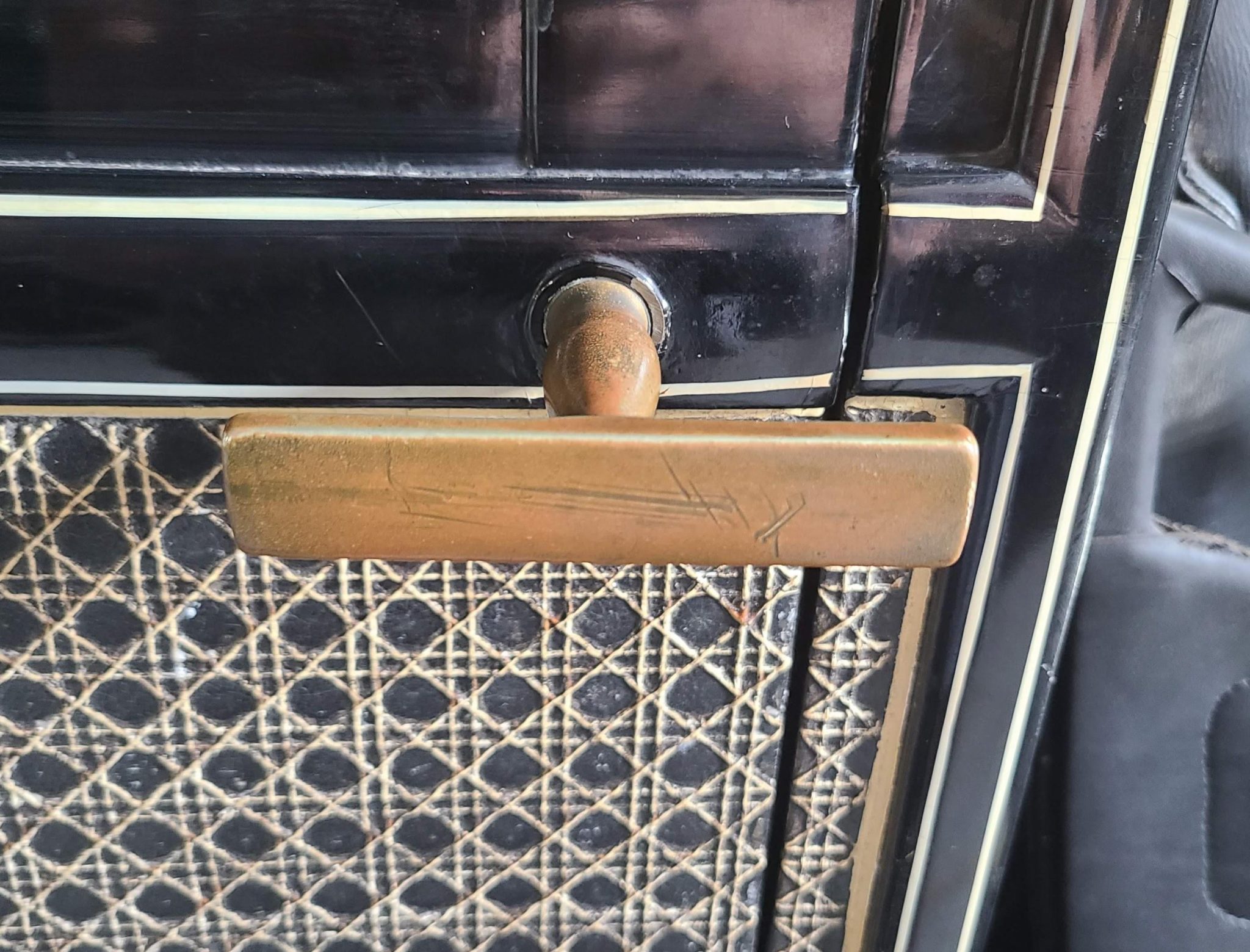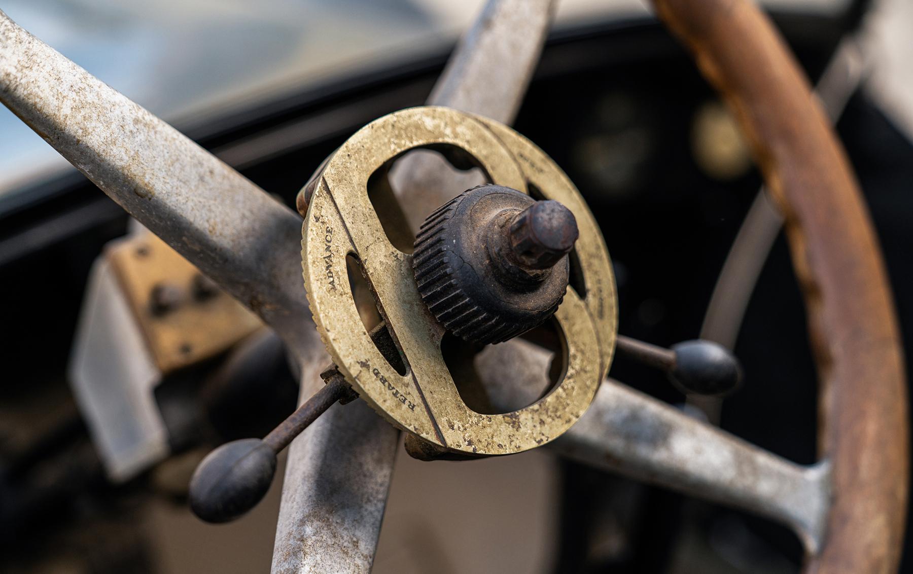 This example’s front coachwork is finished in green with leather chauffeur’s doors and side panels, while the rear compartment is finished in black with cream-color caning, pinstriping, and monograms. Crazing and peeling of the finish are present on the wood front side panels and metal grille shell, and a tear is present in the retractable fabric chauffeur’s roof. Cracks and bubbling are present across the passenger-compartment windows. Features include front and rear bumpers, Lecalite headlights, a Klaxon horn, a two-piece windshield, and dual side mirrors.