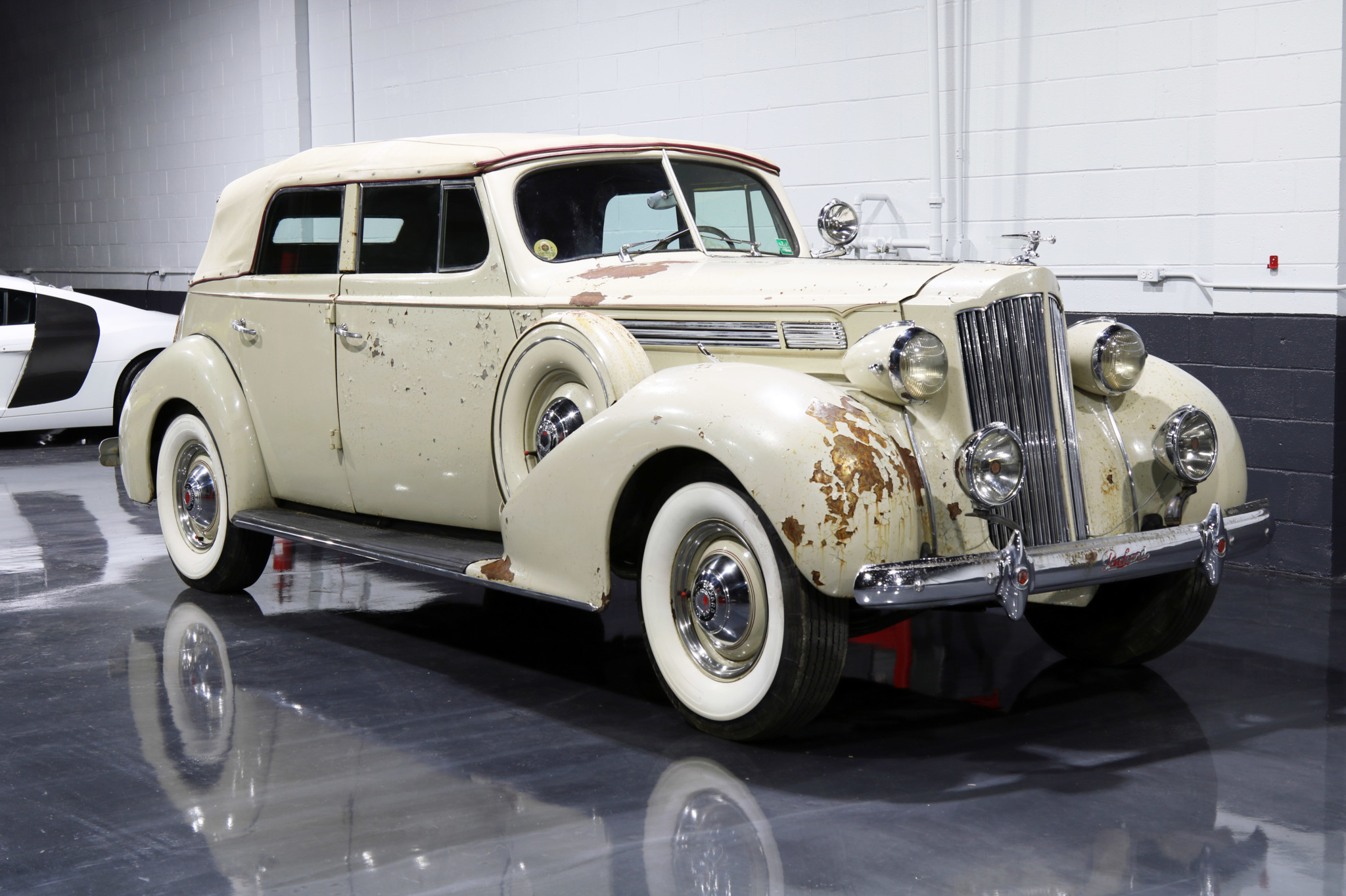 Exterior equipment includes fog lamps, a driver’s-side spotlight, and a fender-mounted spare tire. Painted steel wheels with pinstripes are equipped with polished beauty rings, chrome caps, and whitewall tires.