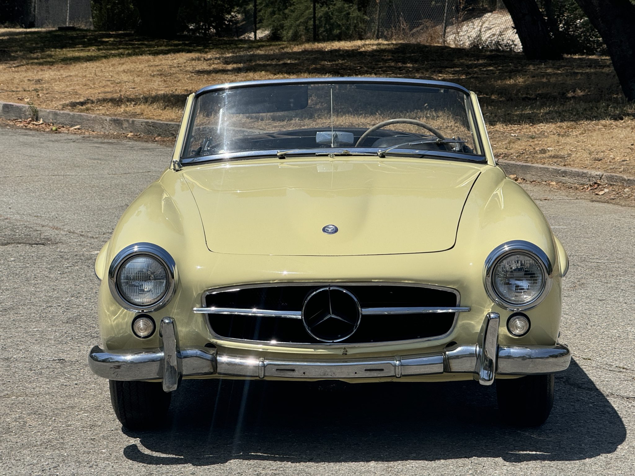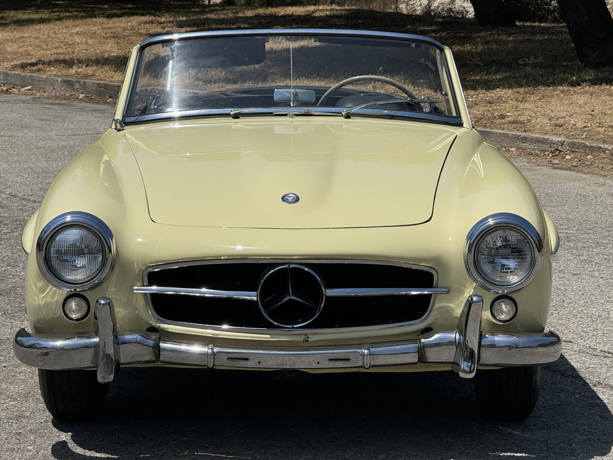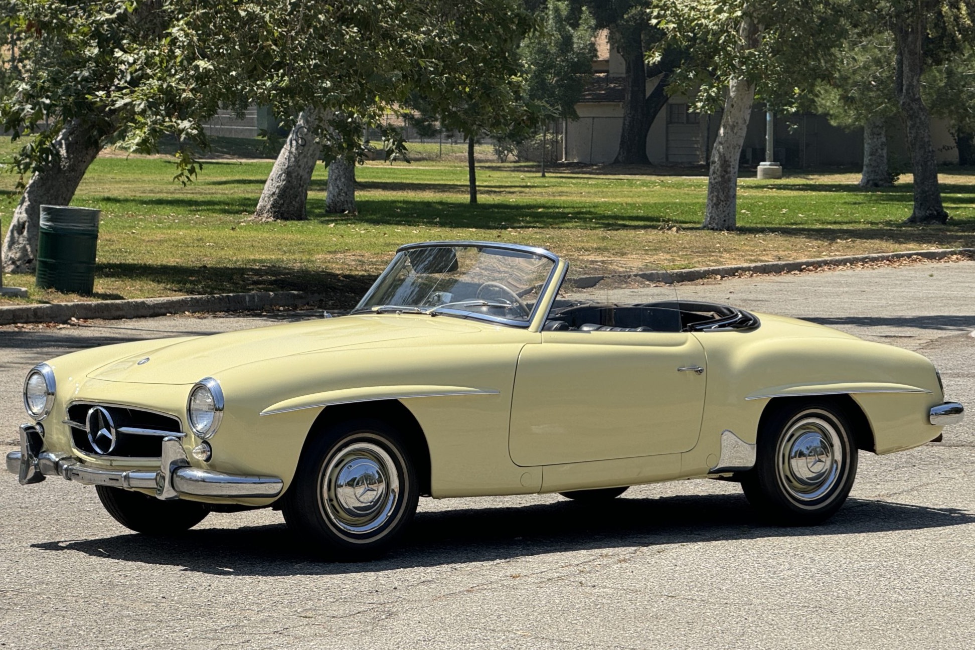 The 13″ steel wheels are painted to match the body and wear chrome trim rings and hubcaps. The Cornell whitewall tires need replacement. The 190SL was factory equipped with double-wishbone front suspension, a rear swing axle with coil springs, and power-assisted drum brakes.