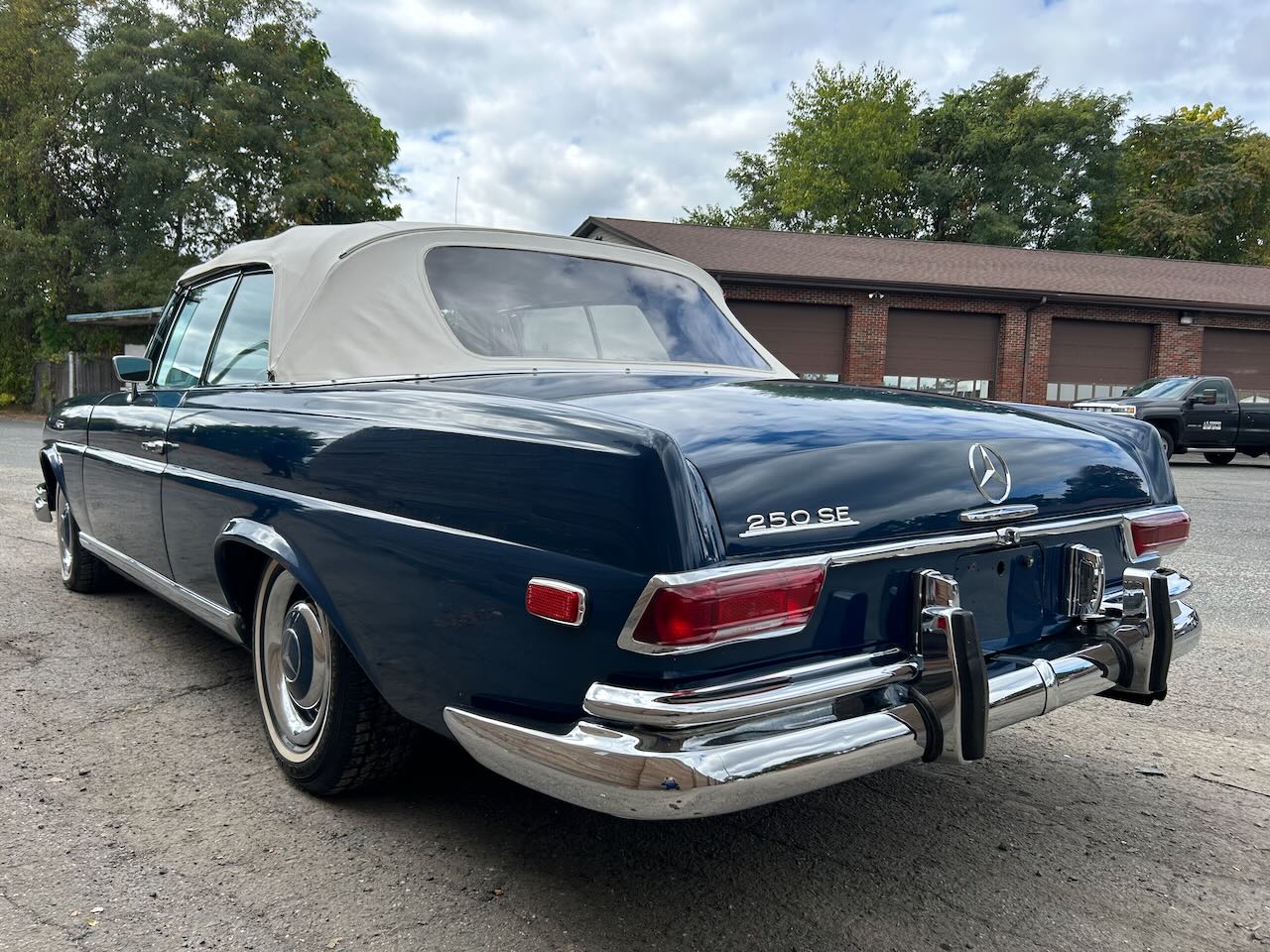 Body-color steel wheels wear chrome trim rings, color-matched hubcaps, and older Nitto whitewall radial tires that should be replaced due to age. A matching spare wheel is stowed in the trunk. A brake fluid flush was performed in preparation for the sale, and the calipers were serviced. The seller notes that the left front brake caliper drags and recommends further servicing of the brakes.