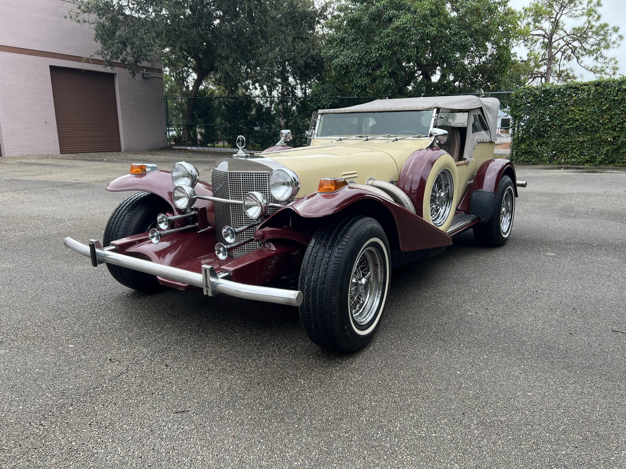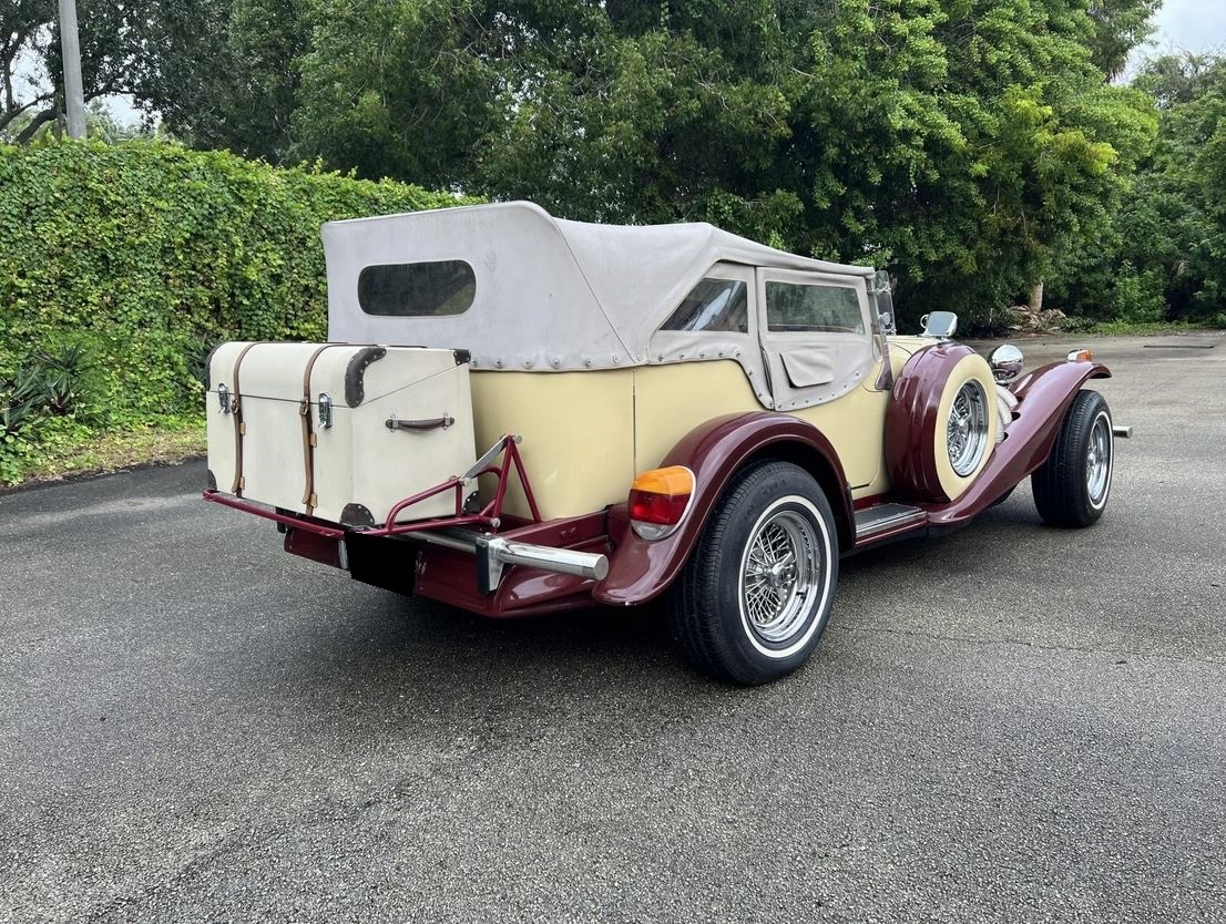 The indicators and taillights were sourced from a Volkwagen Beetle, and further exterior details include a center-hinged hood with louvered panels, quad trumpet-style horns, a chrome light bar with dual driving lamps, wind wings, running boards with black rubber treads, exposed exhaust header pipes, rear-fender stone guards, and a drop-down luggage rack with a steamer-style trunk. Cracking and other flaws in the finish are shown in the gallery along with corrosion on various hardware components and pitting on a number of chrome pieces. A rubber-faced guard is missing from the front tube-type bumper.