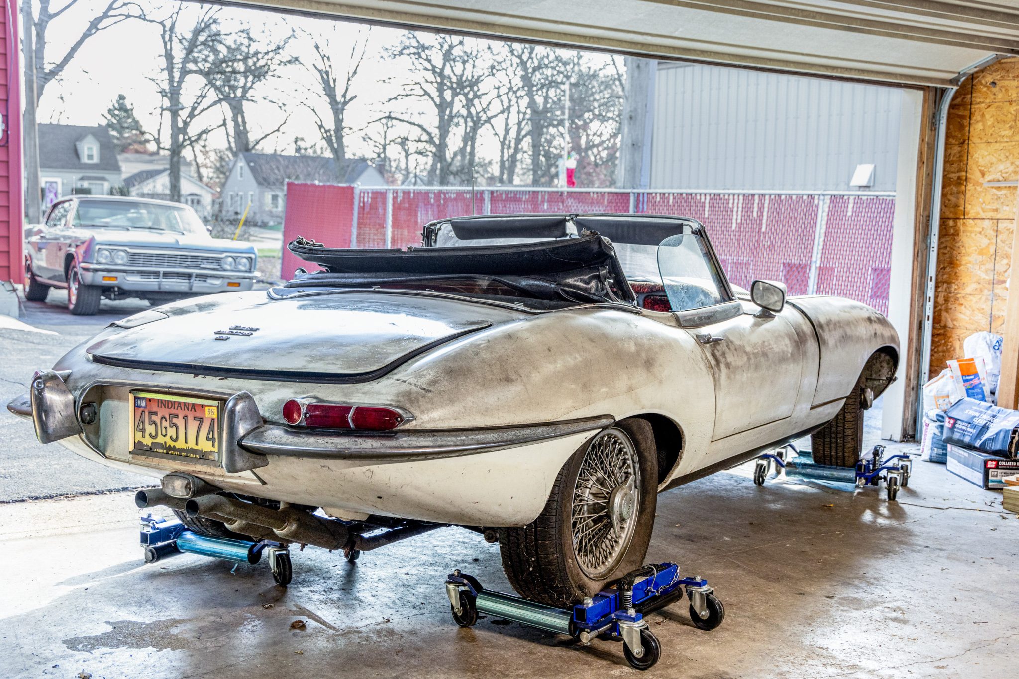The 15″ wire wheels are secured by two-eared knock-offs and are mounted with General tires measuring 205/70. Braking is provided by four-wheel discs with inboard-mounted rear rotors.