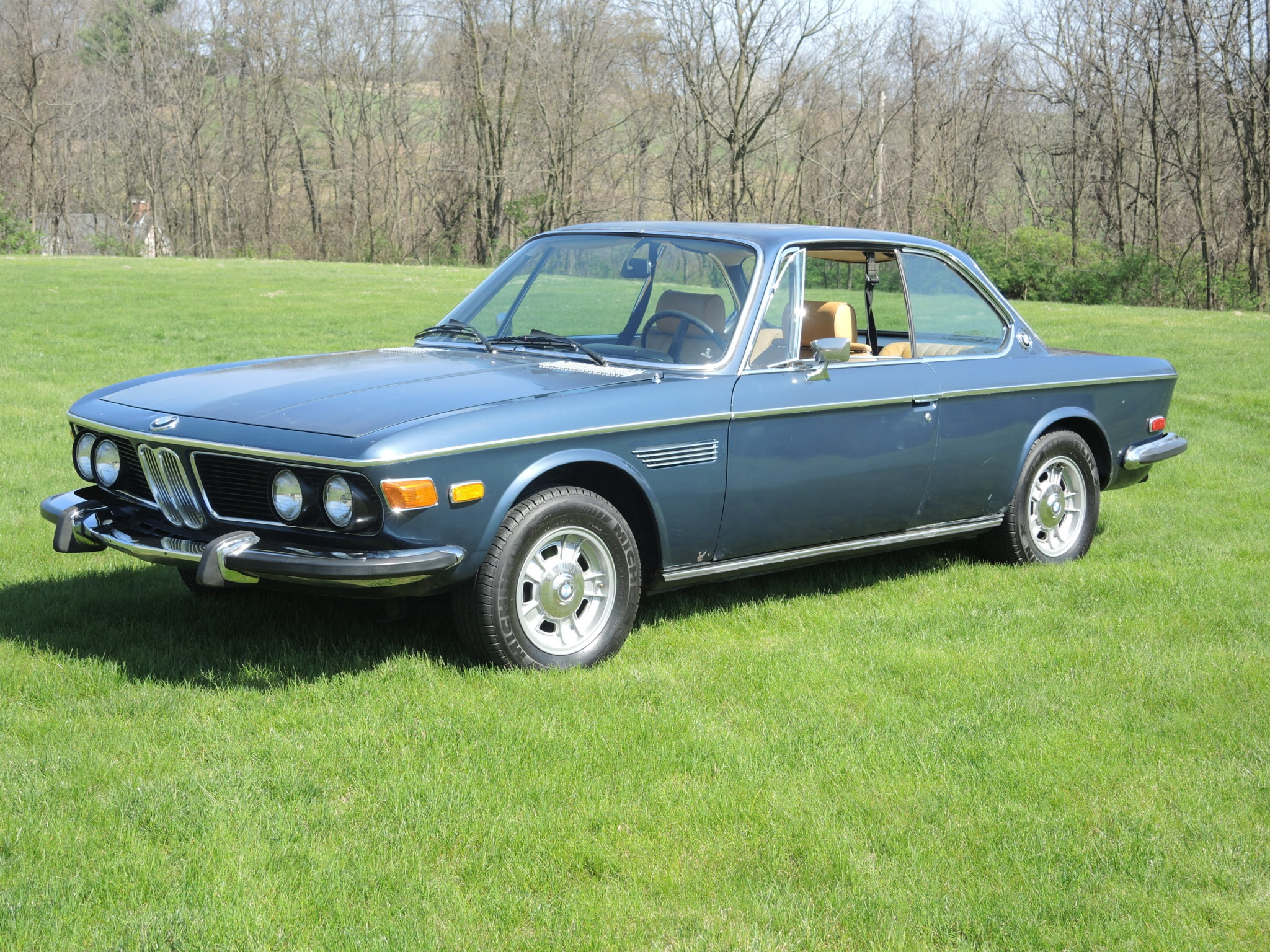 Factory 14″ alloy wheels are fitted with chrome BMW hubcaps and older Michelin tires. The seller states that the suspension requires servicing. Retained brightwork includes belt-line trim, side grilles, cowl vents, bumpers, trapezoidal mirrors, and window trim.