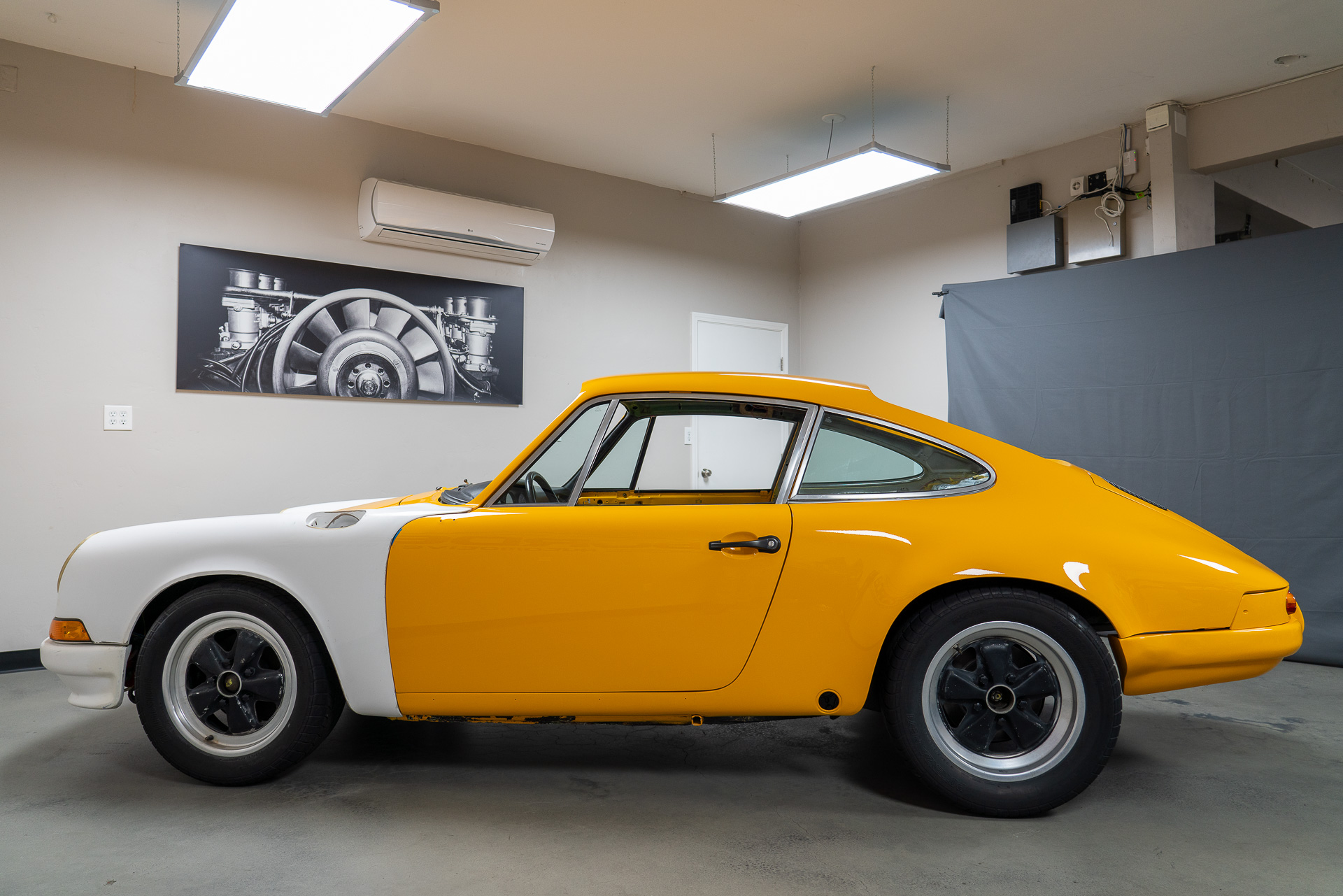 The car rides on a modified suspension with Elephant Racing poly bronze bushings, 21mm front torsion bars, 28mm rear torsion bars, and green Bilstein dampers. The Fuchs wheels measure 16×6″ up front and 16×7″ out back.