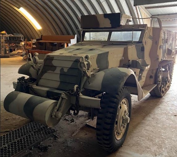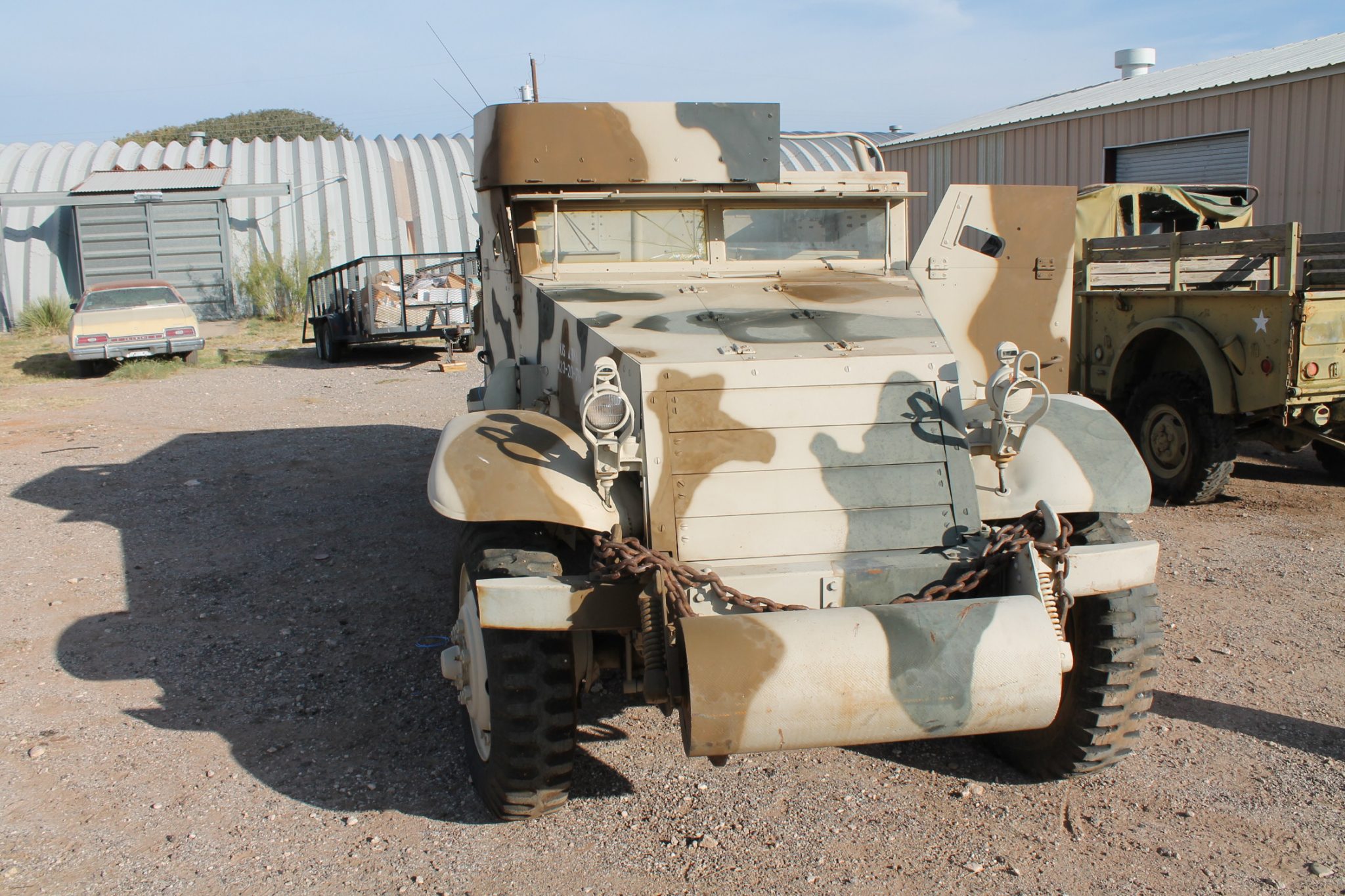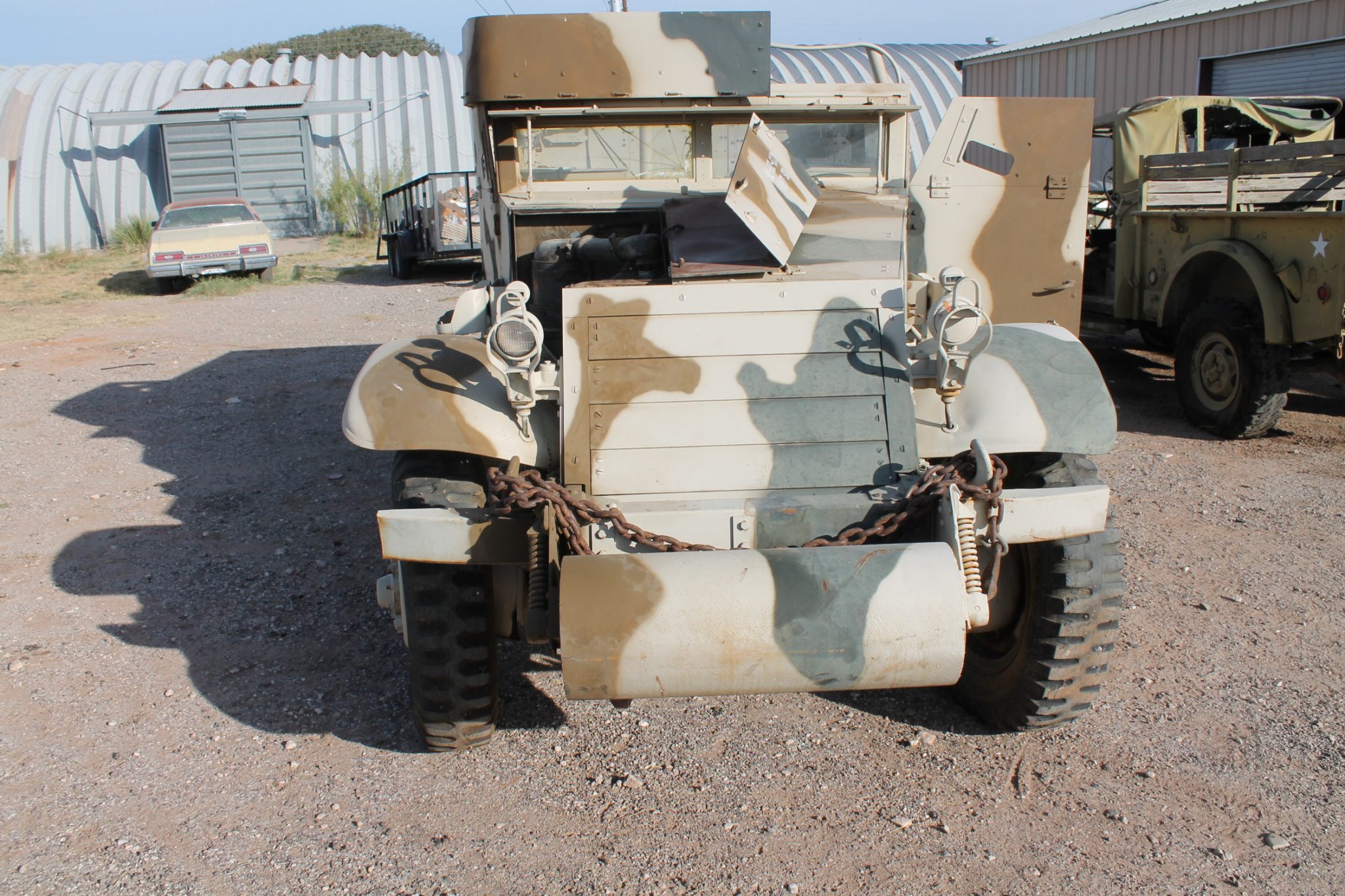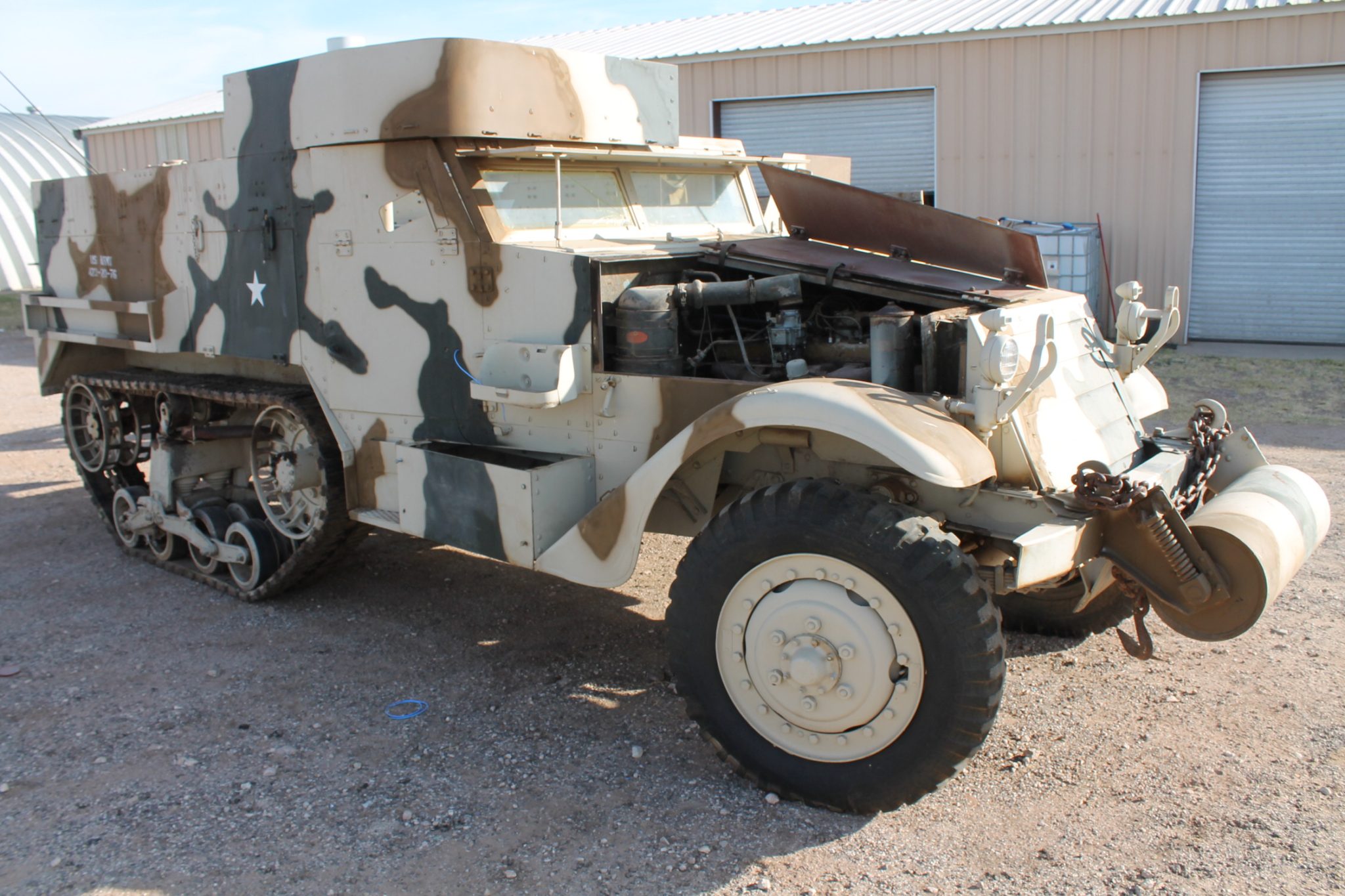 Multi-piece 20″ front steel wheels are mounted with a mixed set of 8.25-20 military-style tires, while each rear track drive is equipped with a front drive sprocket, four road wheels, a support roller, a compensating idler, and steel treads with a deteriorated rubber coating. The suspension features leaf springs up front and vertical volute springs out back. Braking is handled by hydraulically assisted drums.