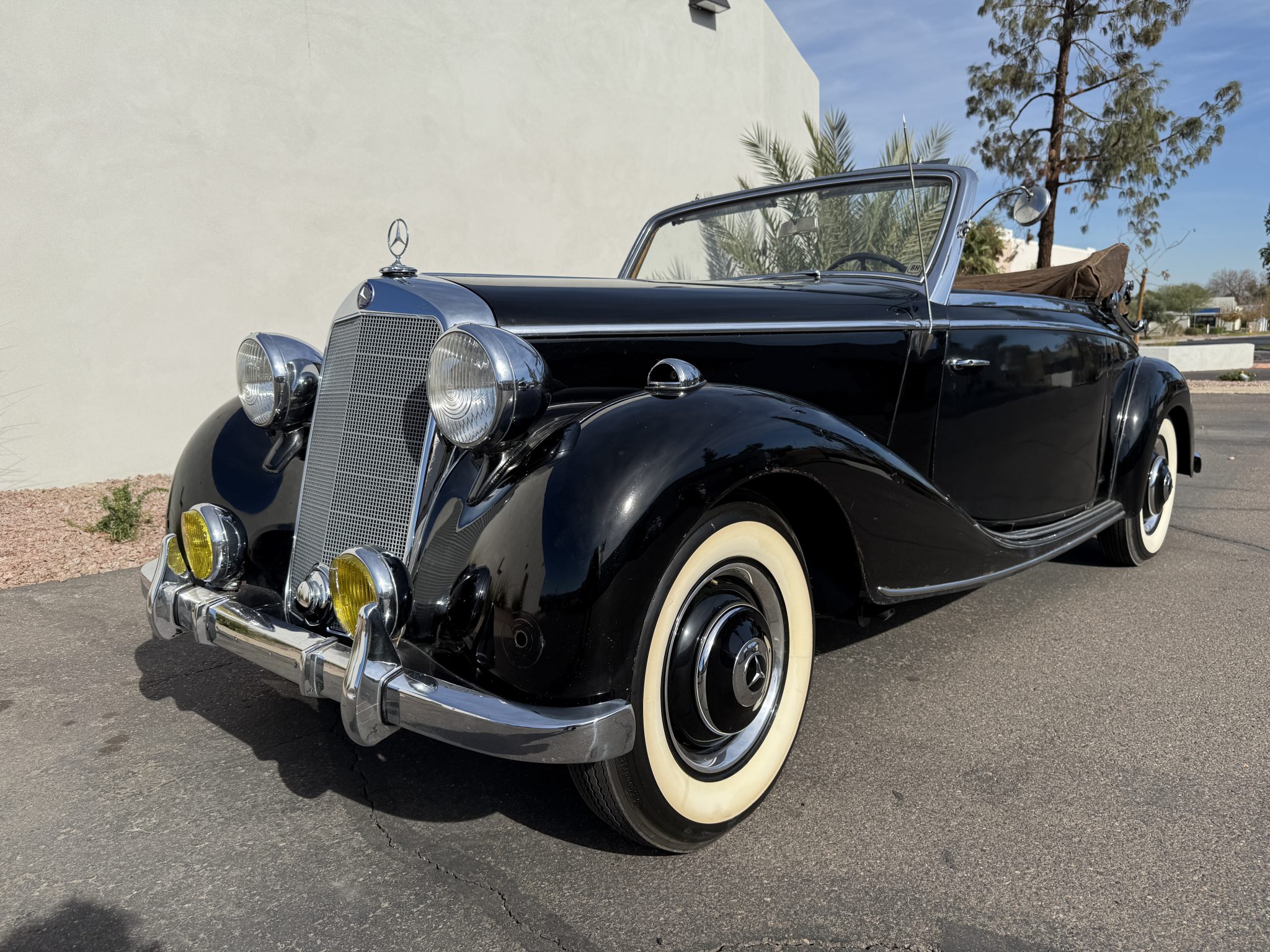 Painted steel wheels wear body-color hubcaps and are mounted with BFGoodrich Silvertown whitewall tires. The car is equipped with double-wishbone front suspension, a coil-sprung rear swing axle, and four-wheel drum brakes, the latter of which were reportedly serviced in preparation for the sale.