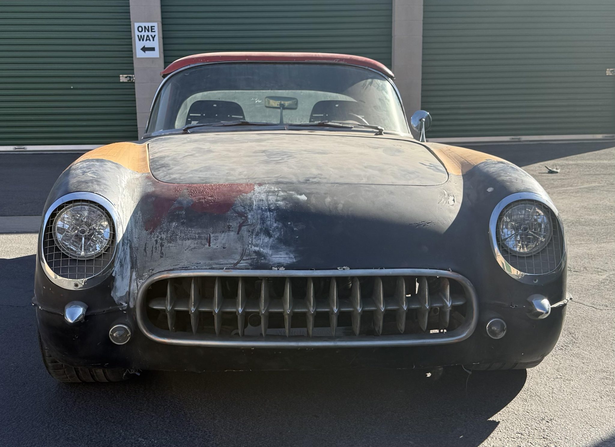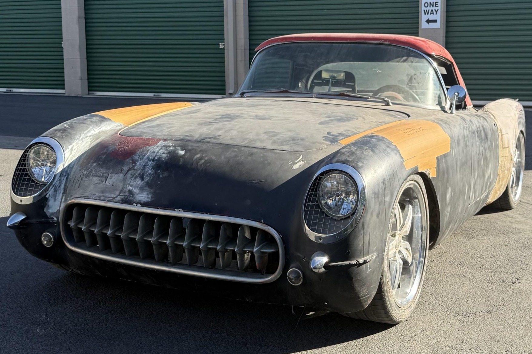 An Art Morrison chassis has been installed, and the car has five-spoke Foose wheels. Components of the four-wheel disc brakes remain, though the brake lines, shocks, and other parts are missing.