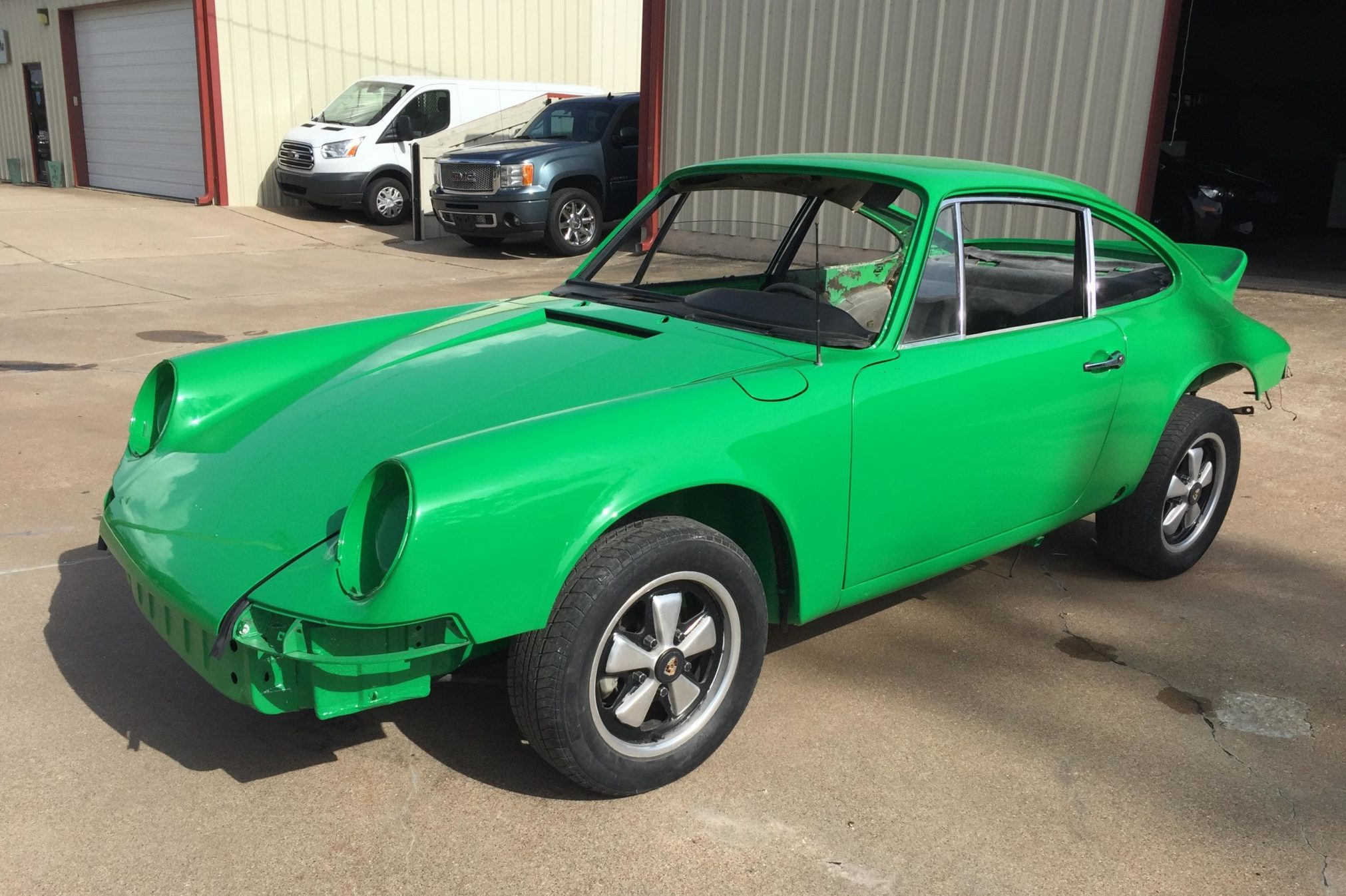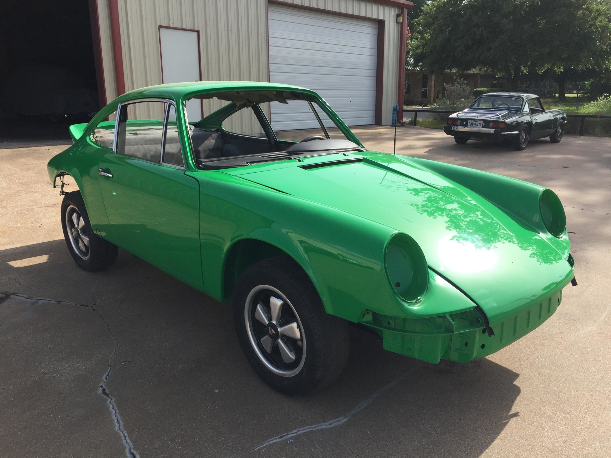 The passenger-side window and both front quarter windows are installed, while the remaining glass is said to be included in the sale. The car rolls on black Fuchs wheels with polished centers.