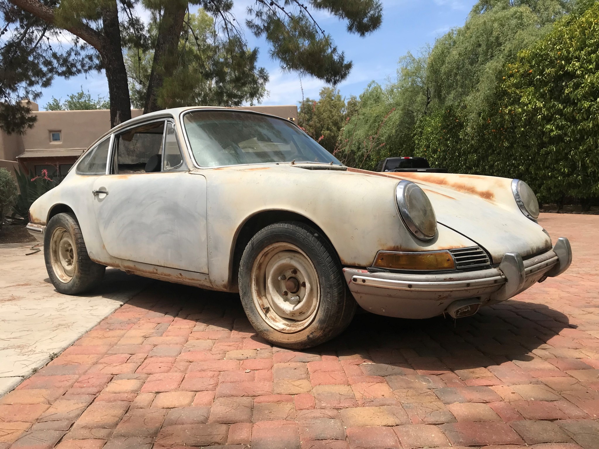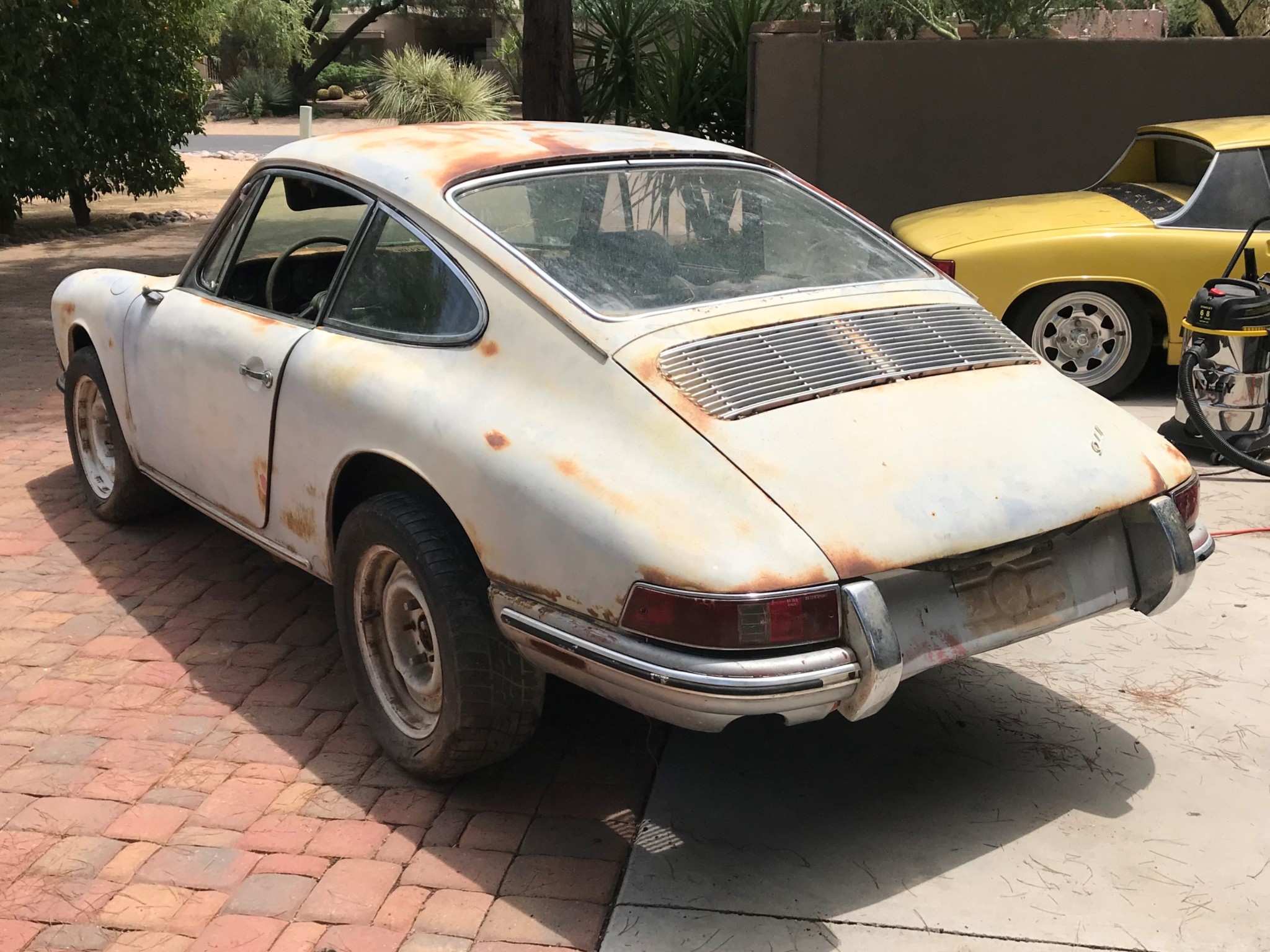 Side window glass is present, though the roll-up windows are frozen in place. The car currently sits on wider 15″ steel wheels because the previous wheels were stolen years ago. The fog lights lenses and Talbot side mirror are missing.