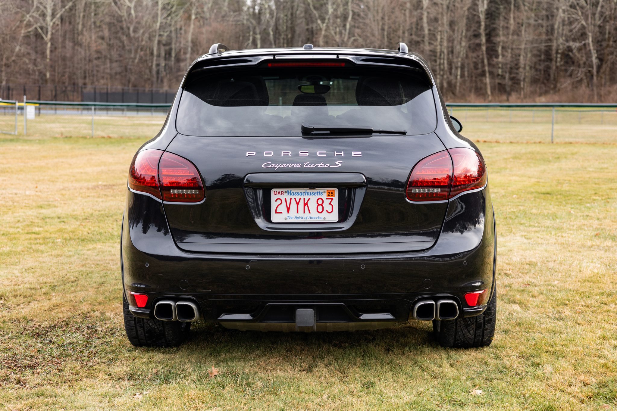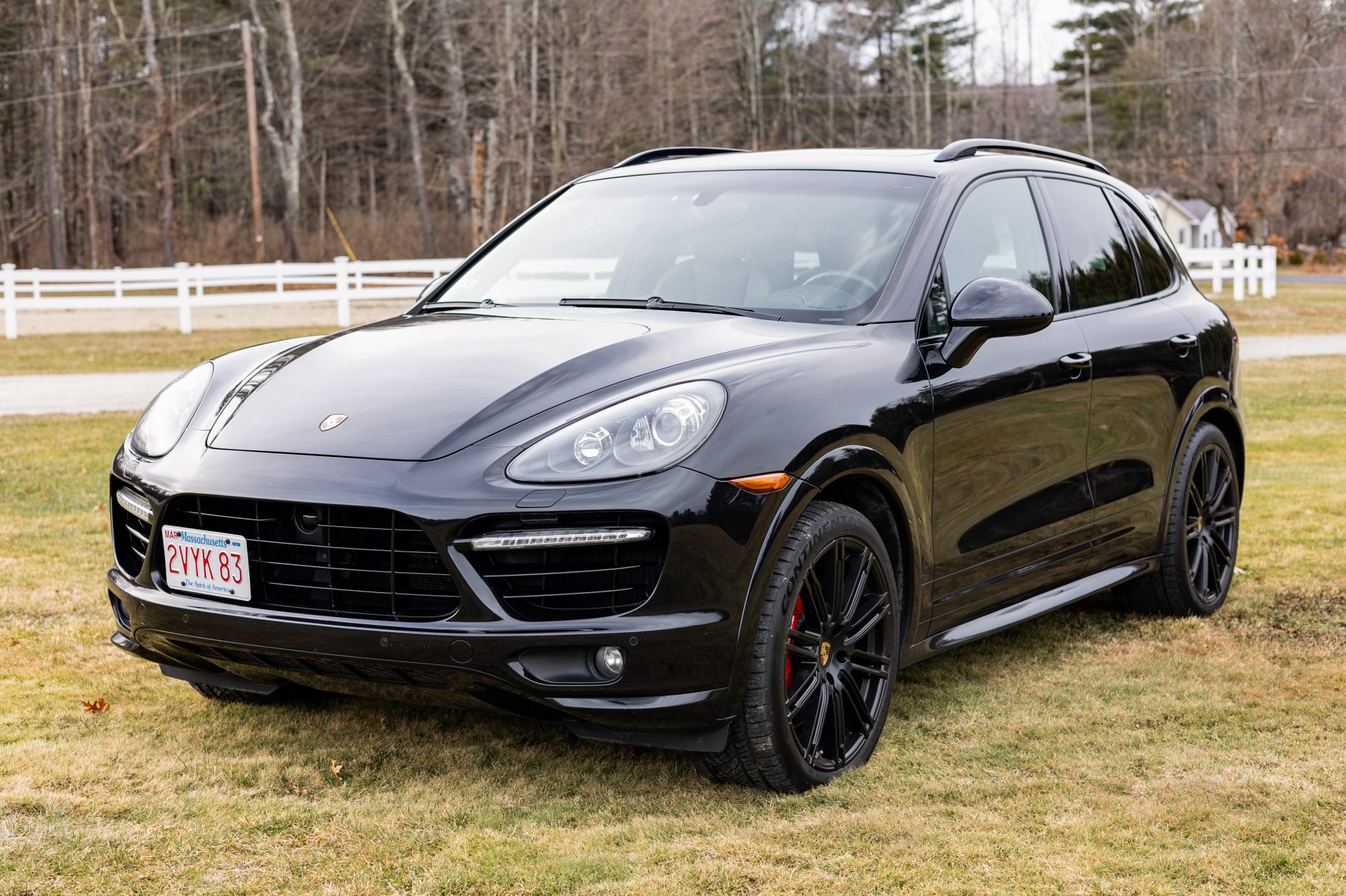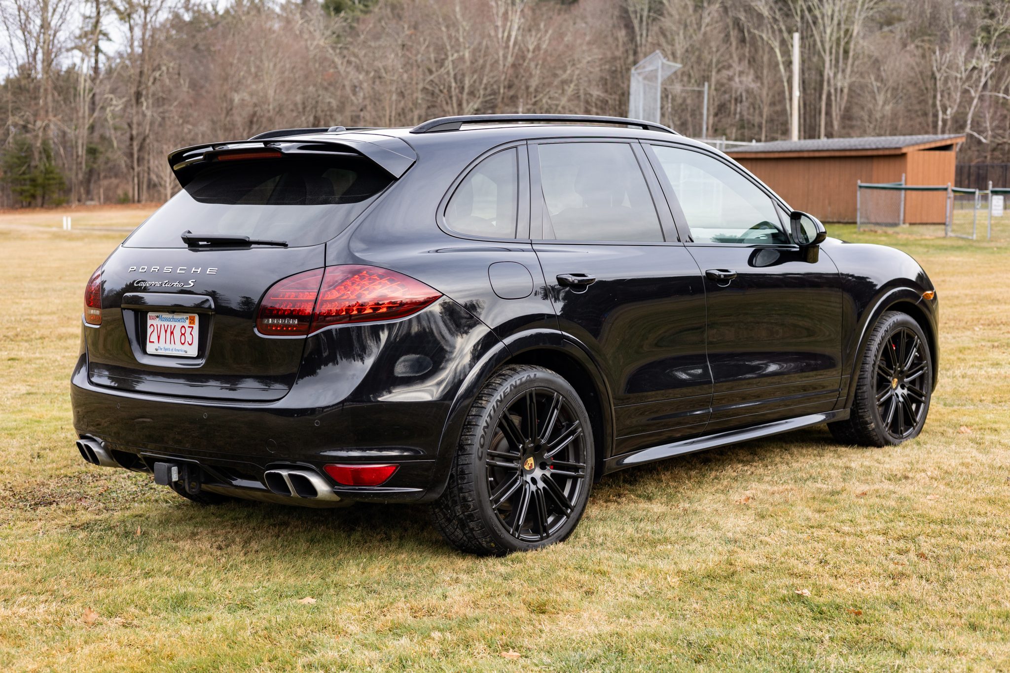 Black 21″ Cayenne SportEdition alloy wheels were mounted with 295/35 Continental ExtremeContact DWS06 Plus tires in October 2024. The SUV is equipped with an adjustable air suspension, Porsche Active Suspension Management (PASM), Porsche Dynamic Chassis Control (PDCC), and Power Steering Plus. Stopping power is provided by red-finished six-piston front and four-piston rear brake calipers over ventilated rotors at each corner, and the front brake pads and rotors were replaced in July 2023.
