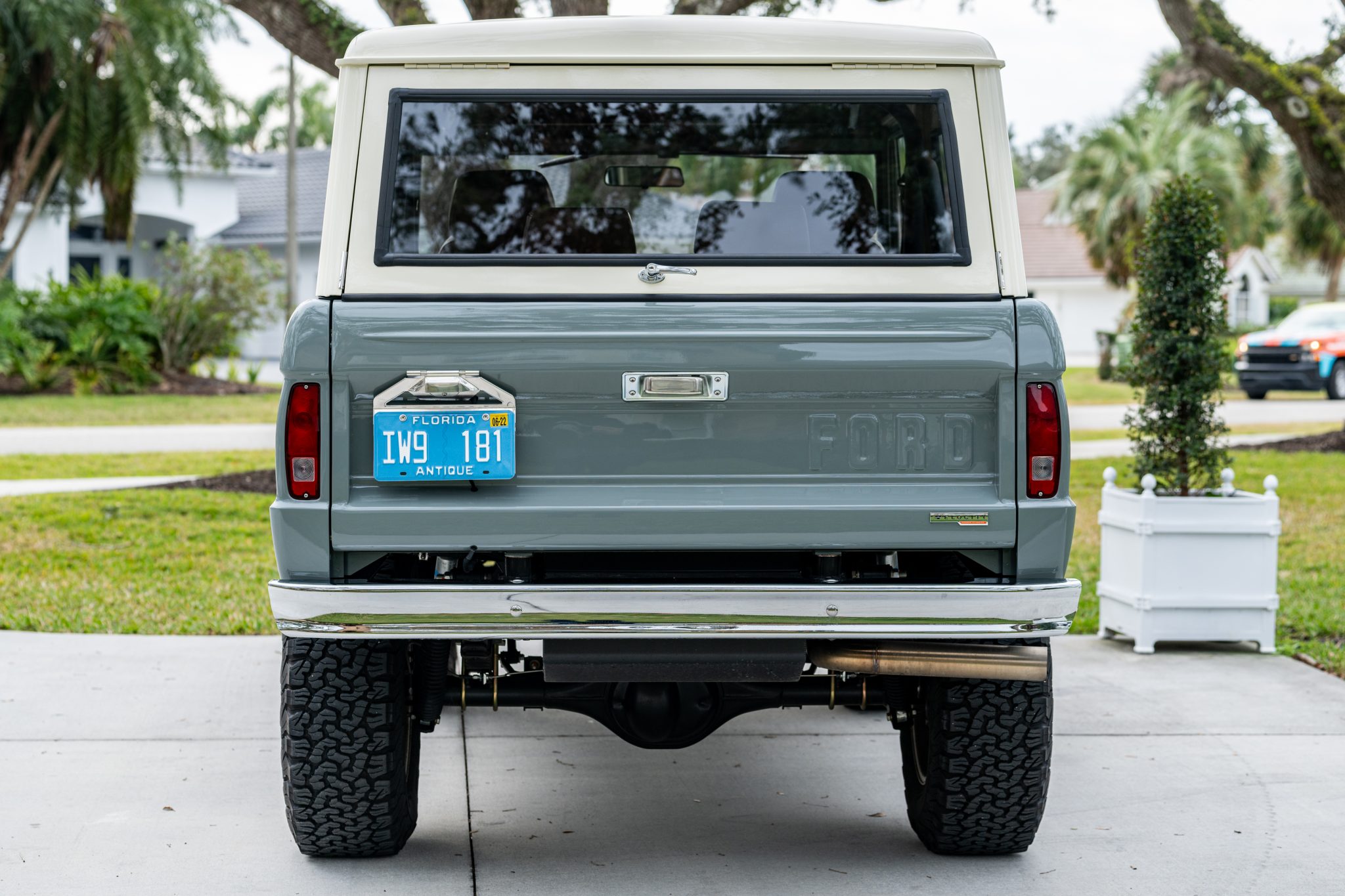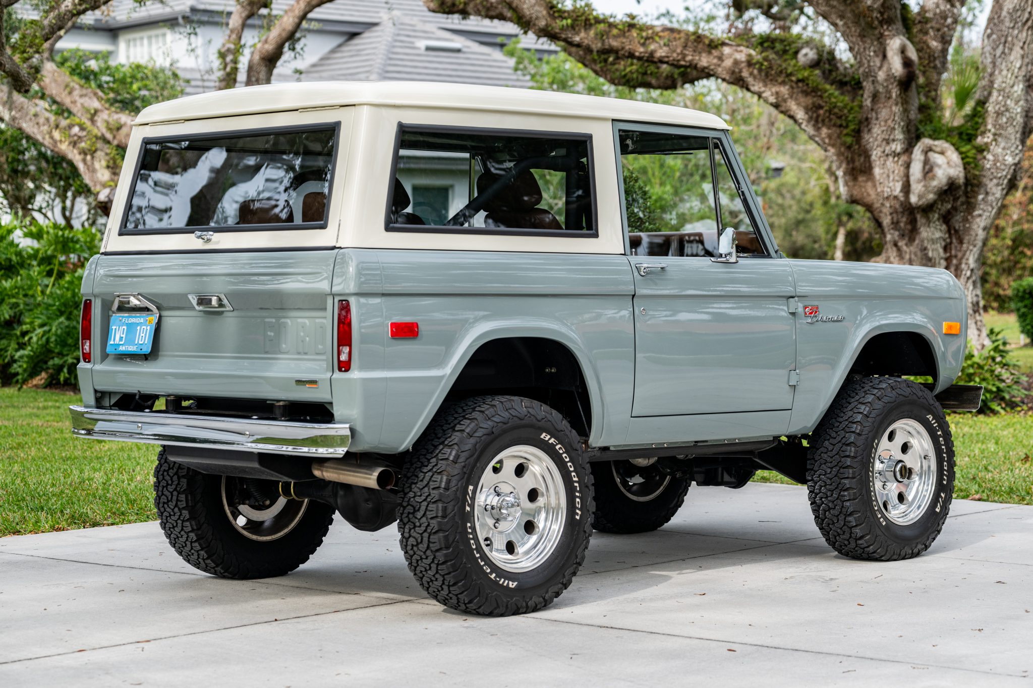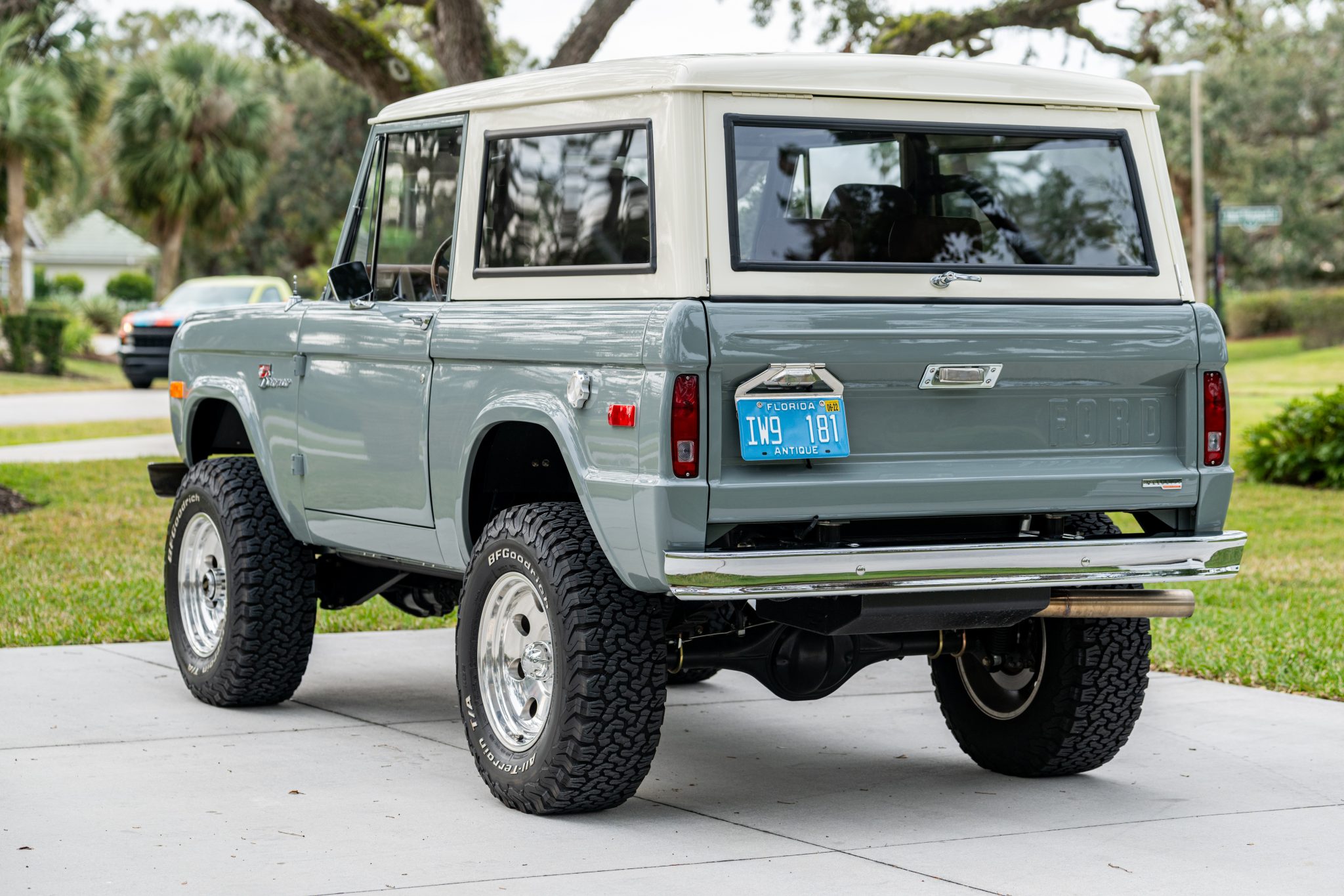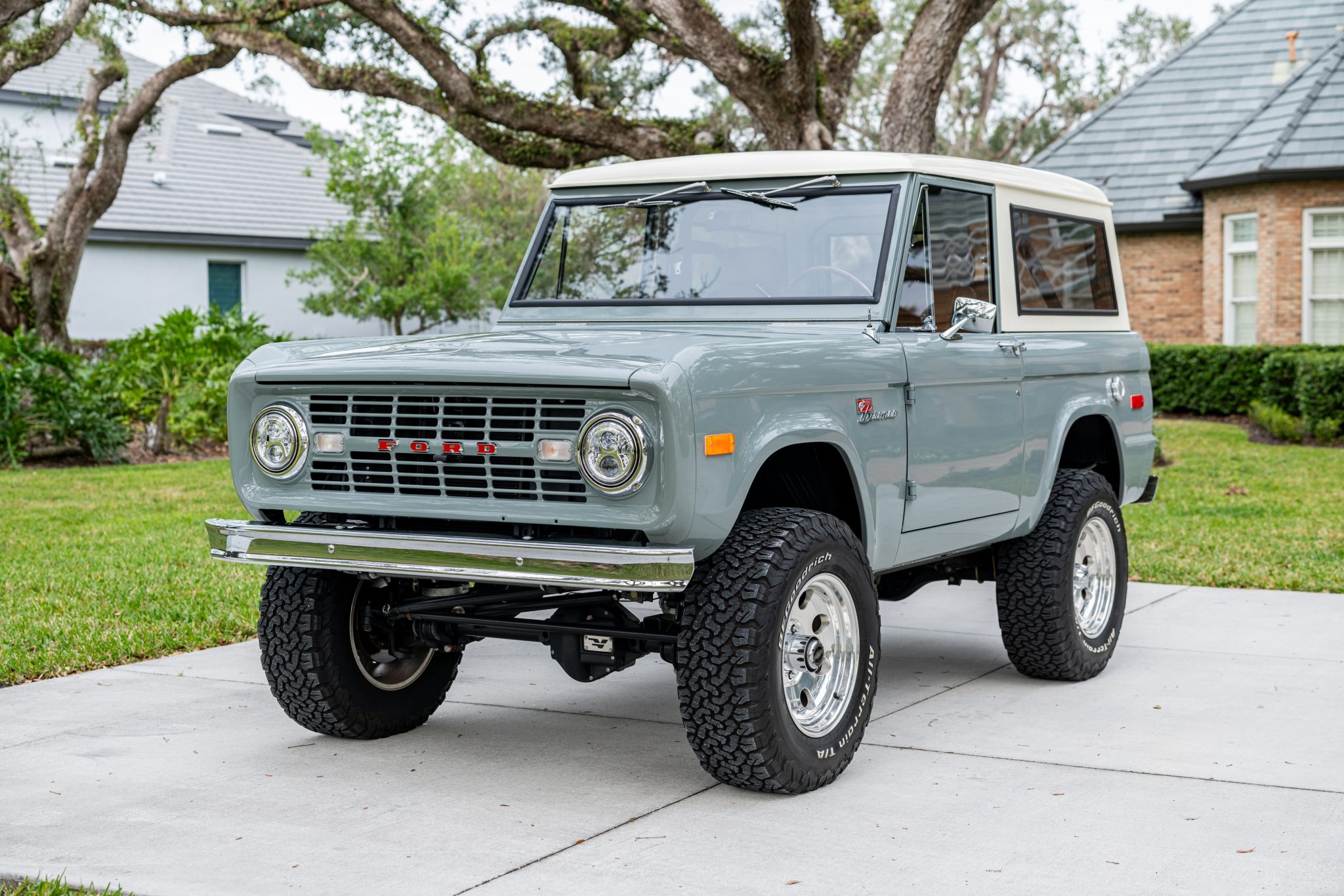 The 17″ Pacer alloy wheels are wrapped in 285/70 BFGoodrich All-Terrain T/A K02 white-letter tires. The truck rides on a 2″ suspension lift with Bilstein shock absorbers along with a 1″ body lift. Warn manually locking hubs are mounted up front, and aftermarket radius arms have been retrofitted. Stopping power is provided by Wilwood hydroboosted four-wheel disc brakes.