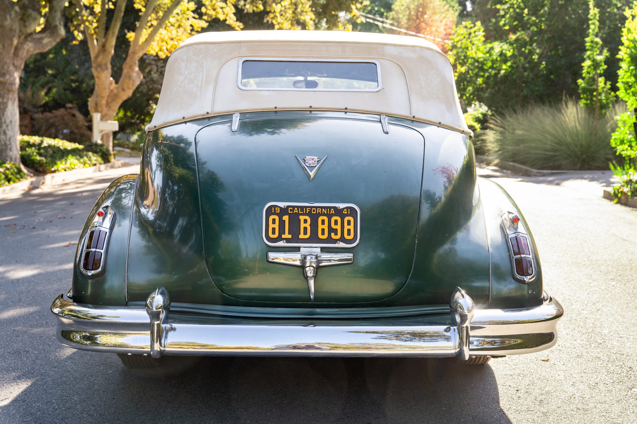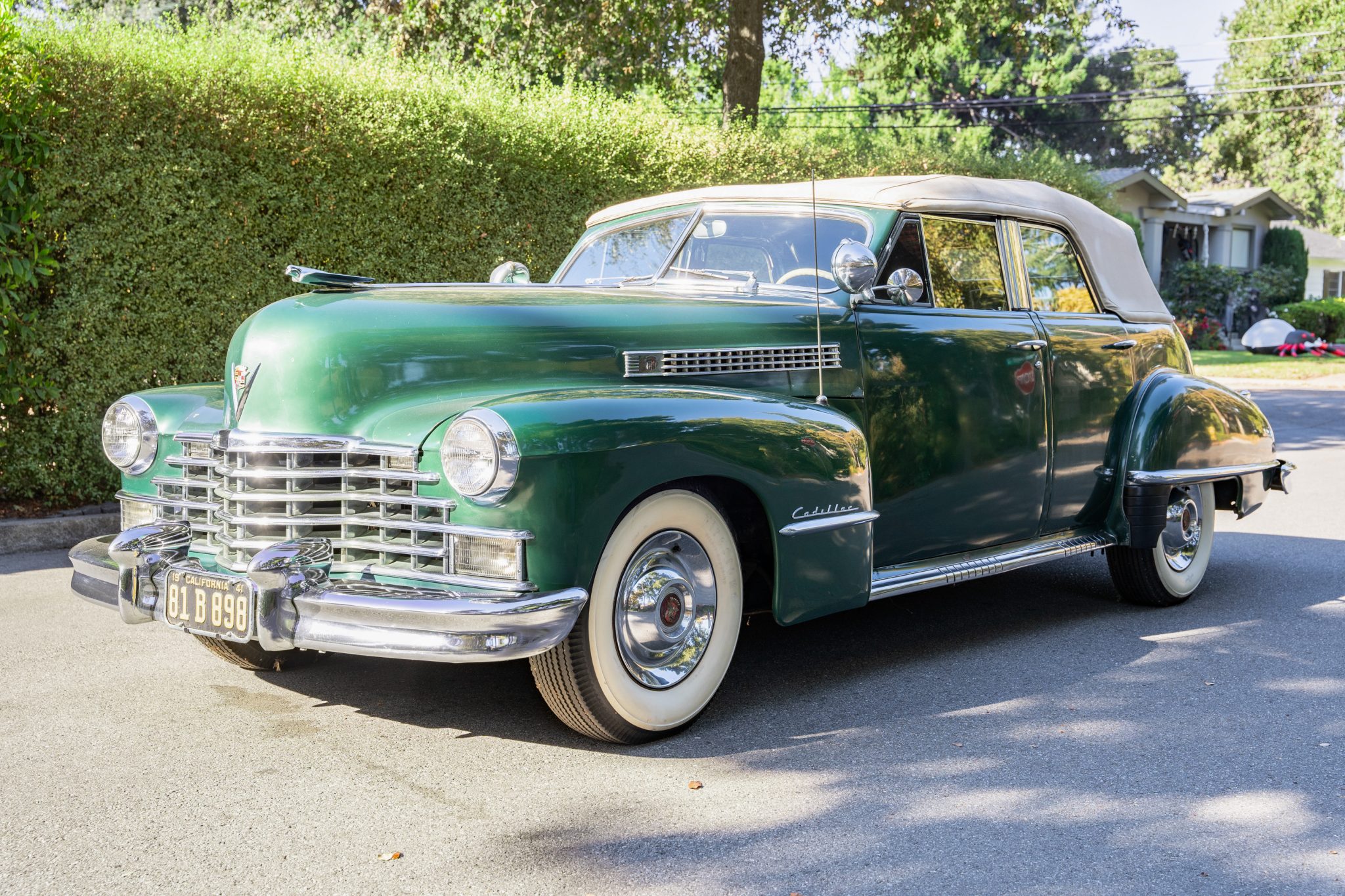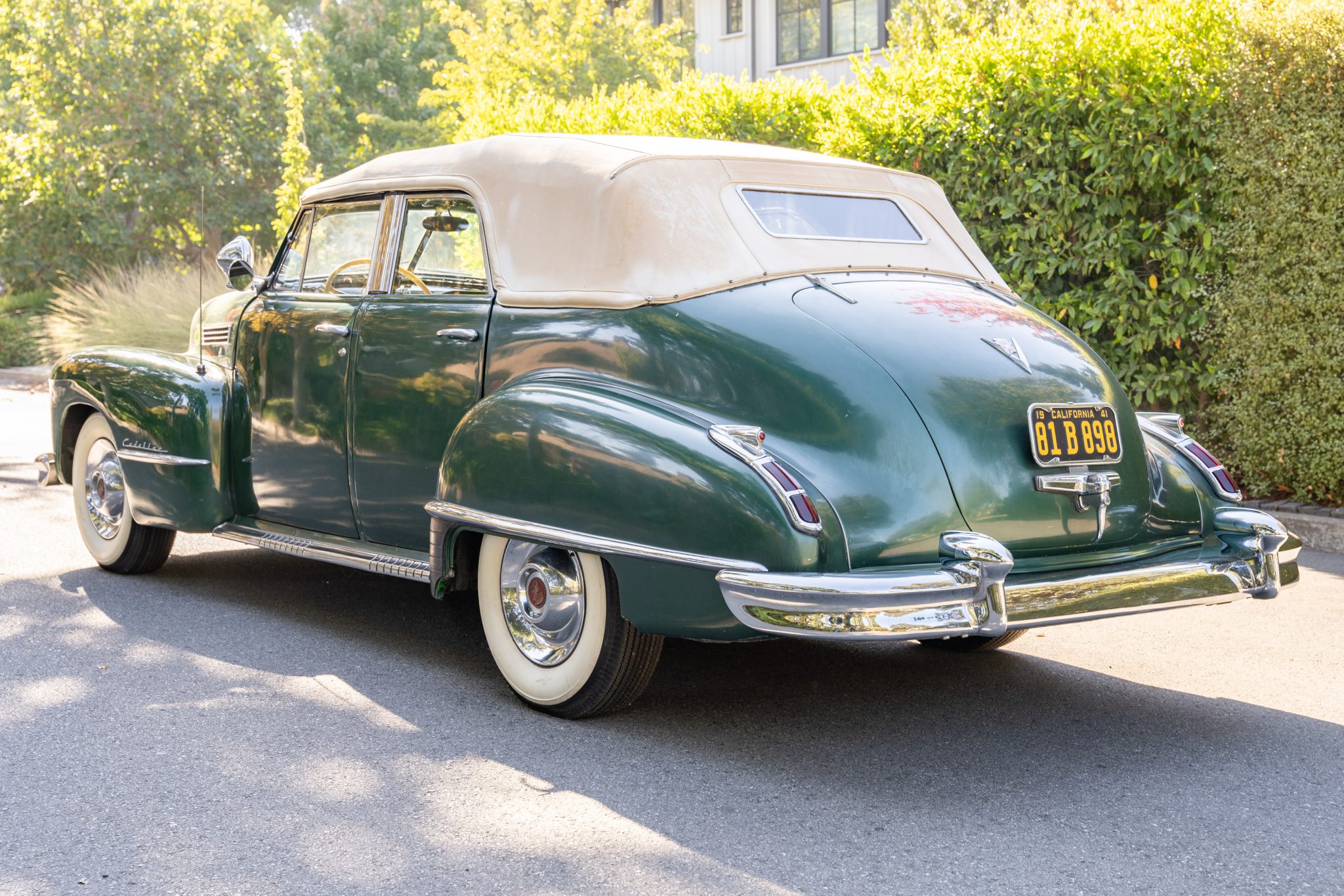 Black-painted steel wheels wear chrome covers and are mounted with 7.00-15 Firestone Deluxe Champion bias-ply wide whitewall tires. A full-size spare wheel and tire are stowed in the trunk. The Series 62 rides on a 126″ wheelbase and features a coil-sprung independent front suspension as well as a live rear axle with leaf springs. Stopping power is provided by hydraulically assisted drums at all four corners.