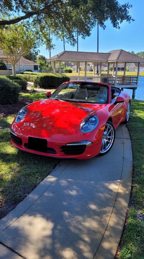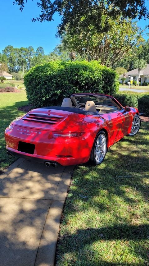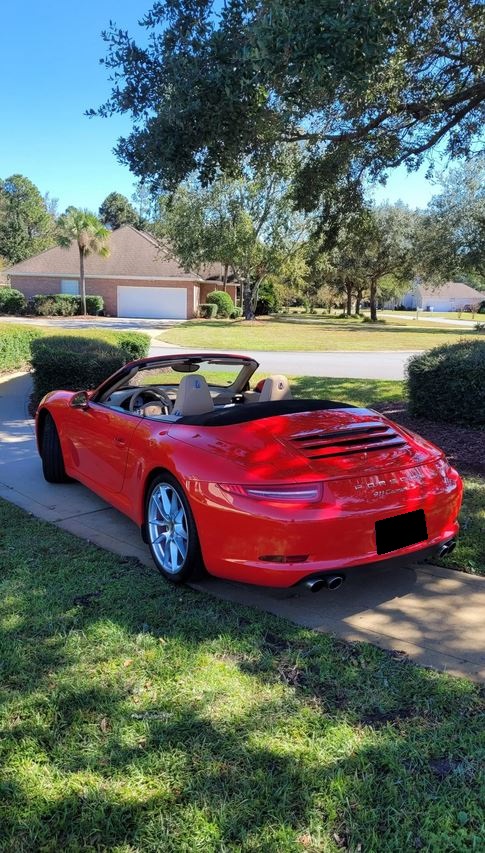 The 20″ Carrera S alloy wheels are mounted with Pirelli tires. Braking is handled by red-painted Porsche-branded calipers over cross-drilled and ventilated discs. The car is equipped with Porsche Active Suspension Management (PASM) and Power Steering Plus.