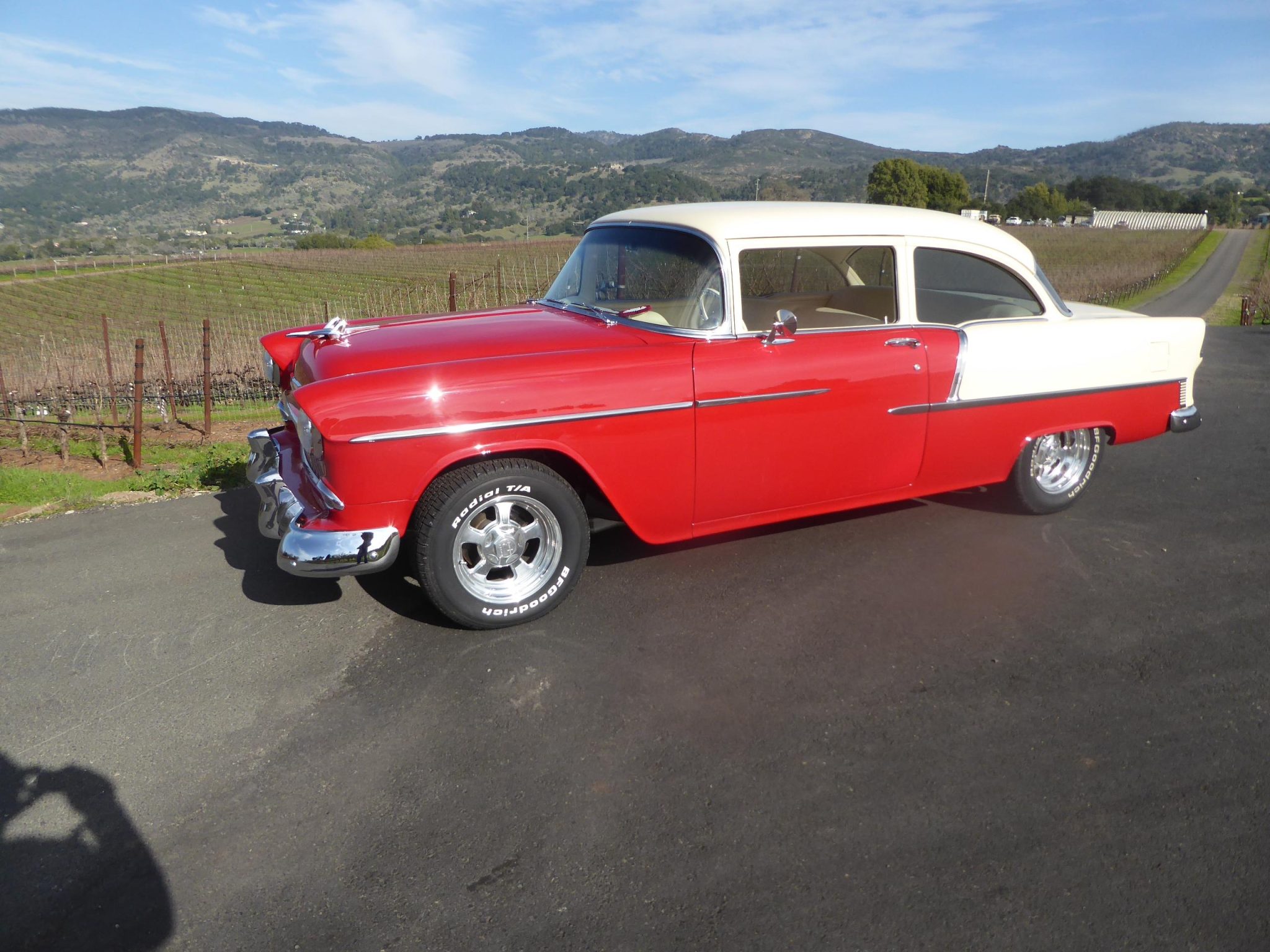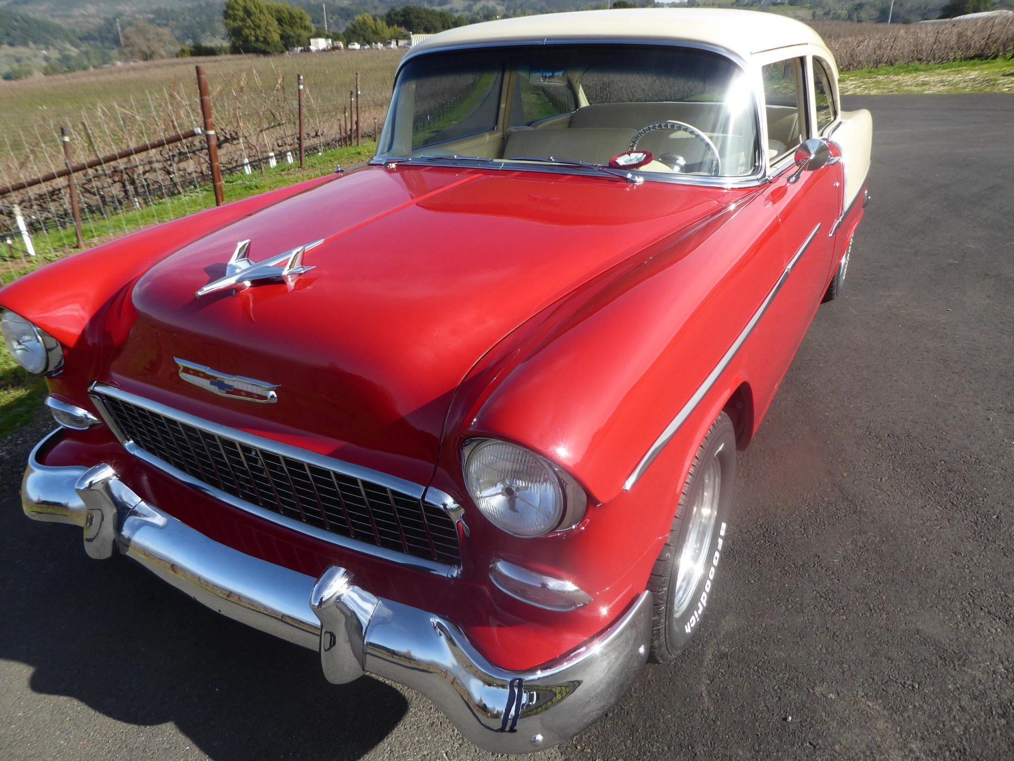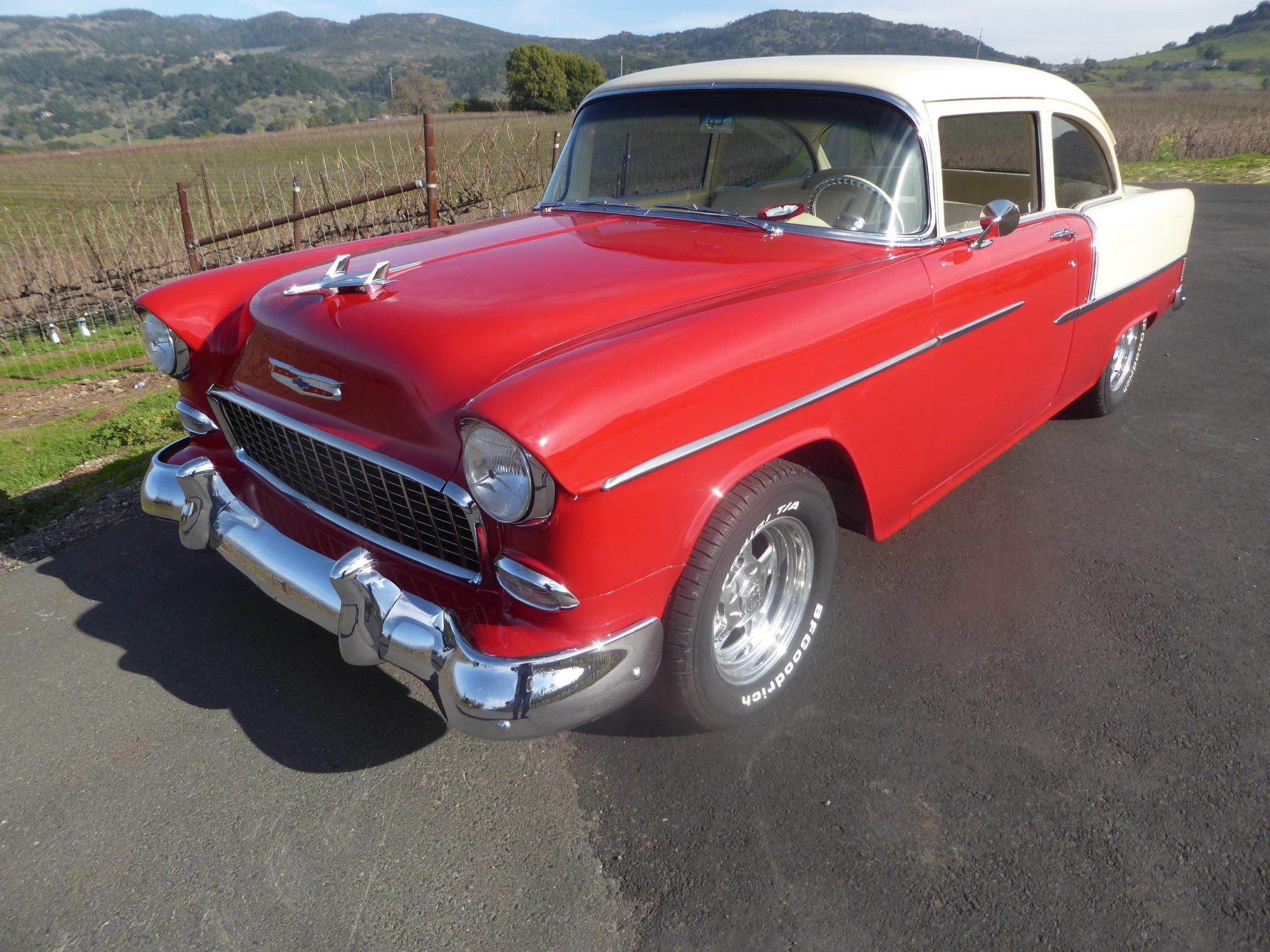 The 15″ Billet Specialties five-spoke wheels are mounted with BFGoodrich Radial T/A white-letter tires. The chassis was repainted black and the suspension and brakes were overhauled as part of the build. The car rides on a lowered suspension and is equipped with power steering, while braking is handled by power-assisted four-wheel ventilated discs.