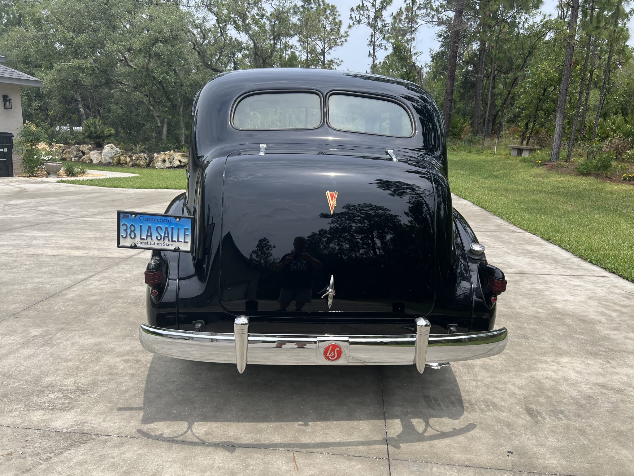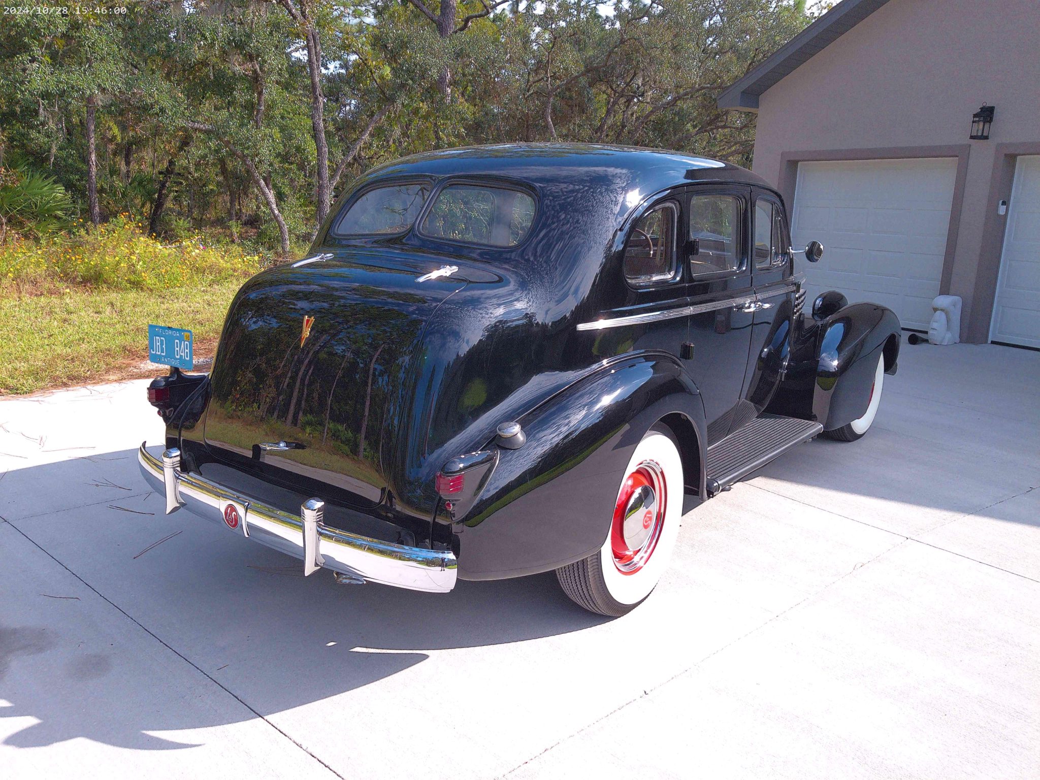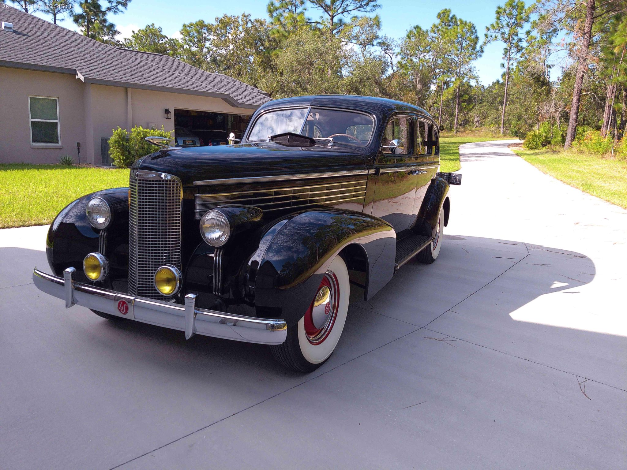 The steel wheels were refinished in red in 2024, and they wear chrome LaSalle-branded hubcaps and 7.00–16 Firestone wide whitewall bias-ply tires. The Series 50 rode on a 124″ wheelbase and features a coil-sprung independent front suspension along with a live rear axle and leaf springs that were disassembled, sandblasted, and repainted during the refurbishment. Stopping power is provided by four-wheel hydraulic drums that were overhauled during the project and serviced in preparation for the sale.