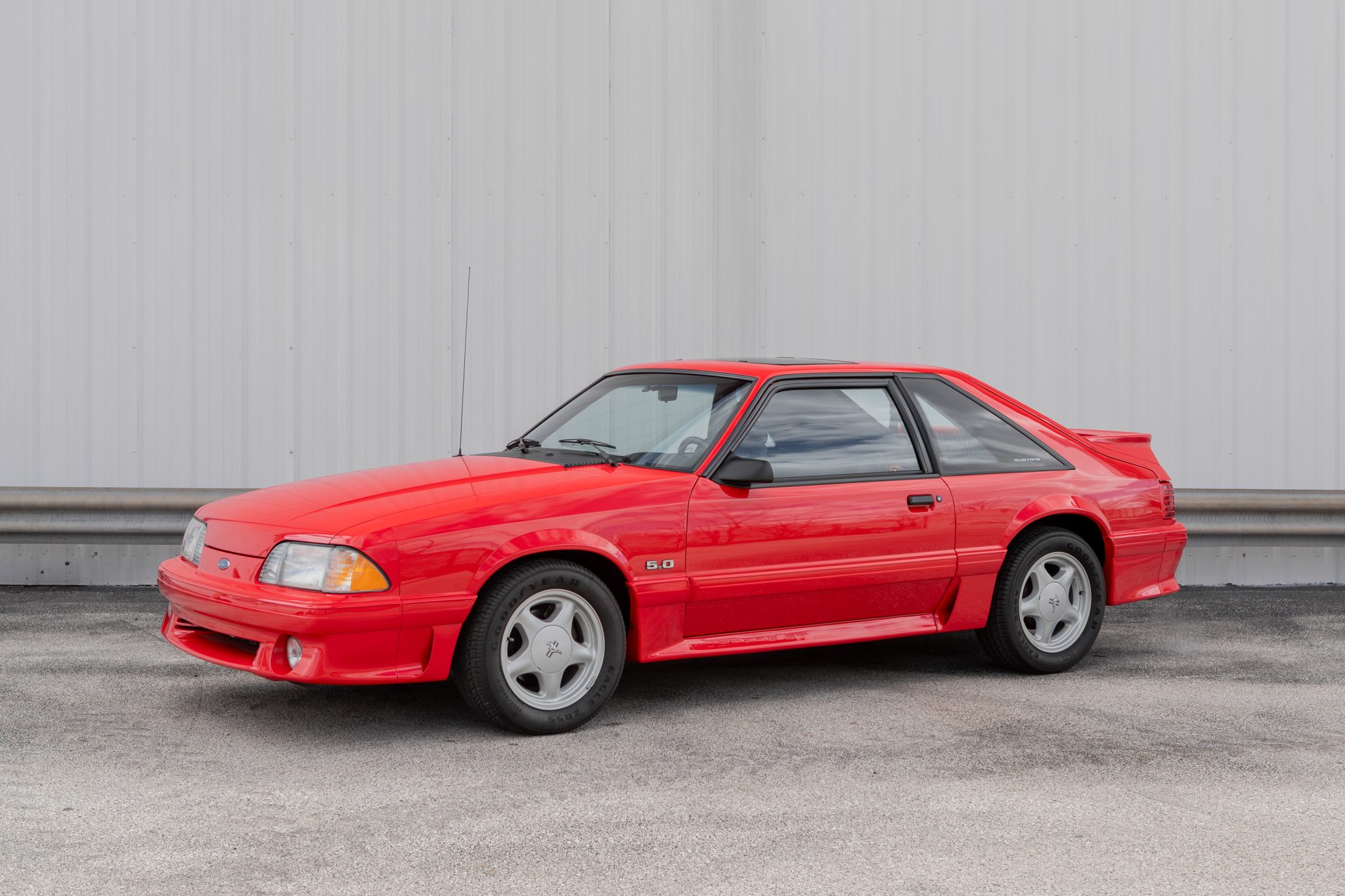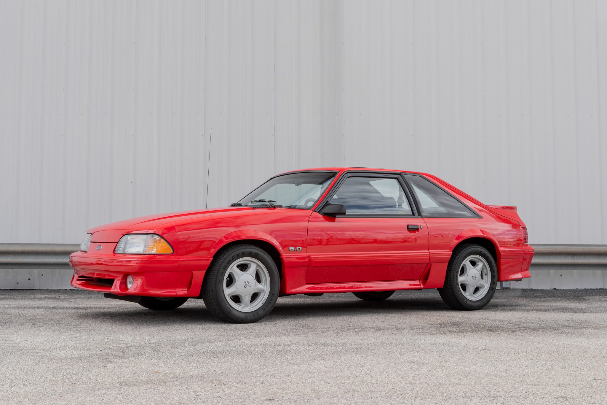 The 16″ Pony alloy wheels are mounted with Goodyear Eagle ZR55 tires. Standard equipment included a Handling Suspension Package featuring variable-rate springs and a Quadra-Shock rear setup along with power-assisted rack-and-pinion steering. Braking is handled by power-assisted front discs and rear drums.