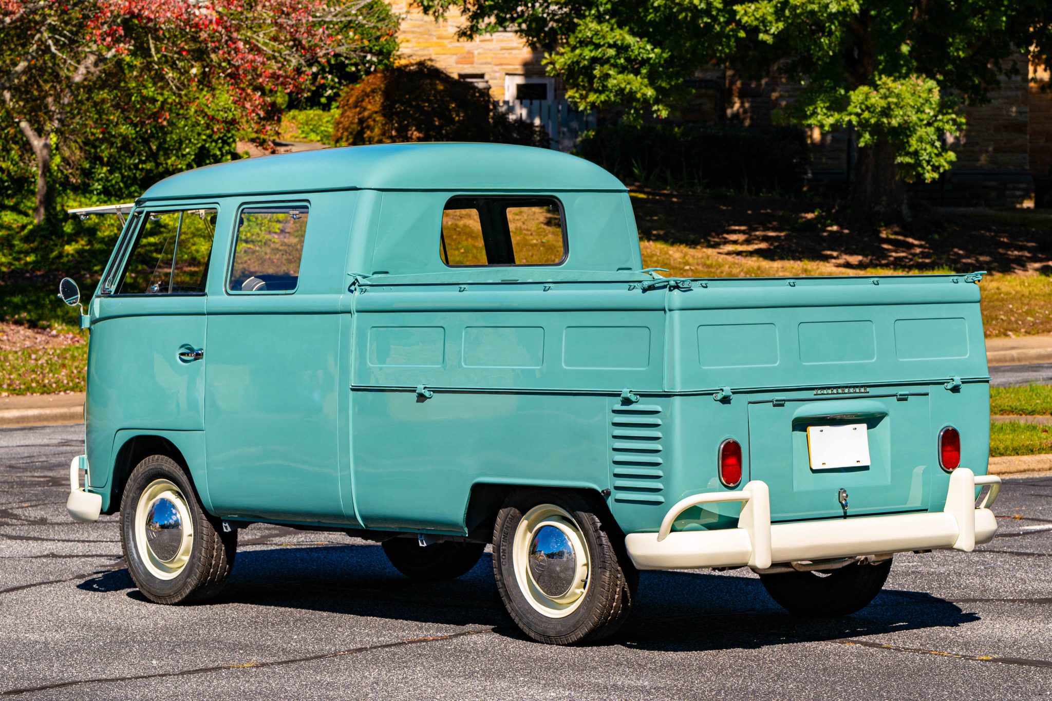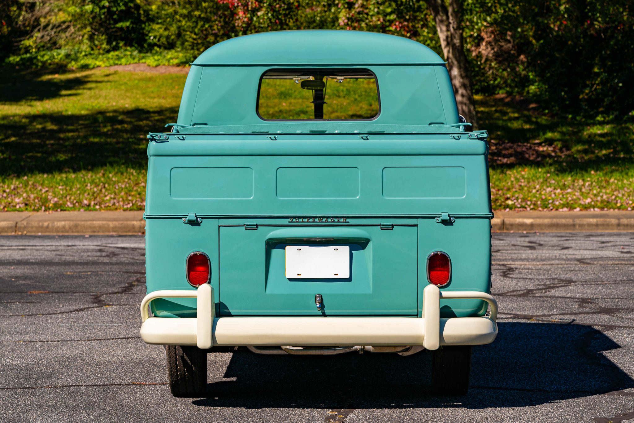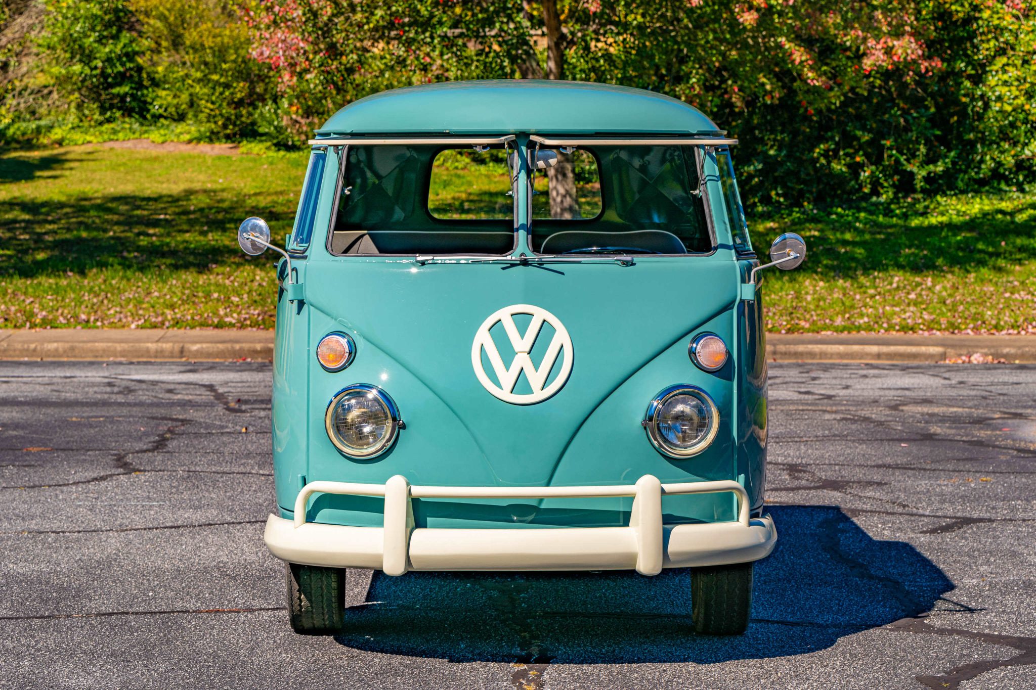 The 15″ cream-painted steel wheels wear VW-branded hubcaps and are mounted with 195/70 Continental VancoFourSeason tires. Front disc brakes and a rack-and-pinion steering system from Creative Engineering were installed during the refurbishment and the front crossbeam was refinished.
