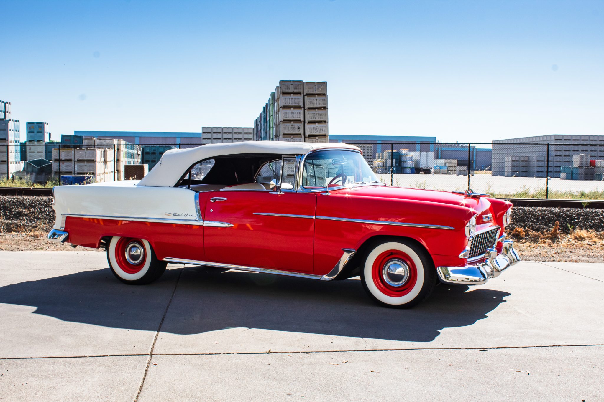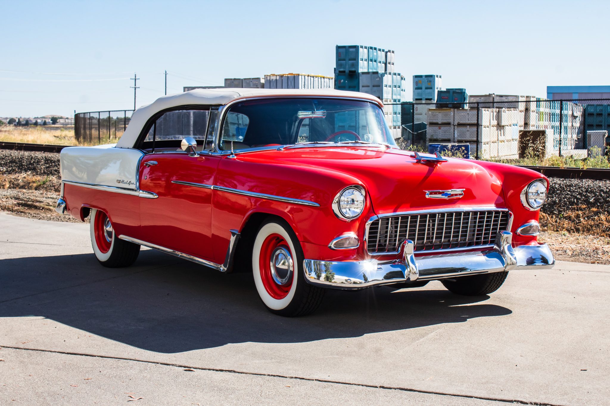 Red-finished 15″ steel wheels wear chrome hubcaps and are mounted with BFGoodrich Silvertown Radial wide whitewall tires measuring 215/70 in front and 245/65 out back. The car rides on adjustable front coilovers and tubular upper and lower control arms, and a sway bar is fitted out back. Braking is provided by power-assisted discs at each corner.