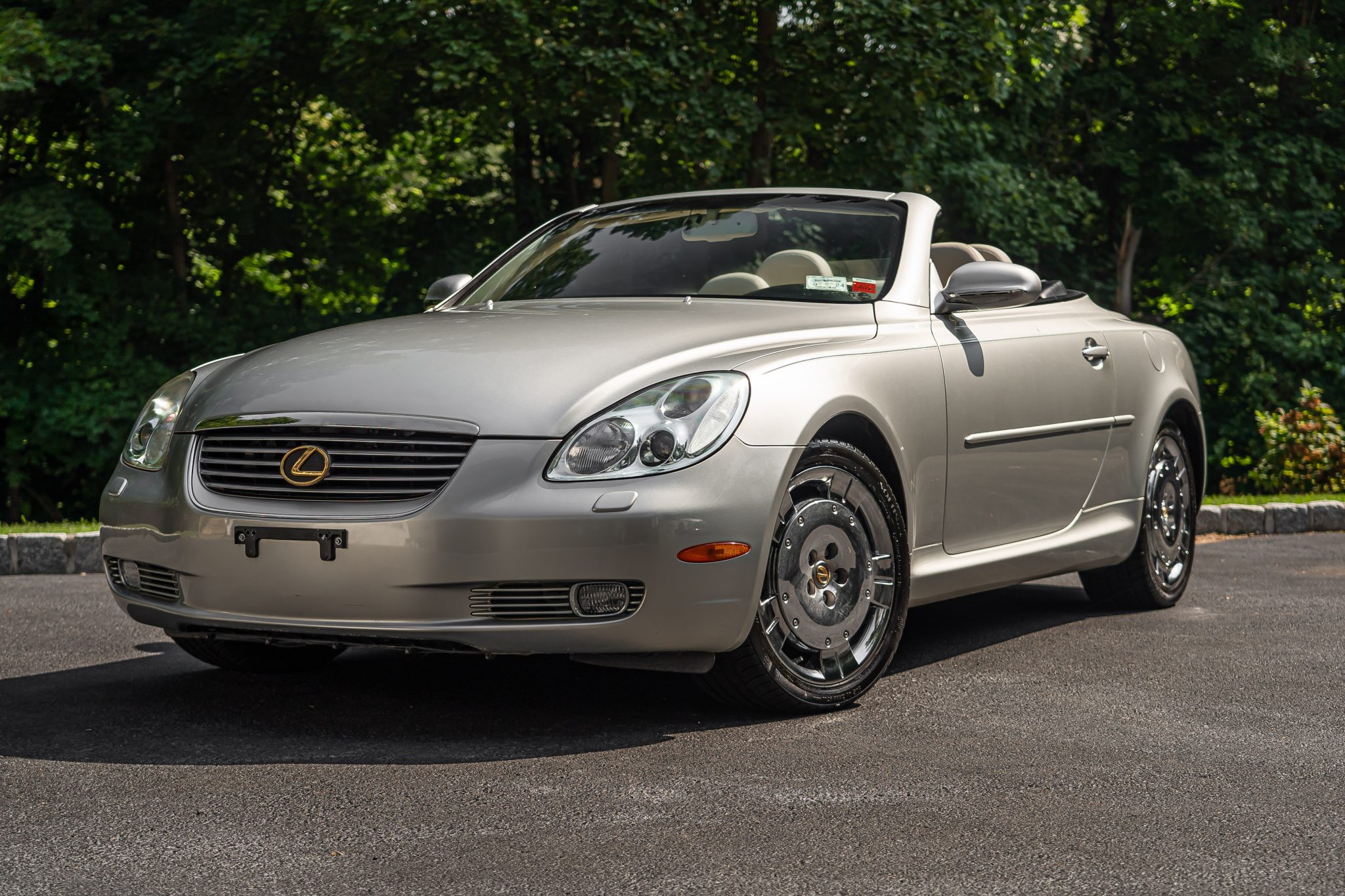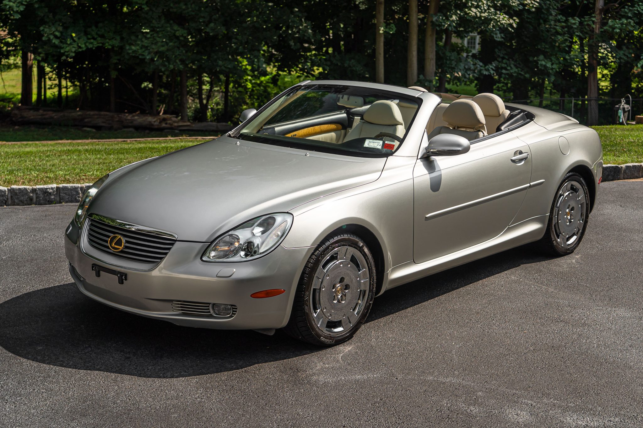 Chrome 18″ dish-style five-spoke alloy wheels are mounted with Kumho tires. The car is equipped with traction control and four-wheel independent double-wishbone suspension, and braking is handled by four-wheel disc brakes with ventilated front rotors. Curb damage and pitting in the finish are visible on the wheels.