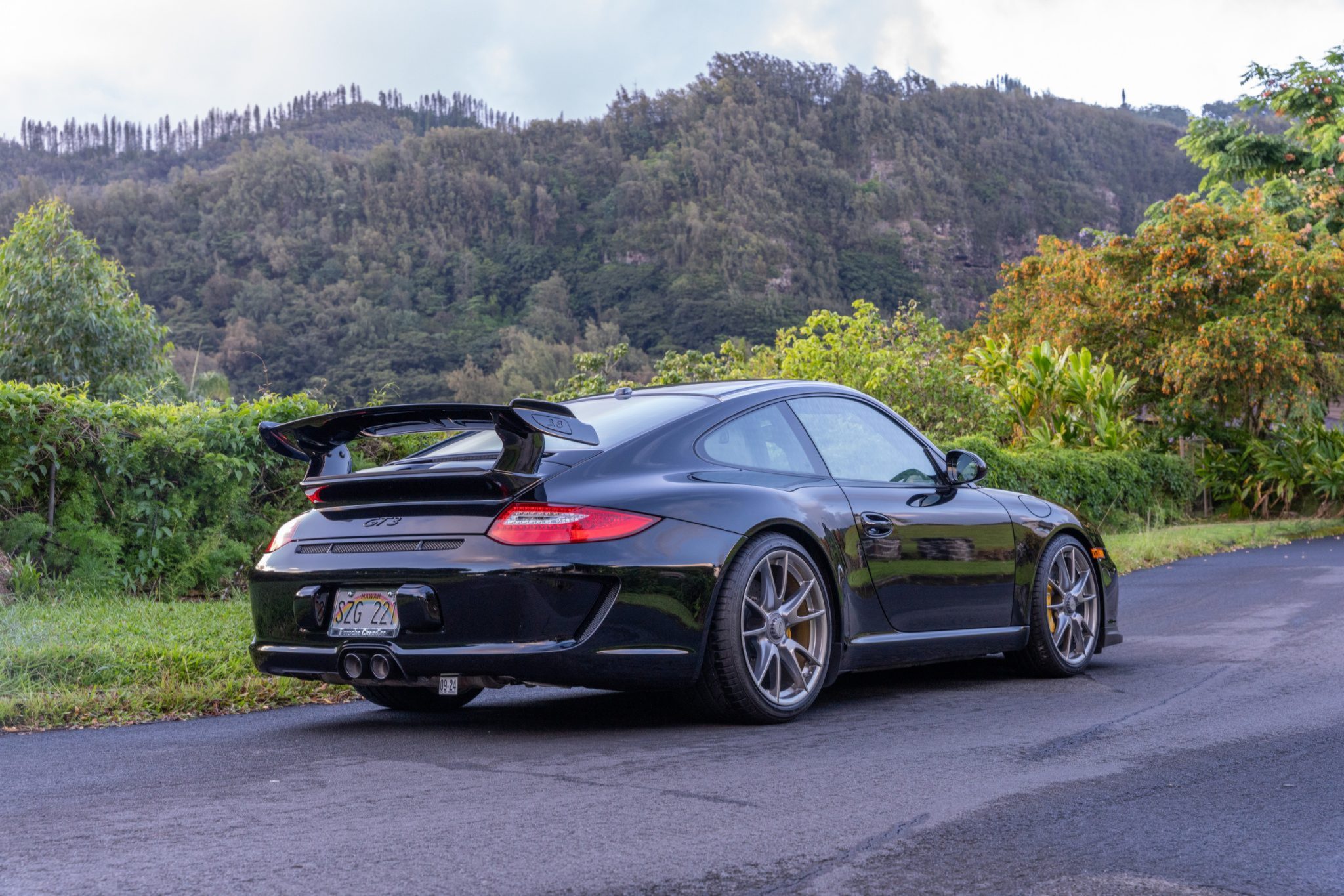 Titanium-finished 19″ GT3 wheels are mounted with Bridgestone Potenza tires measuring 235/35 in the front and 305/30 in the rear. The optional Porsche Ceramic Composite Brakes (PCCB) have yellow calipers, and the GT3 was factory equipped with a McPherson strut front suspension, a multi-link rear suspension, front and rear stabilizer bars, and Porsche Active Suspension Management (PASM) featuring adjustable coilovers.