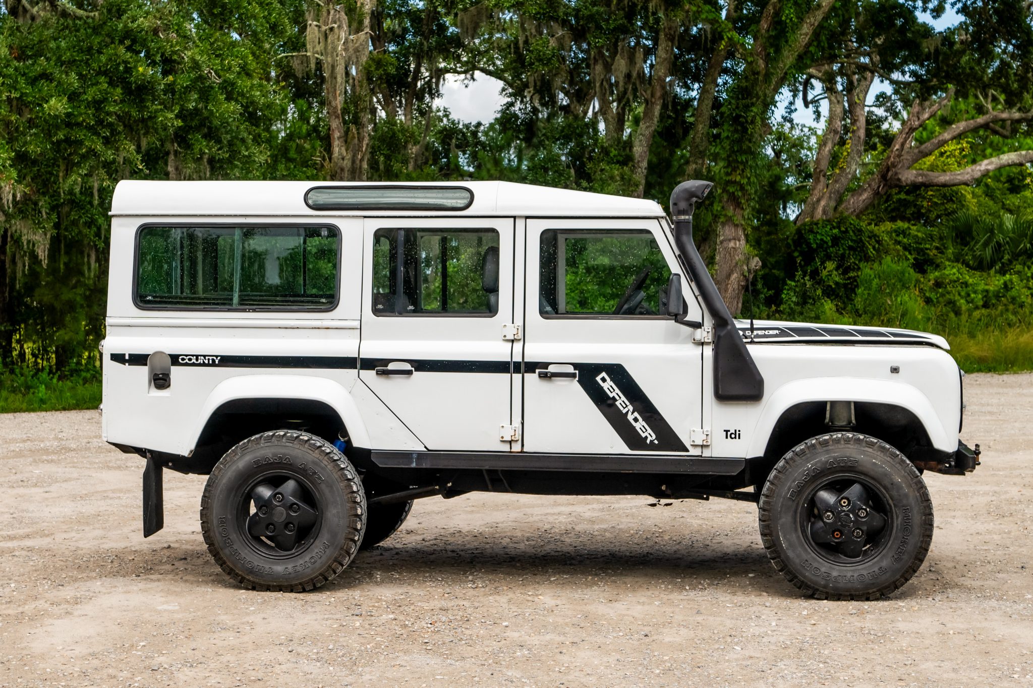 Black 16″ five-spoke alloy wheels are mounted with older 285/75 Mickey Thompson Baja ATZ tires. The truck is equipped with a Terrafirma steering stabilizer, springs, and shock absorbers, and braking is handled by discs at each corner. The condition of the wheels is depicted in the gallery.
