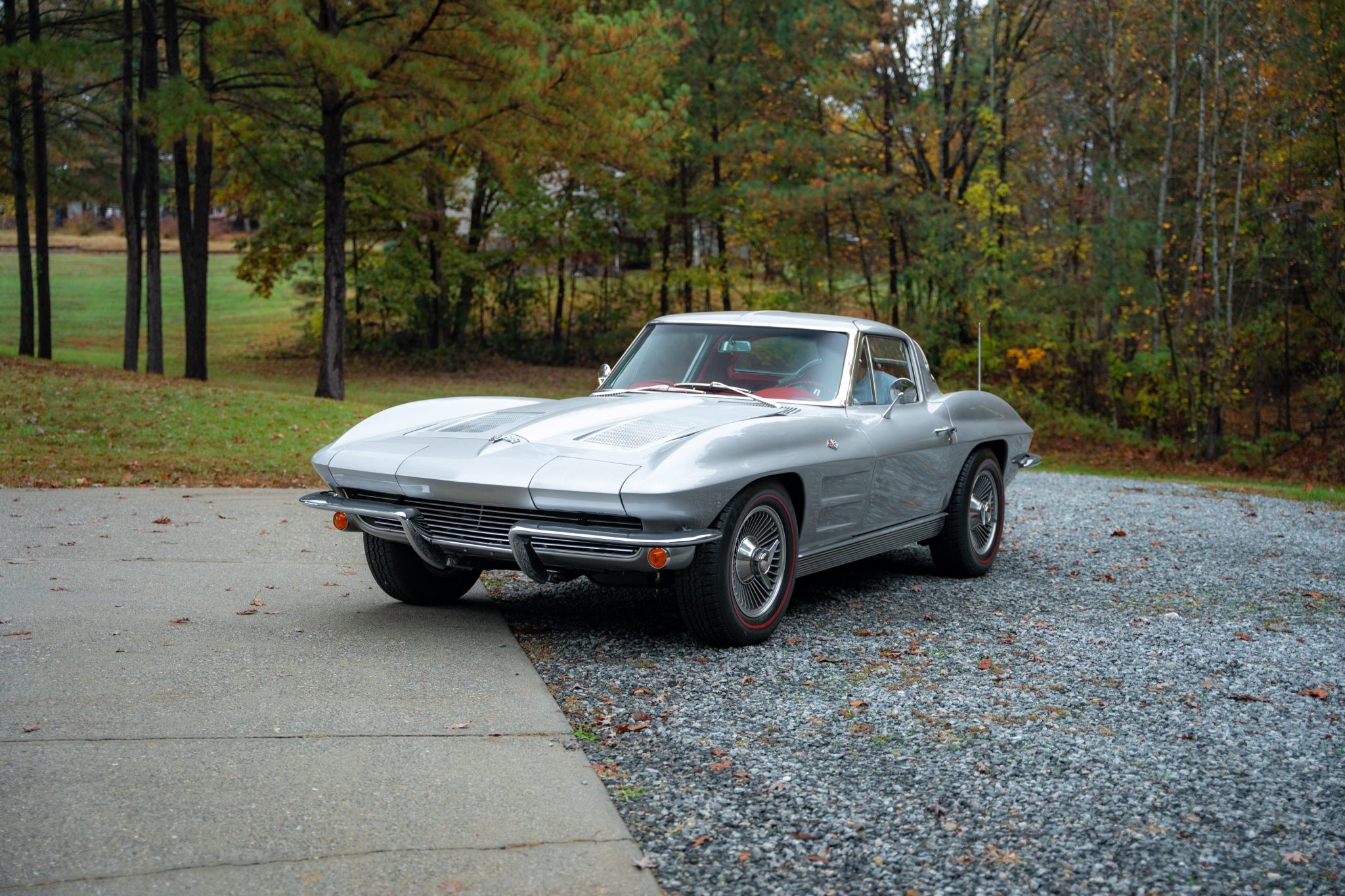 The 15″ turbine-style wheels wear three-eared knock-off spinners and are mounted with 205/70 BFGoodrich Silvertown Radial redline tires. The C2 was the first Corvette to offer fully independent suspension, with upper and lower control arms at the front and a three-link setup with a transverse leaf spring at the rear. The car is equipped with power steering, and braking is handled by power-assisted front disc brakes with rear drums.