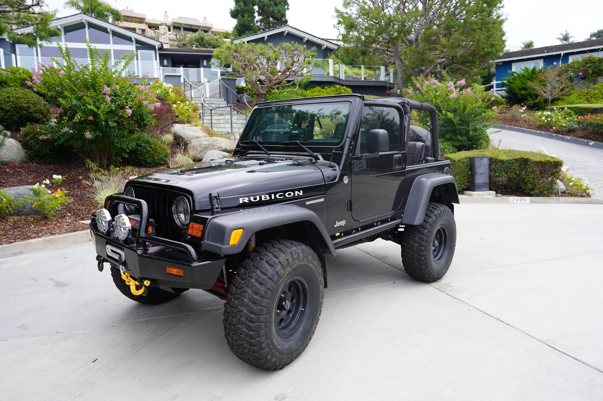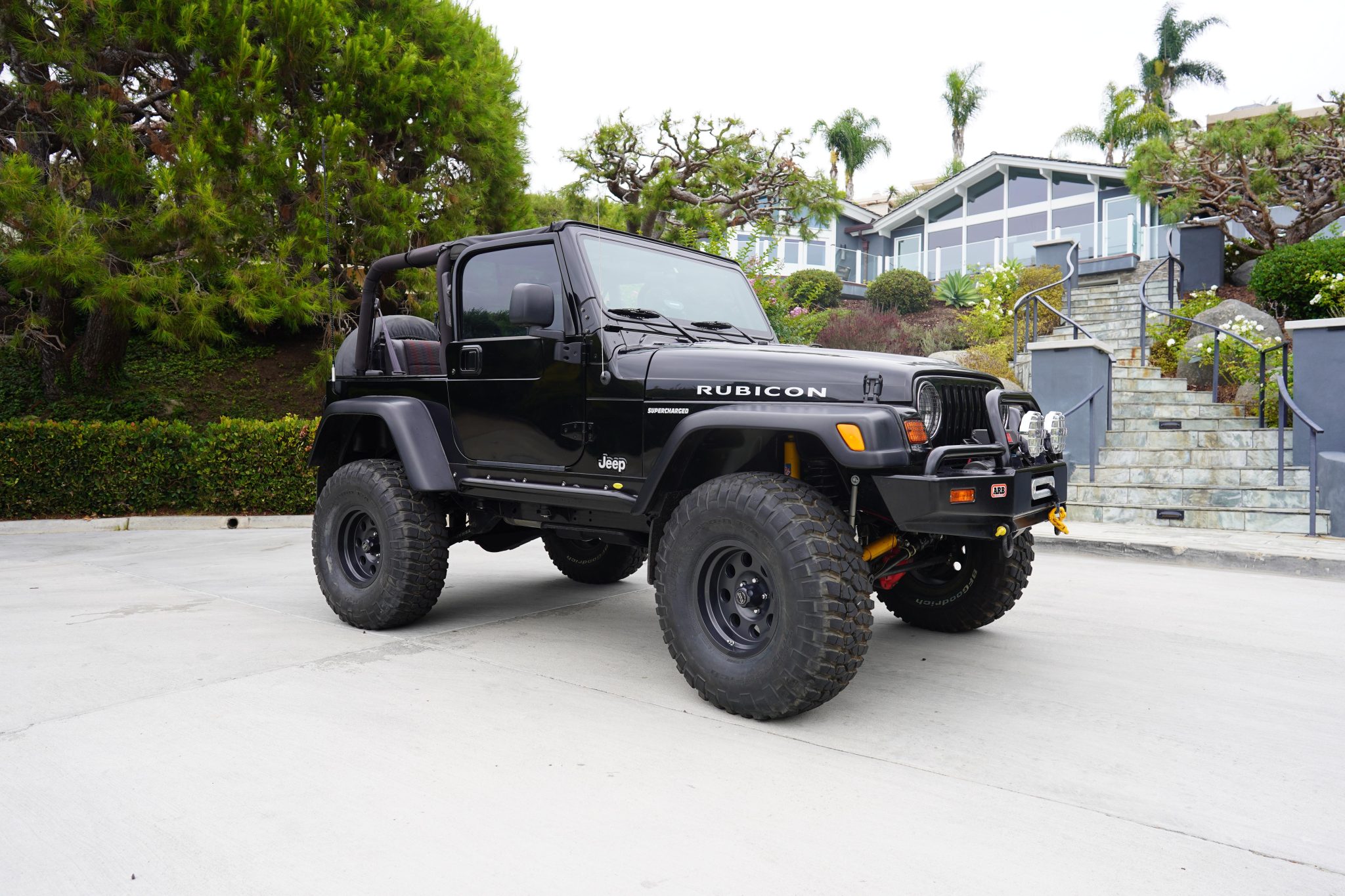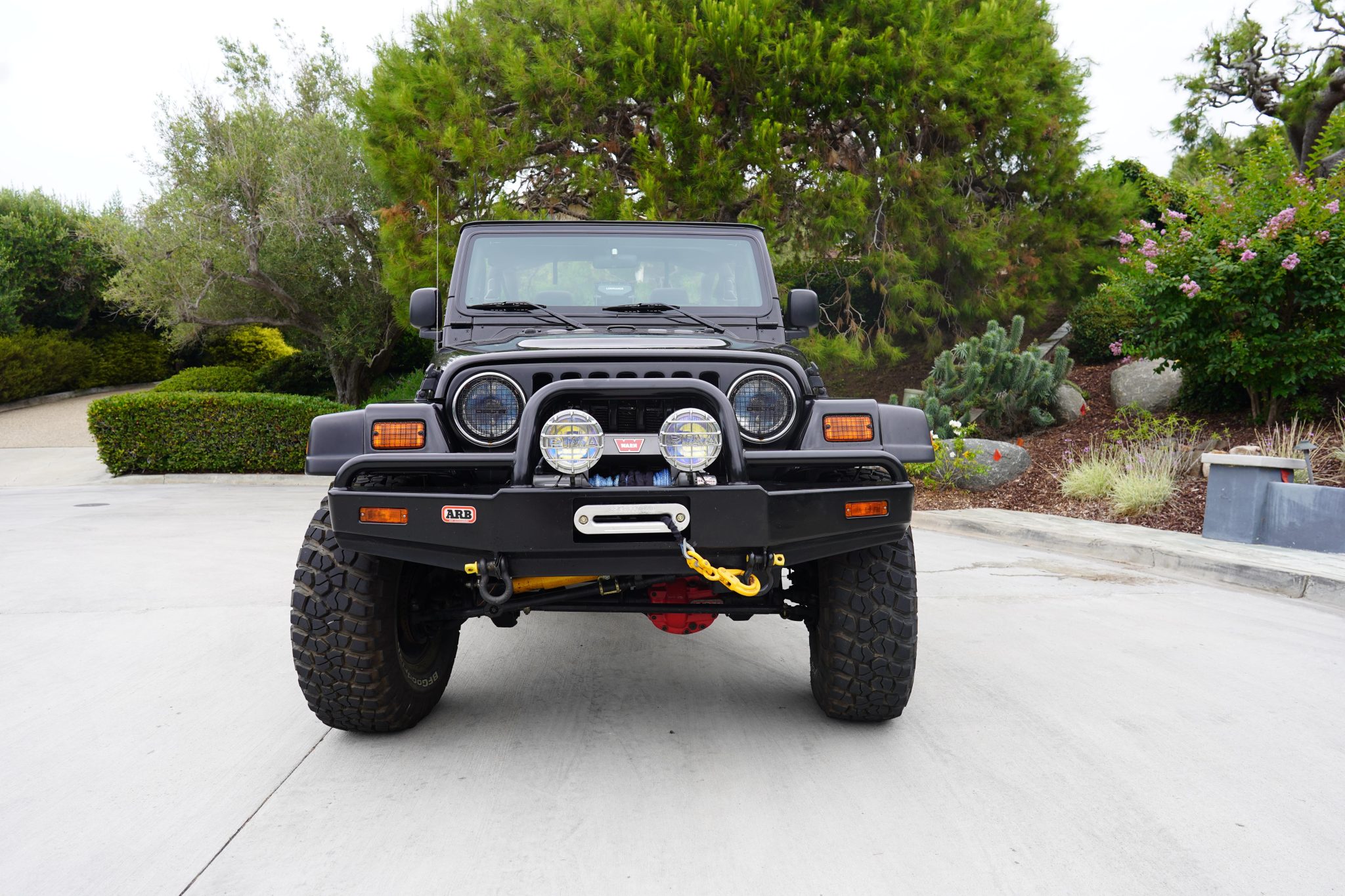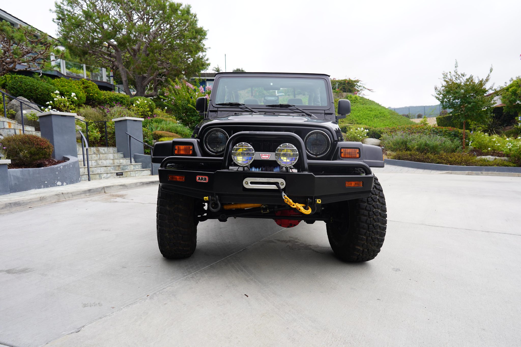 Black-finished 15″ aluminum American Racing wheels are fitted with 35×12.5″ BFGoodrich Mud-Terrain T/A KM2 tires, and a full-size spare is mounted to a swing-out rear carrier. A TeraFlex lift kit has been installed. Stopping power is provided by disc brakes at all four corners.